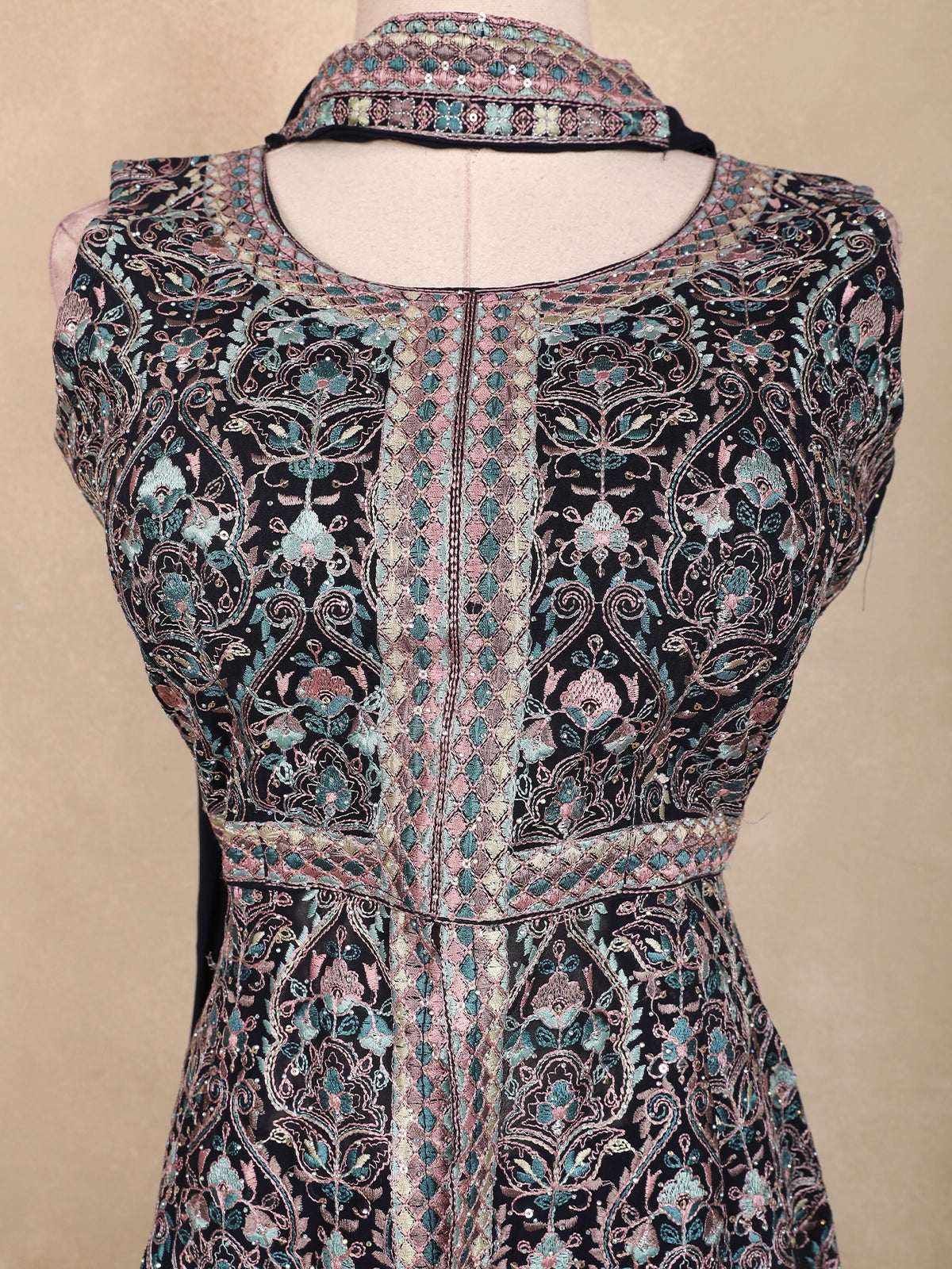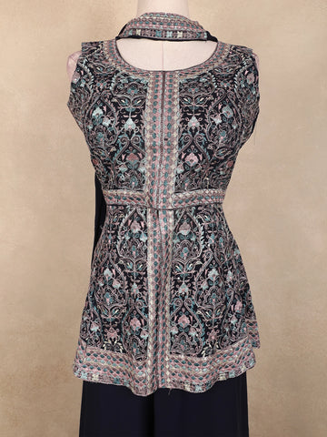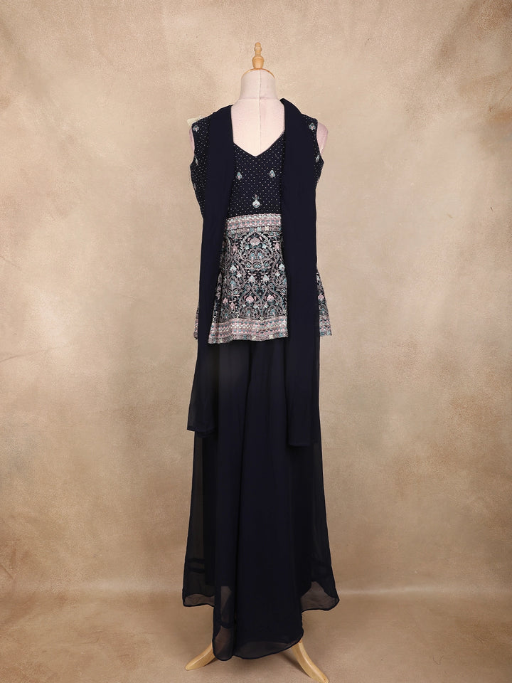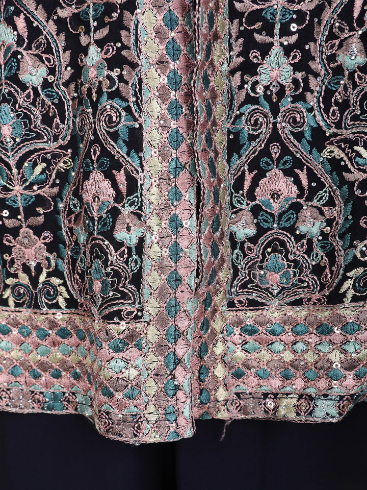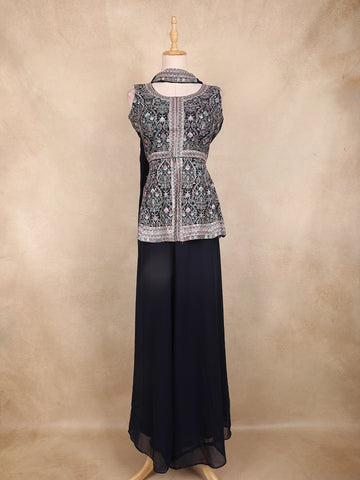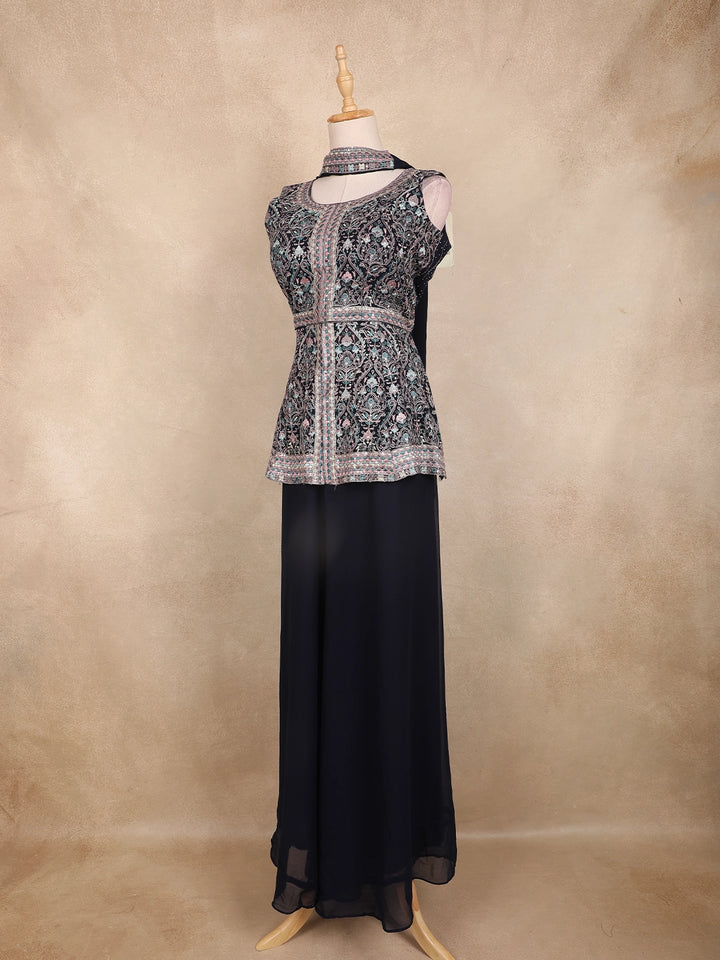 The richly detailed embroidery enhances the deep navy hue, while the soft georgette palazzo pants flow gracefully, offering effortless comfort and style. Ideal for wedding functions, festive evenings, and special celebrations, this attire captures the essence of modern elegance infused with traditional artistry.