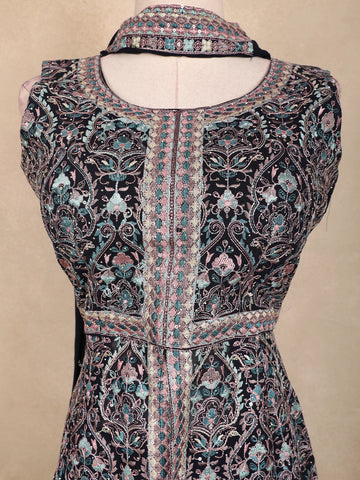 Radiate poise and sophistication with this Navy Blue Georgette Peplum Palazzo Suit, intricately adorned with teal and pastel pink floral zari embroidery. The sleeveless peplum top features a round neckline and is beautifully paired with a matching embroidered choker dupatta, giving the ensemble a regal and refined finish.
