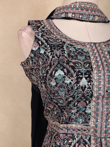 Navy Blue and Teal Floral Embroidered Georgette Peplum Palazzo Suit with Choker Dupatta