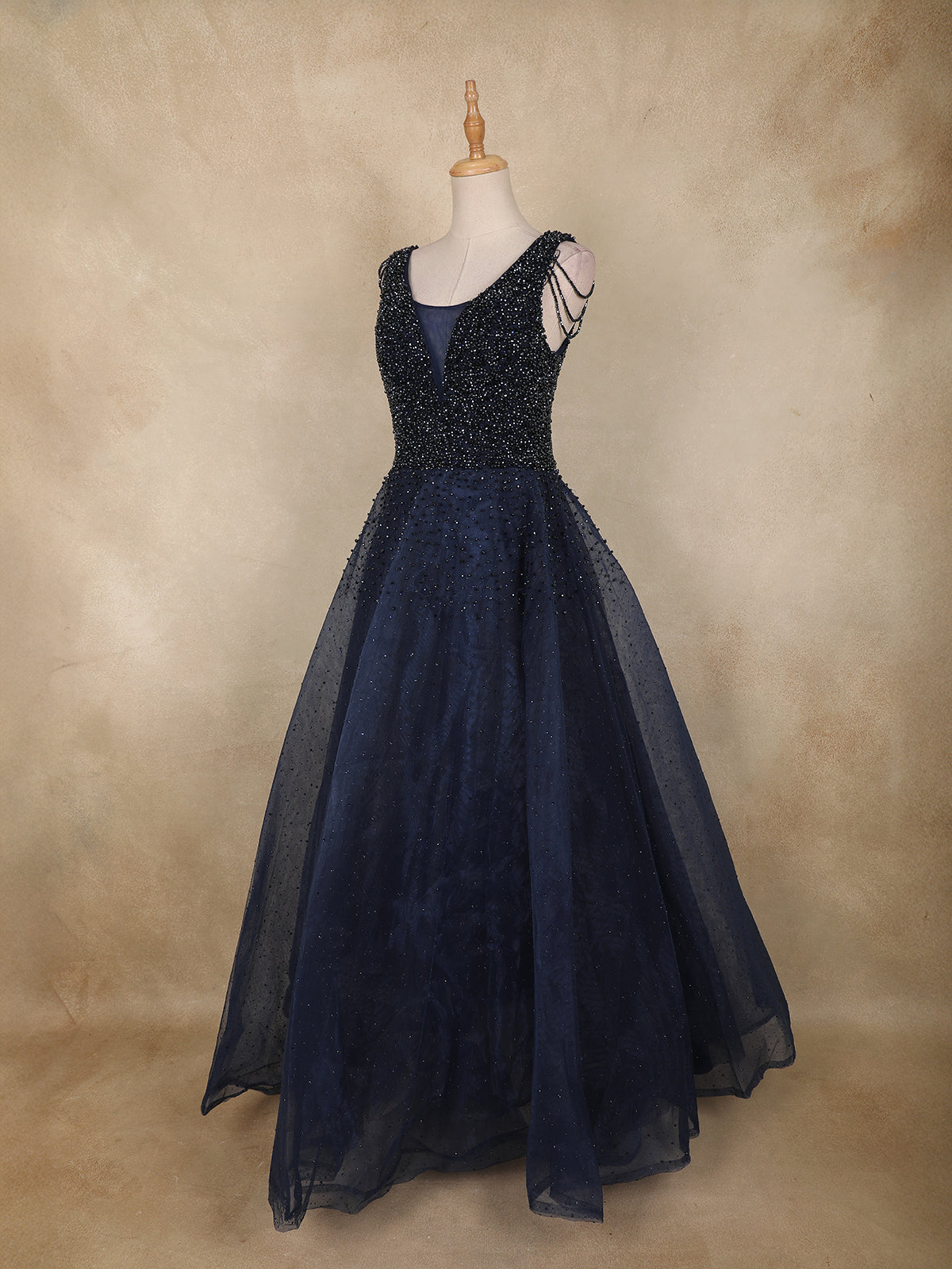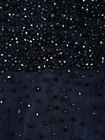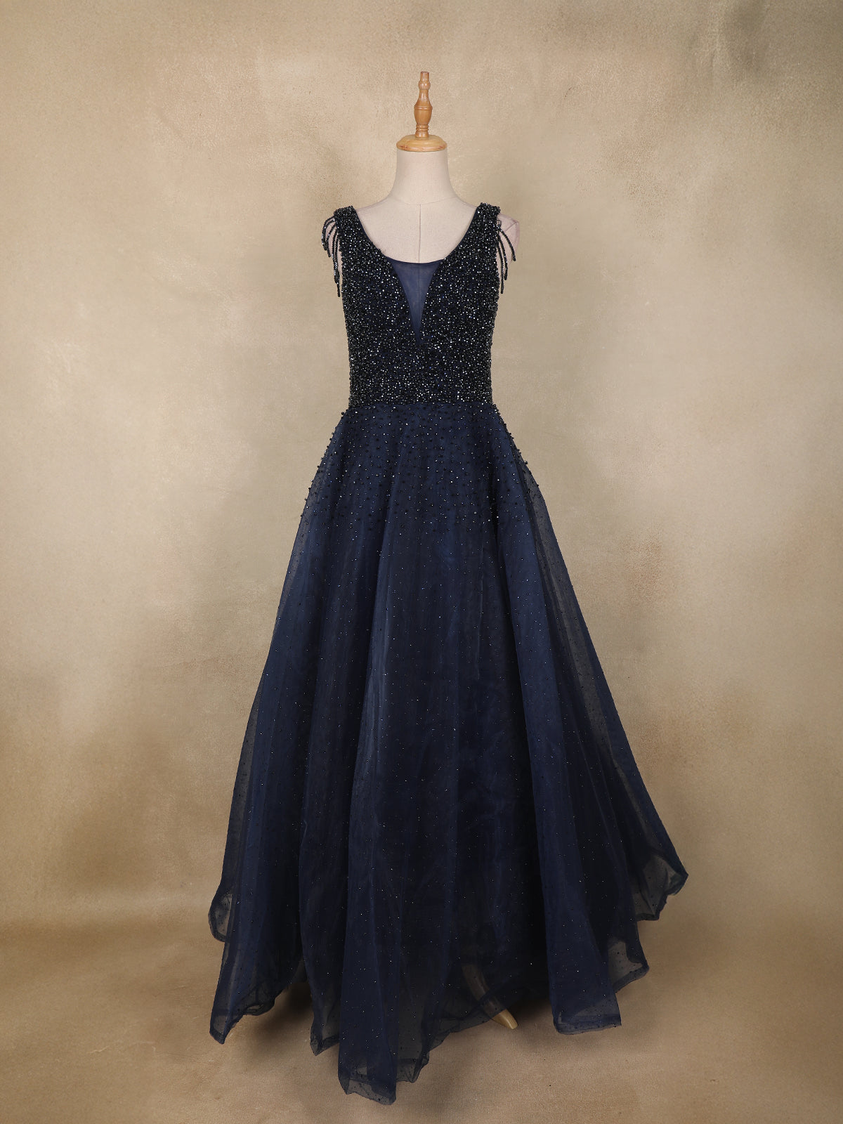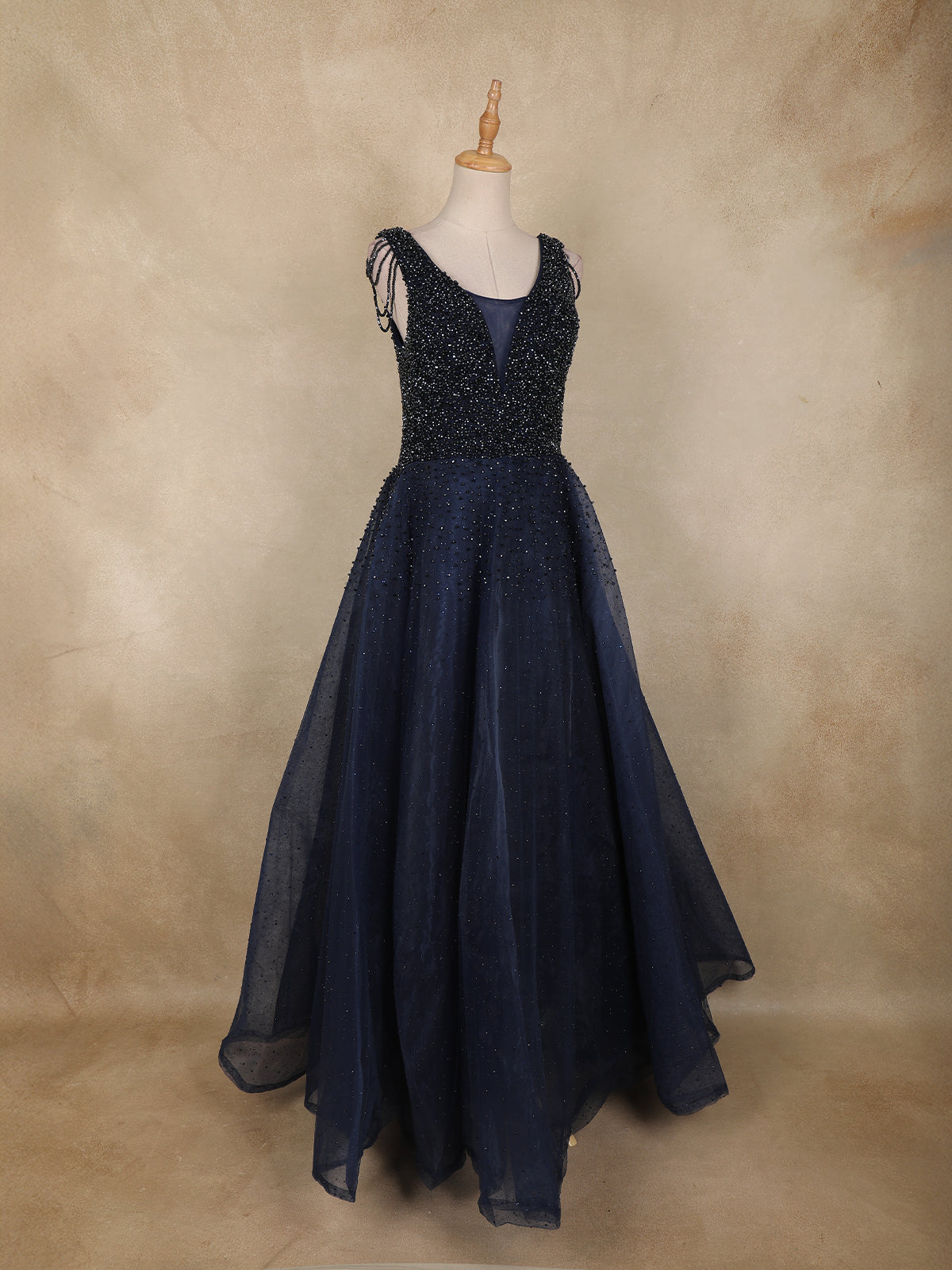 Embrace regal elegance with this breathtaking Navy Blue Beads Embellished Net Ball Gown, perfectly designed to make every entrance unforgettable. The hand-crafted beaded embellishments across the bodice bring a luxurious sparkle, ensuring you shine effortlessly under every spotlight.