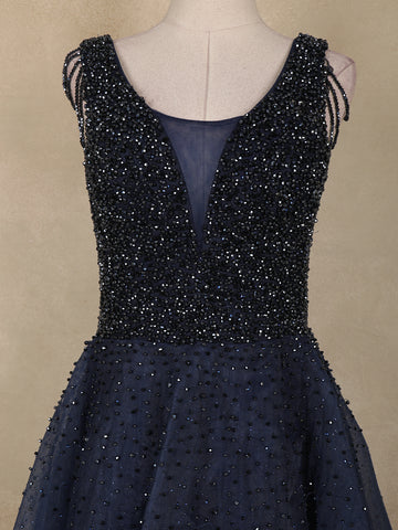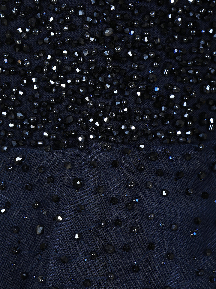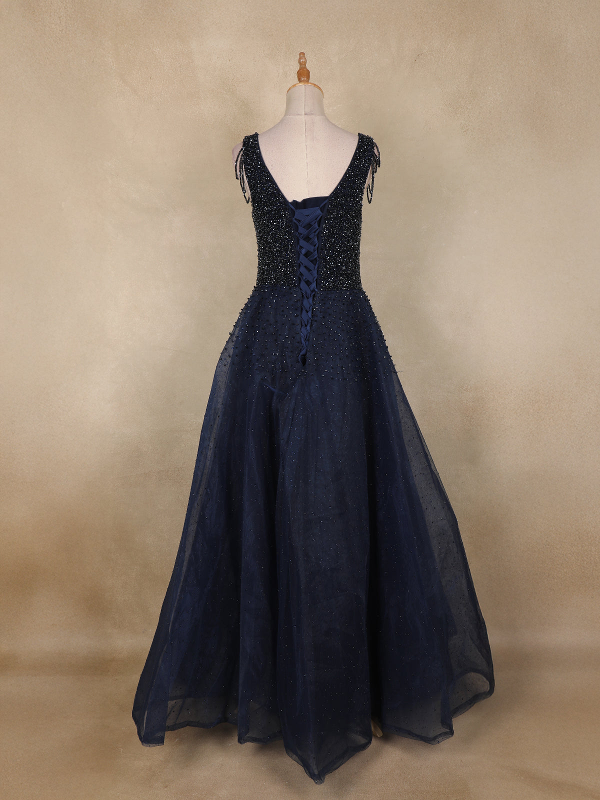 Navy Blue Beads Embellished Design Net Ball Gown with Sleeveless Shoulder Tassel Design