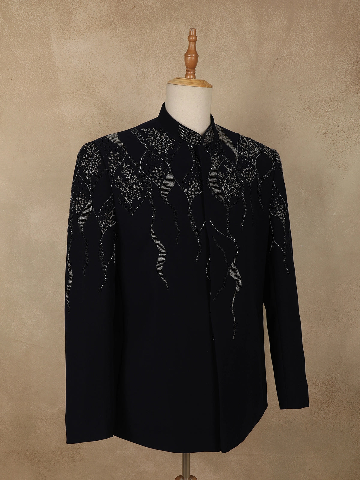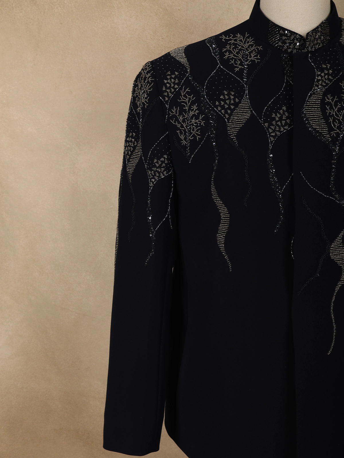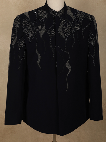 The suit is accentuated with delicate bead embroidery arranged in an abstract, flowing pattern across the upper body. The intricate beadwork adds dimension and a refined shimmer, enhancing the deep navy base without overpowering its classic appeal. This thoughtful placement creates a balanced look that is both artistic and sophisticated.