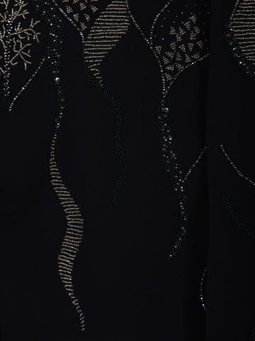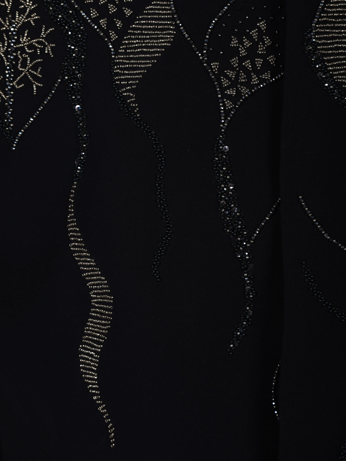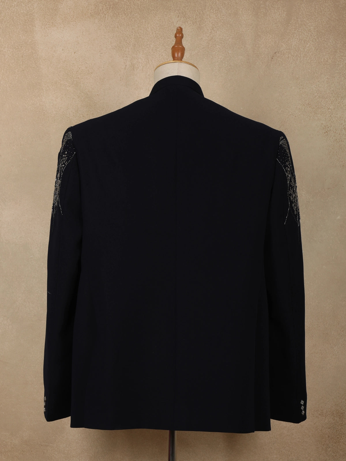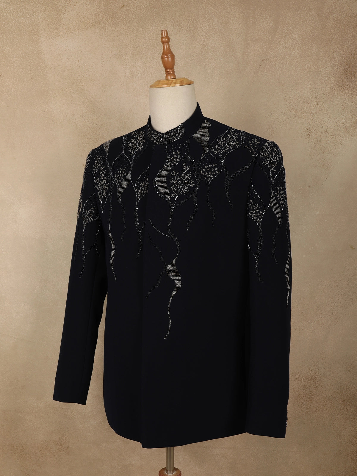 The suit is accentuated with delicate bead embroidery arranged in an abstract, flowing pattern across the upper body. The intricate beadwork adds dimension and a refined shimmer, enhancing the deep navy base without overpowering its classic appeal. This thoughtful placement creates a balanced look that is both artistic and sophisticated.