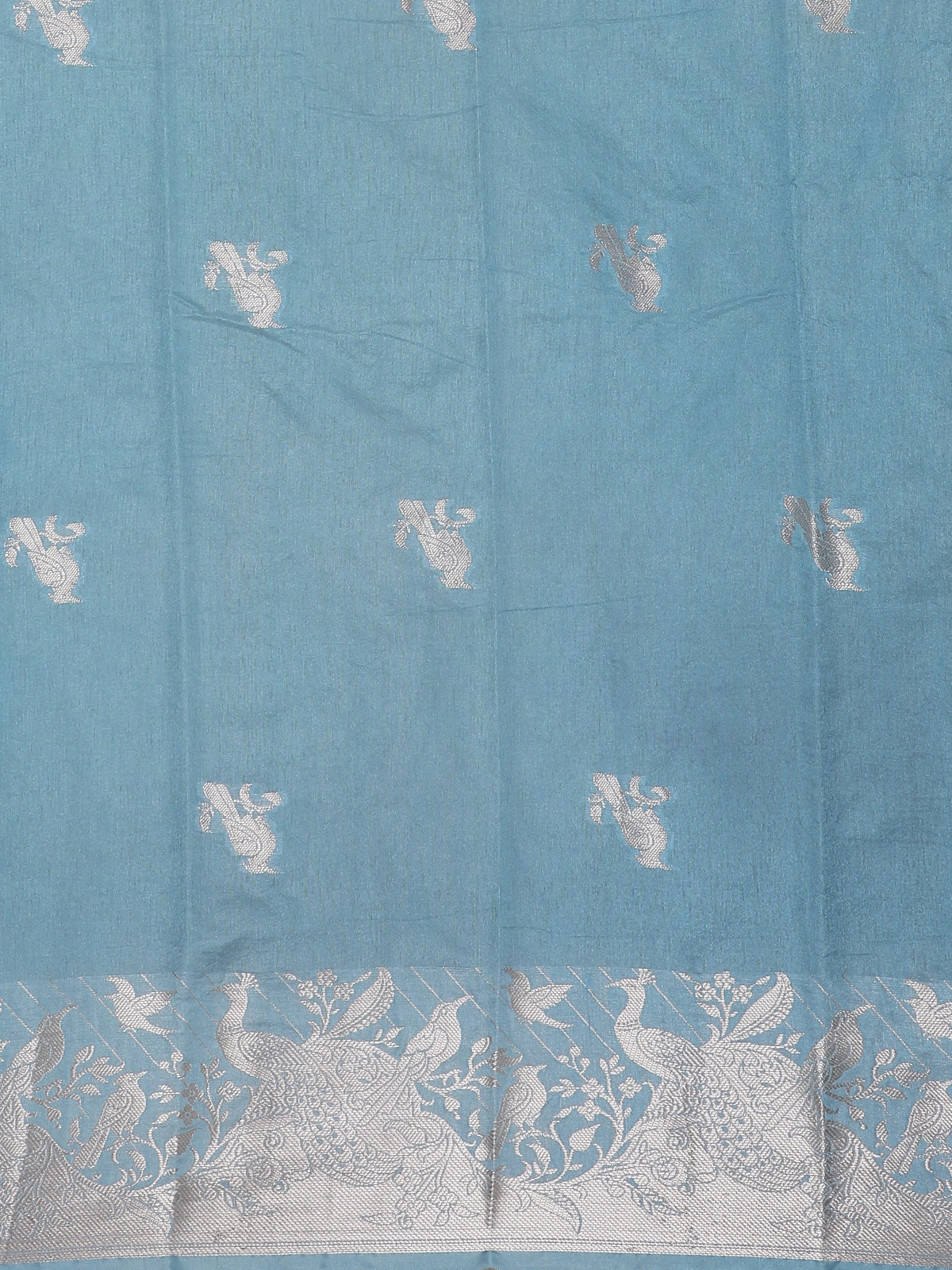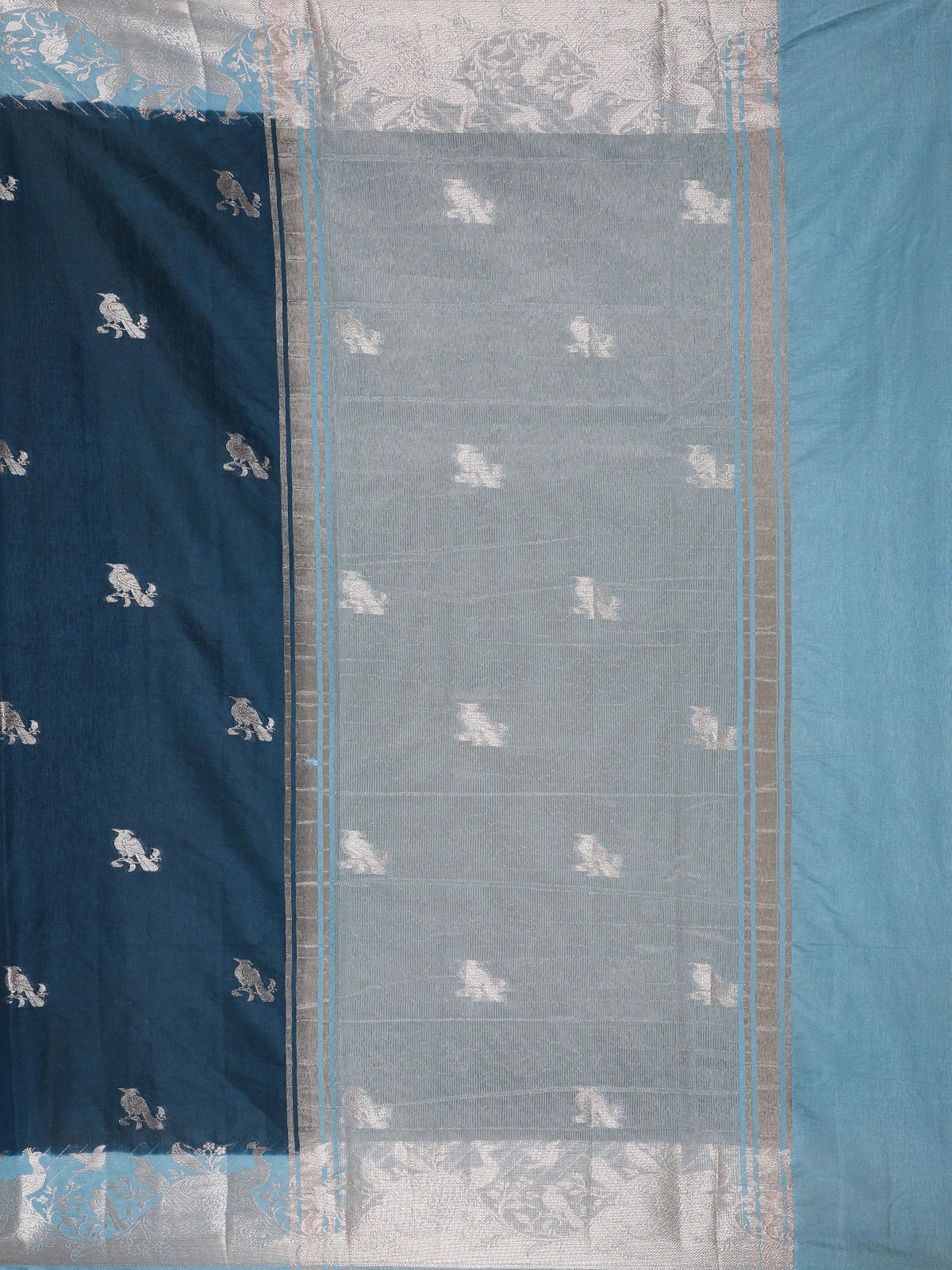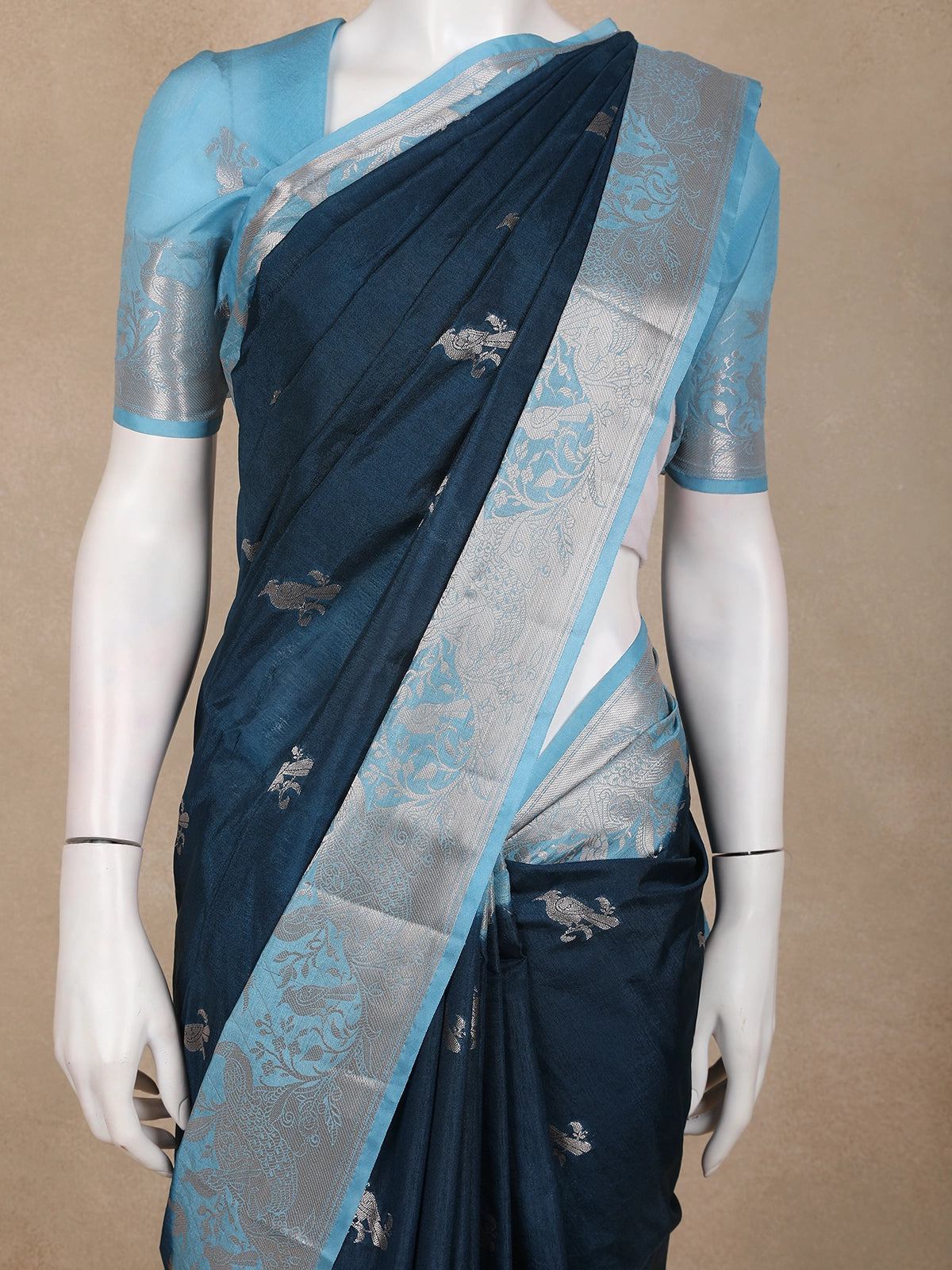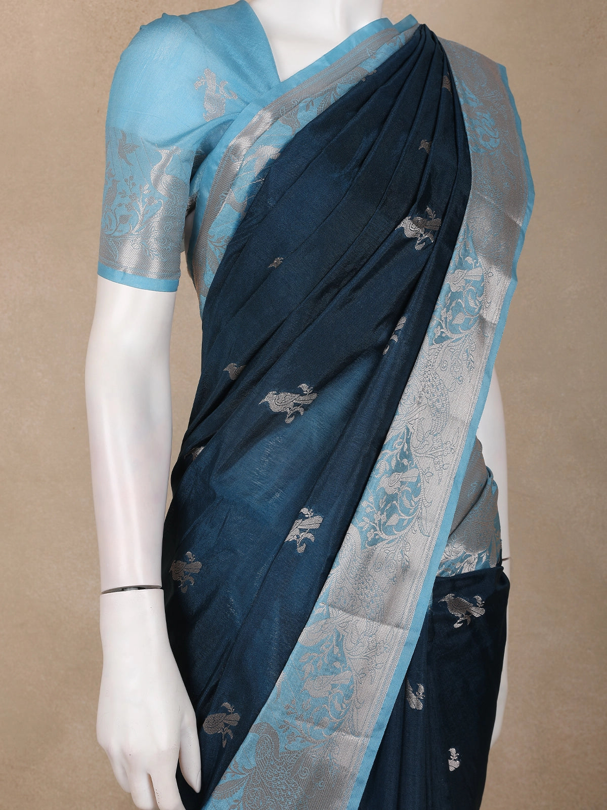 Navy Blue Birds Woven Raw Silk Saree with Contrast Sky Blue Zari Border