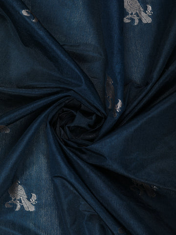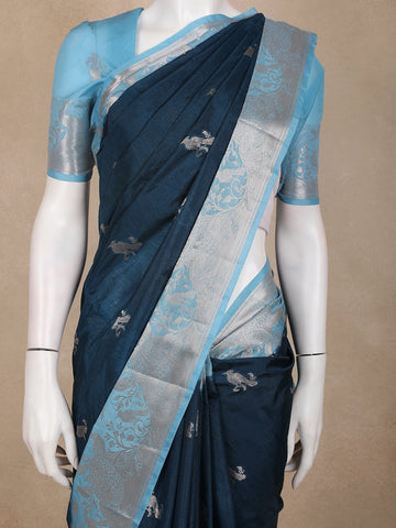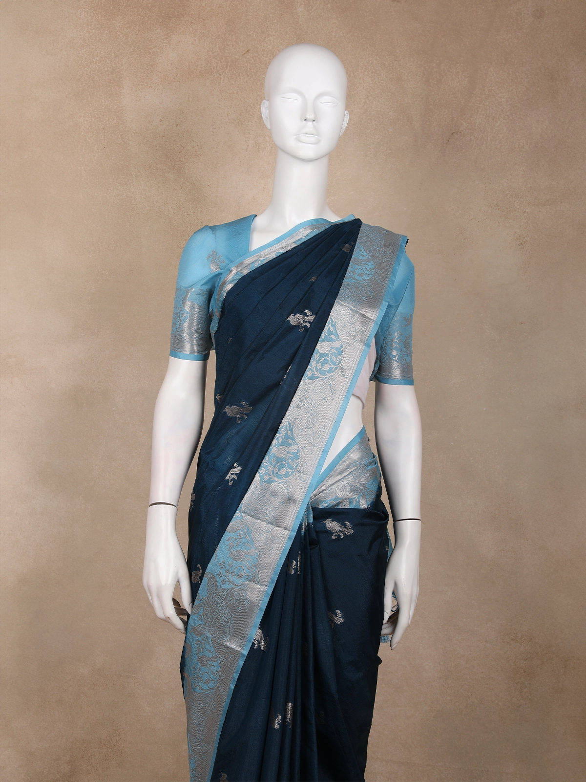 This graceful Navy Blue Raw Silk Saree is beautifully adorned with delicate silver zari bird woven motifs across the body, adding a subtle touch of elegance. The saree is highlighted with a Contrast Sky Blue Zari Border, featuring intricate peacock and floral patterns that enhance its traditional charm.
