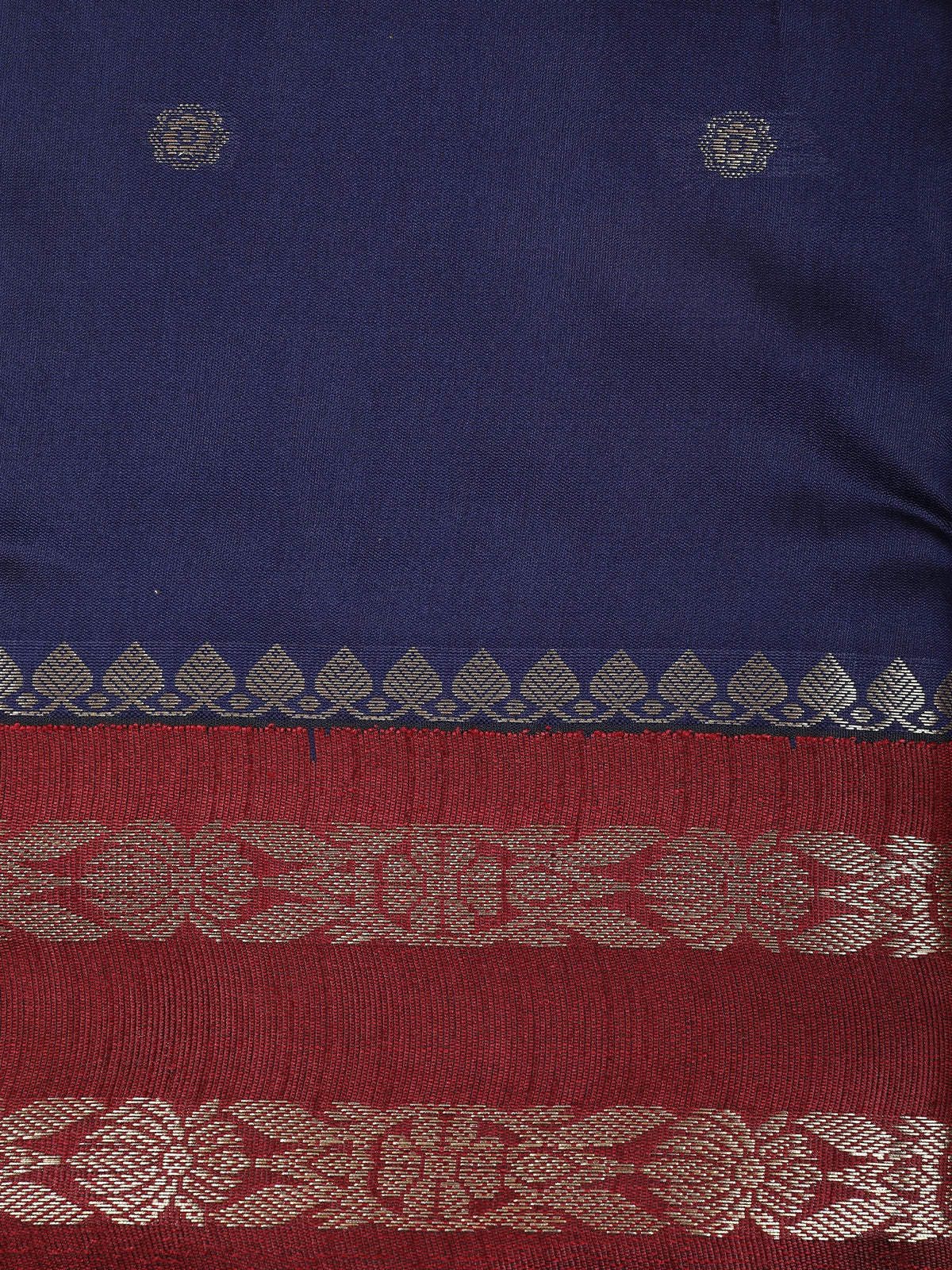 The saree is accentuated with a striking maroon contrast zari border, intricately woven with elegant floral and leaf patterns that create a graceful visual contrast against the dark green backdrop. The lustrous soft silk fabric offers a smooth texture and fluid drape, ensuring both comfort and sophistication throughout the day.