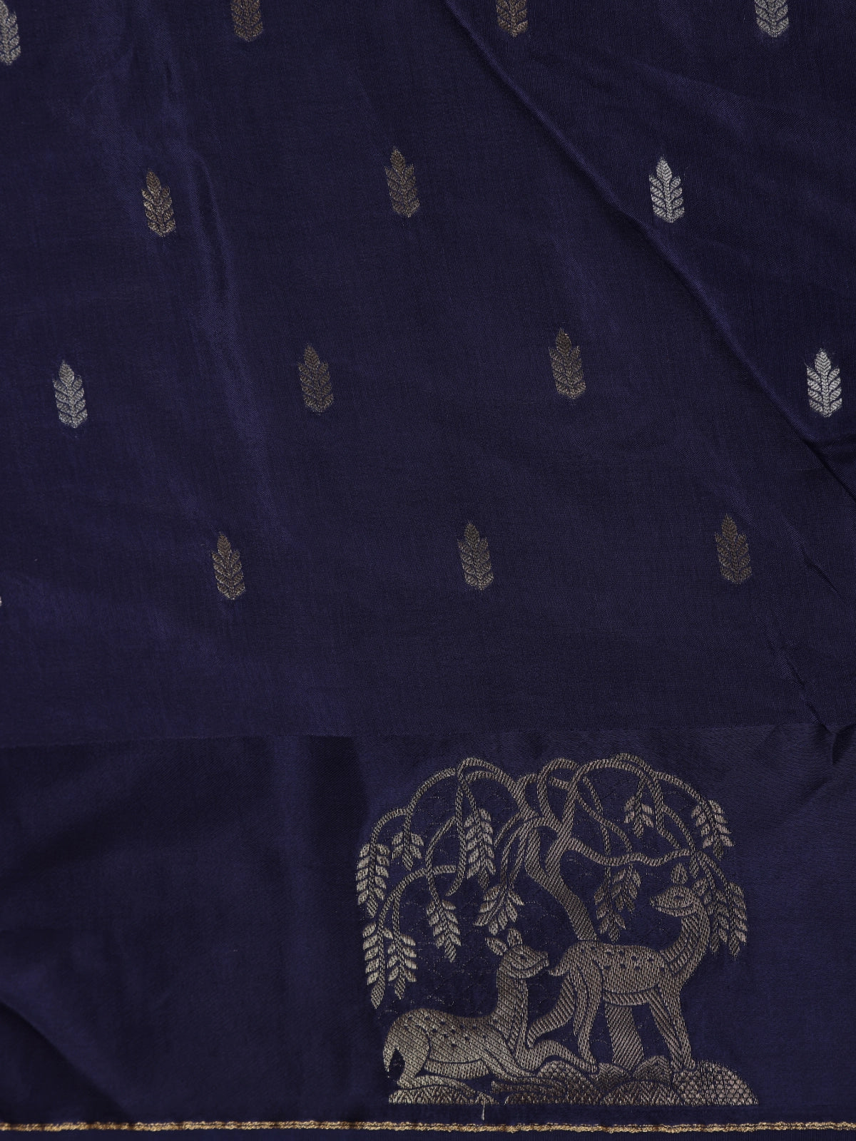 Elevate your ethnic elegance with this stunning navy blue Semi Banarasi saree, beautifully crafted to make every moment special. The saree features intricate butta woven detailing delicately scattered across the fabric, adding a graceful sheen and timeless charm. The true highlight lies in its exquisite border, adorned with majestic animal motifs woven in contrasting zari, lending a touch of regal artistry and cultural heritage to the ensemble.