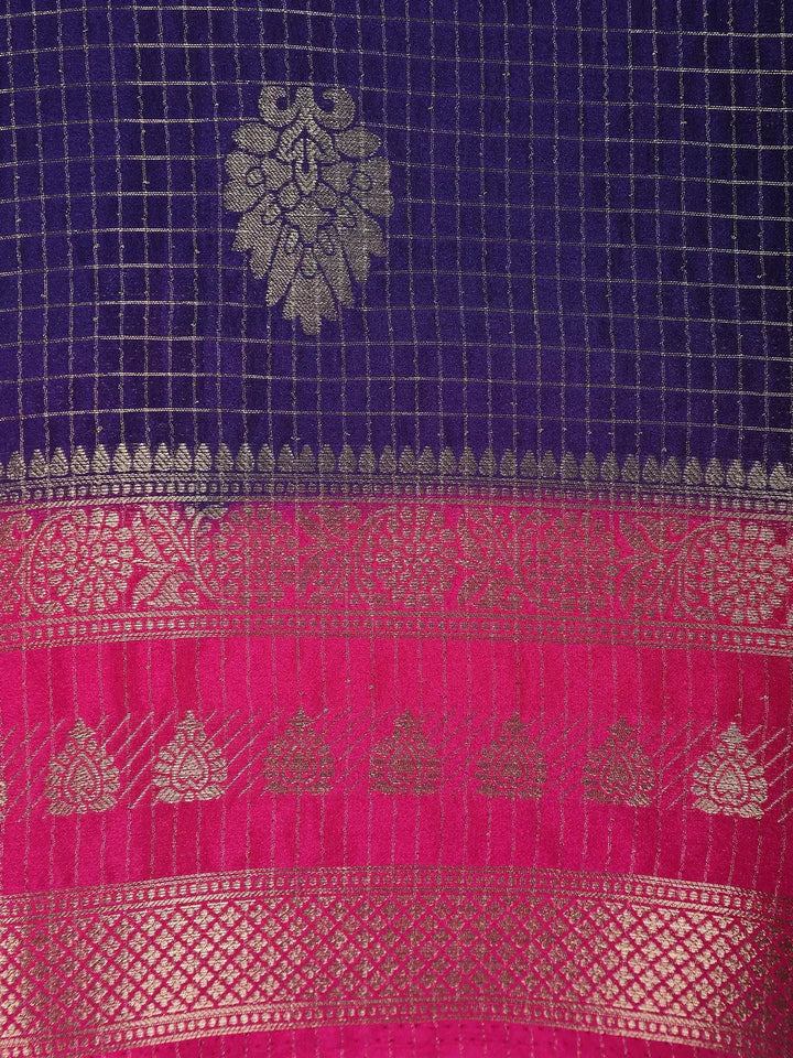 Navy Blue Checked Mysore Silk Saree With Silver Zari Motifs And Pink Border