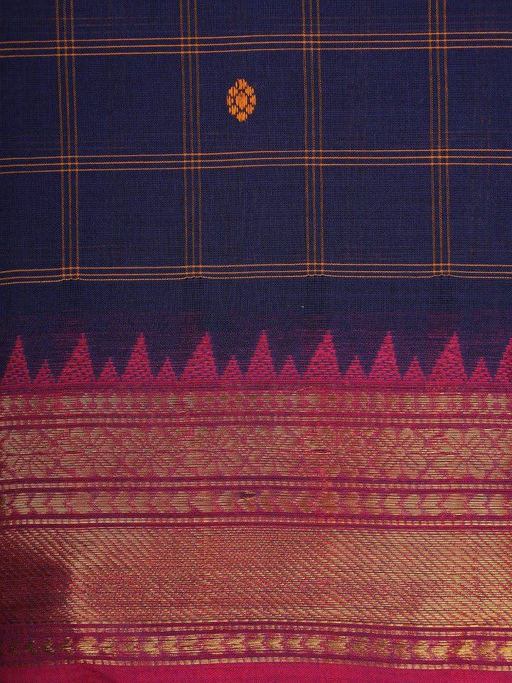 Navy Blue Checked Woven Design Cotton Saree with Pink Zari Border