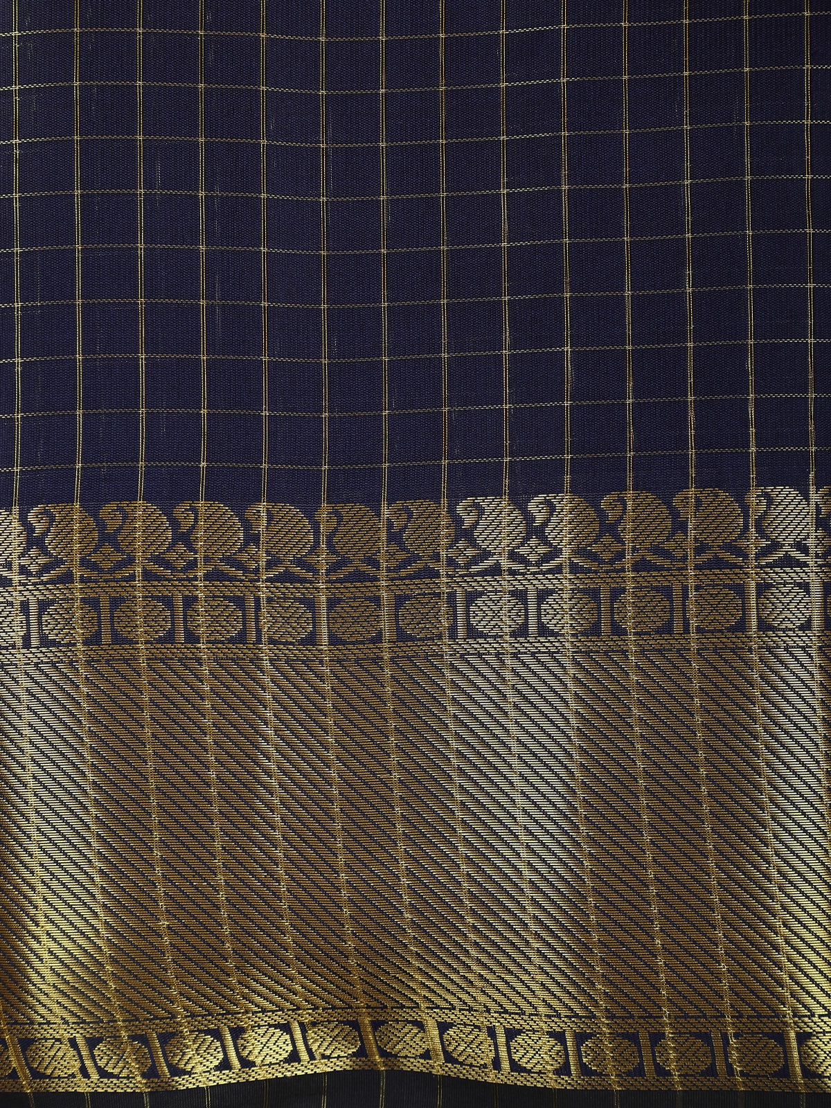 The highlight of the saree is its rich antique gold zari border, beautifully woven with traditional motifs that add a touch of heritage charm. The subtle sheen of the zari contrasts perfectly with the checked body, creating a balanced blend of tradition and sophistication. The pallu continues the zari detailing, completing the look with understated grandeur.