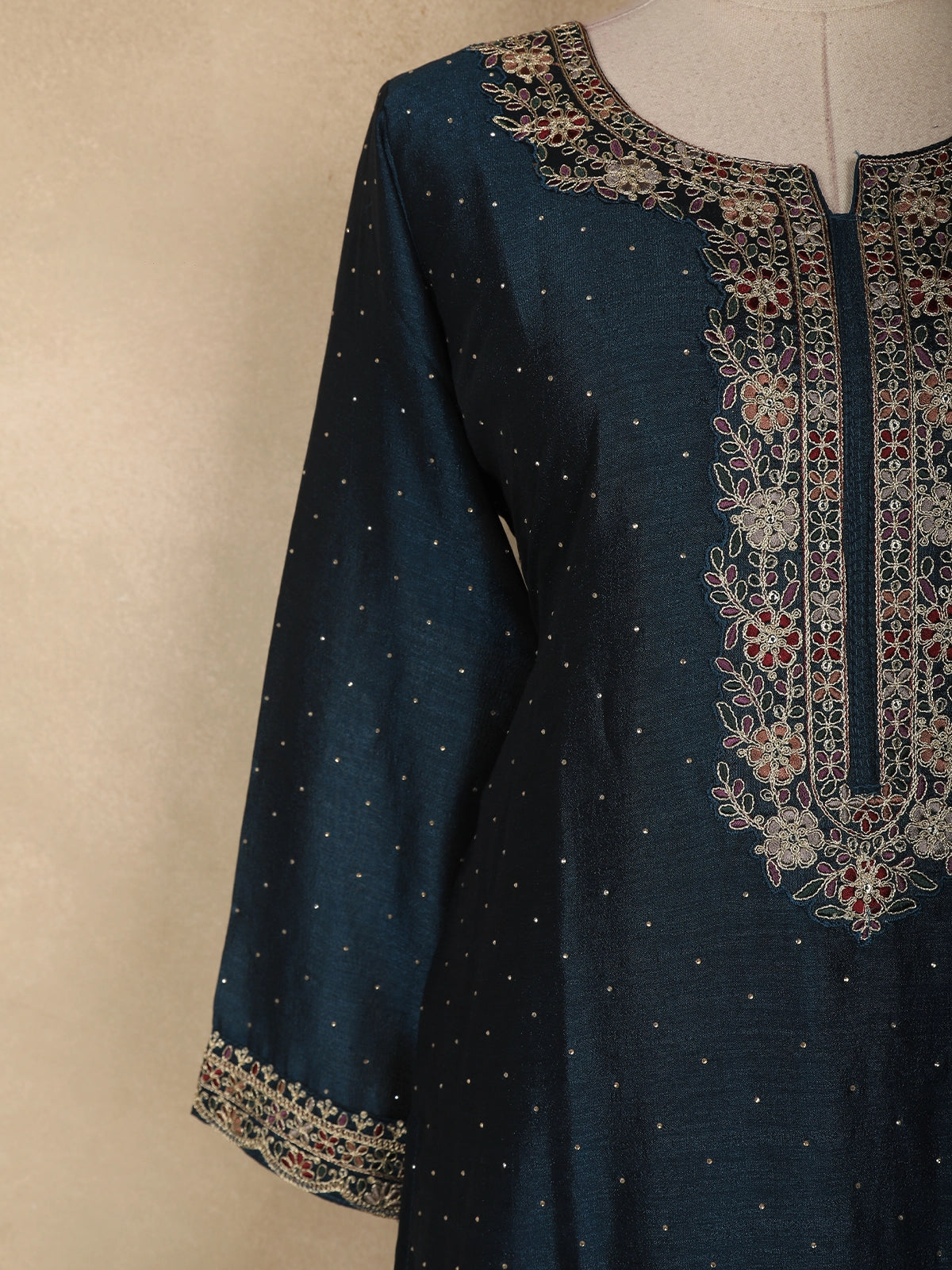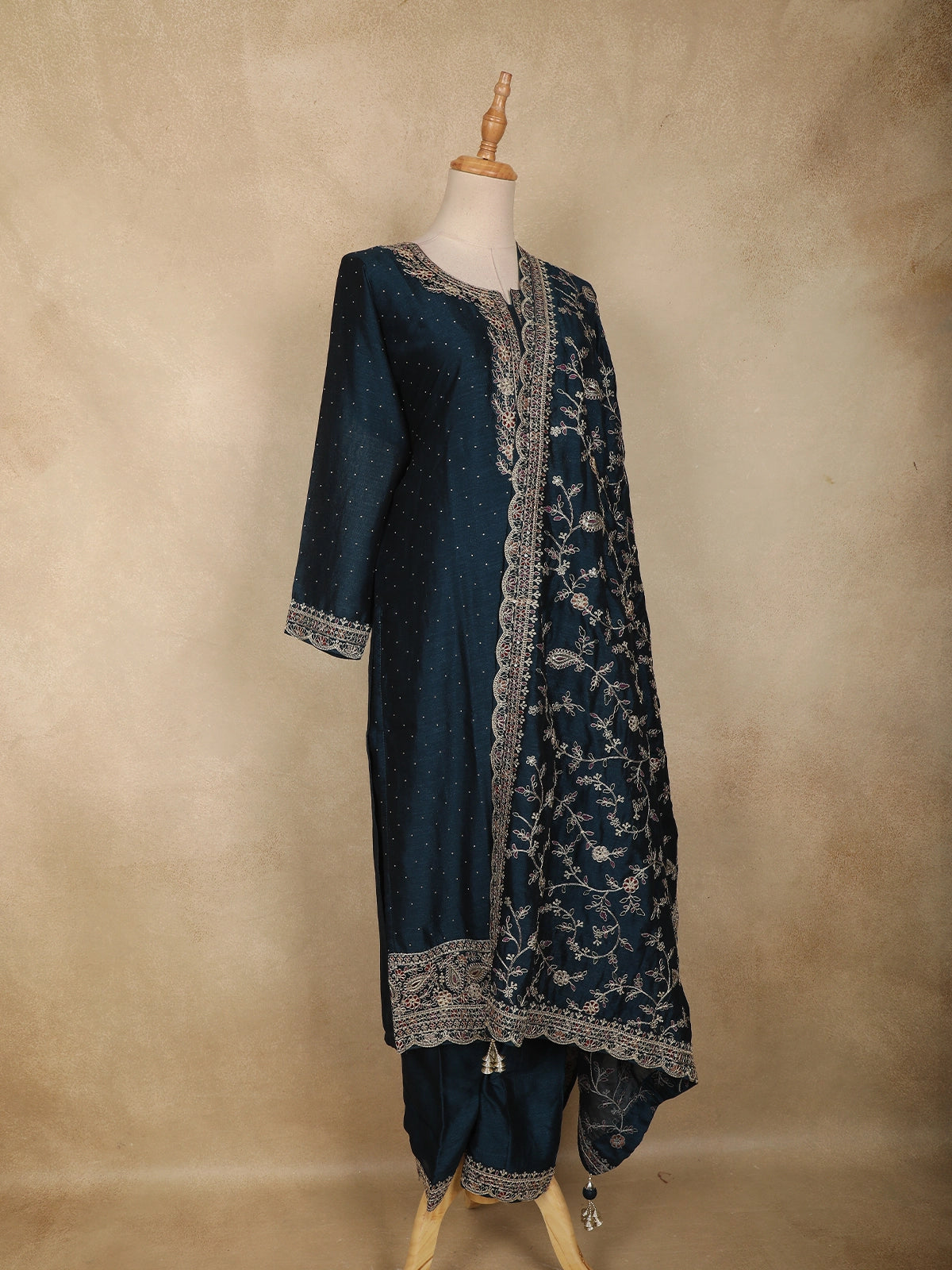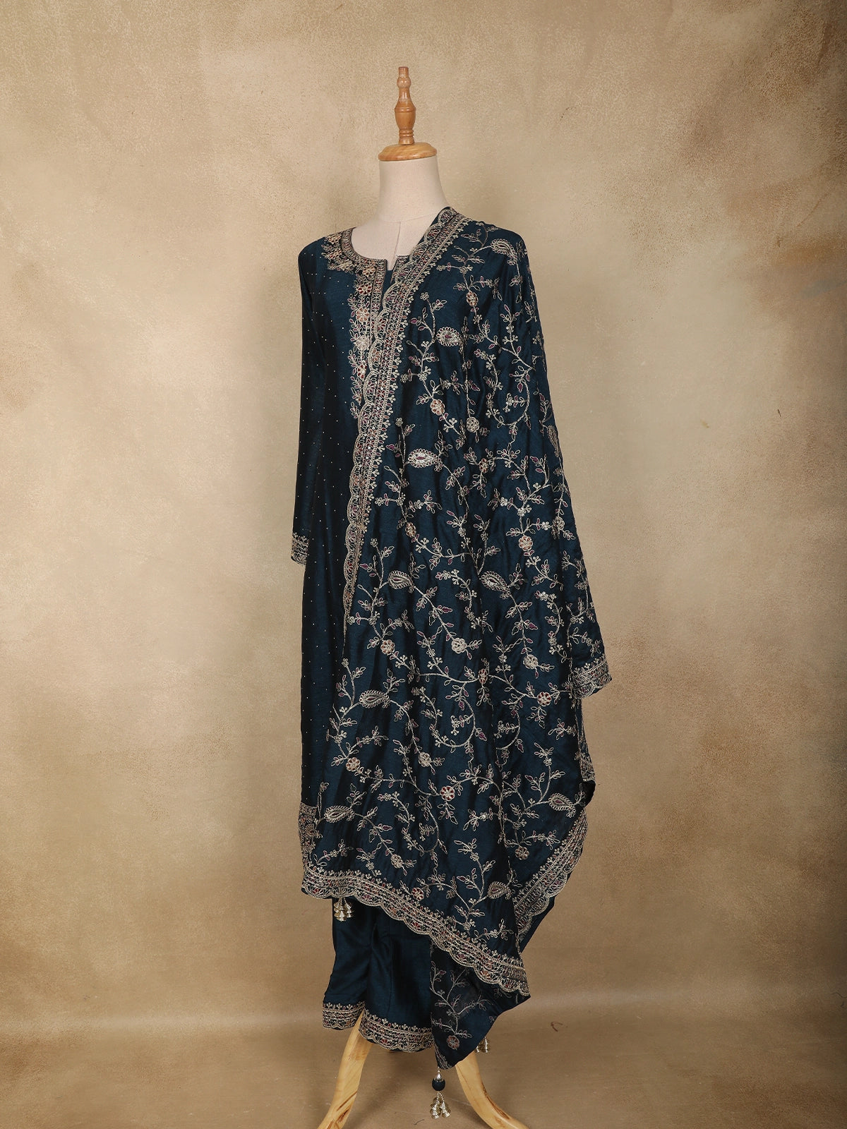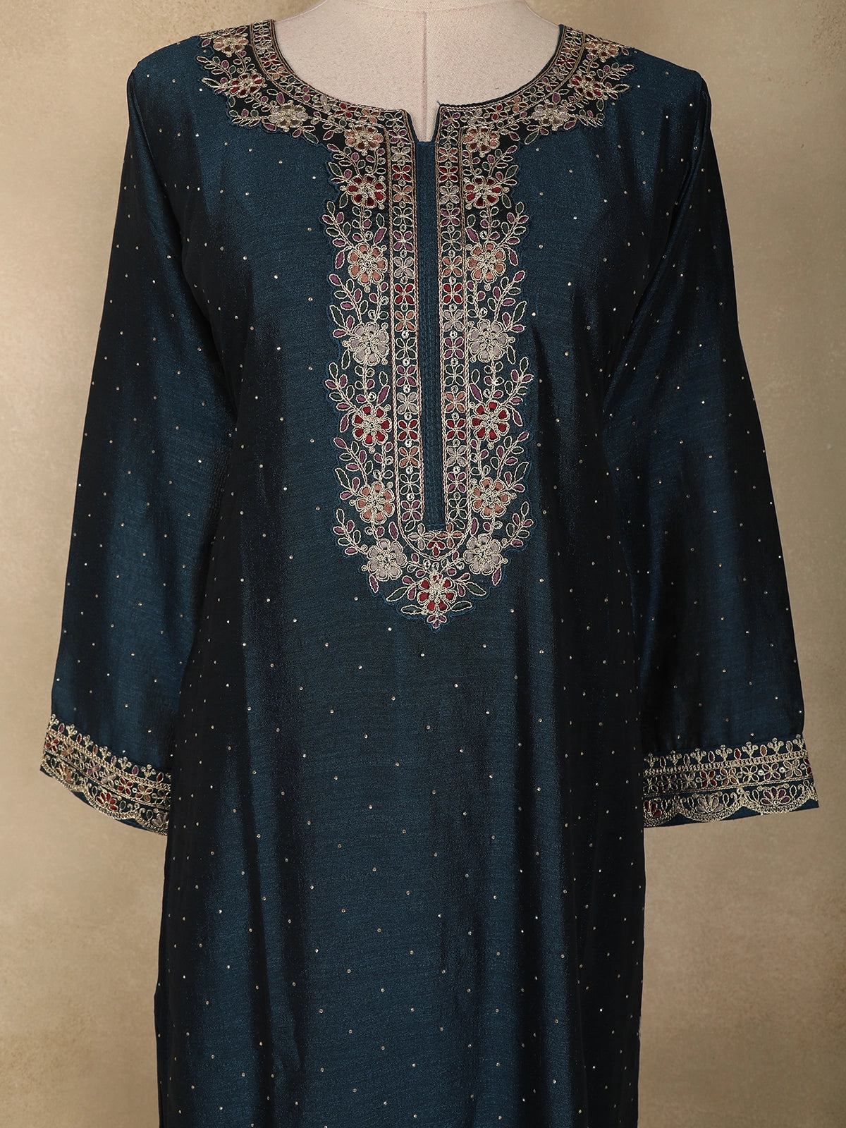 Elevate your festive and occasion wear wardrobe with this elegant navy blue straight cut salwar suit, crafted in lightweight georgette for a graceful and flowy silhouette. The kurta is beautifully enhanced with delicate floral embroidery in subtle metallic tones, creating a refined contrast against the deep navy base. Fine dotted detailing adds texture and depth, while the intricately embroidered neckline and borders lend a touch of traditional charm.