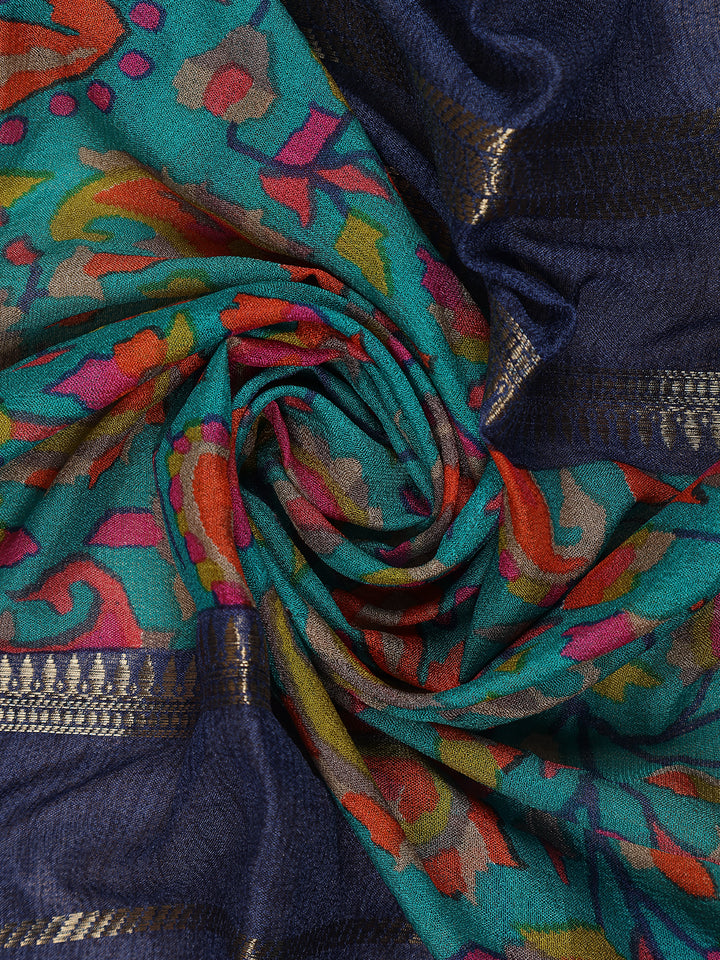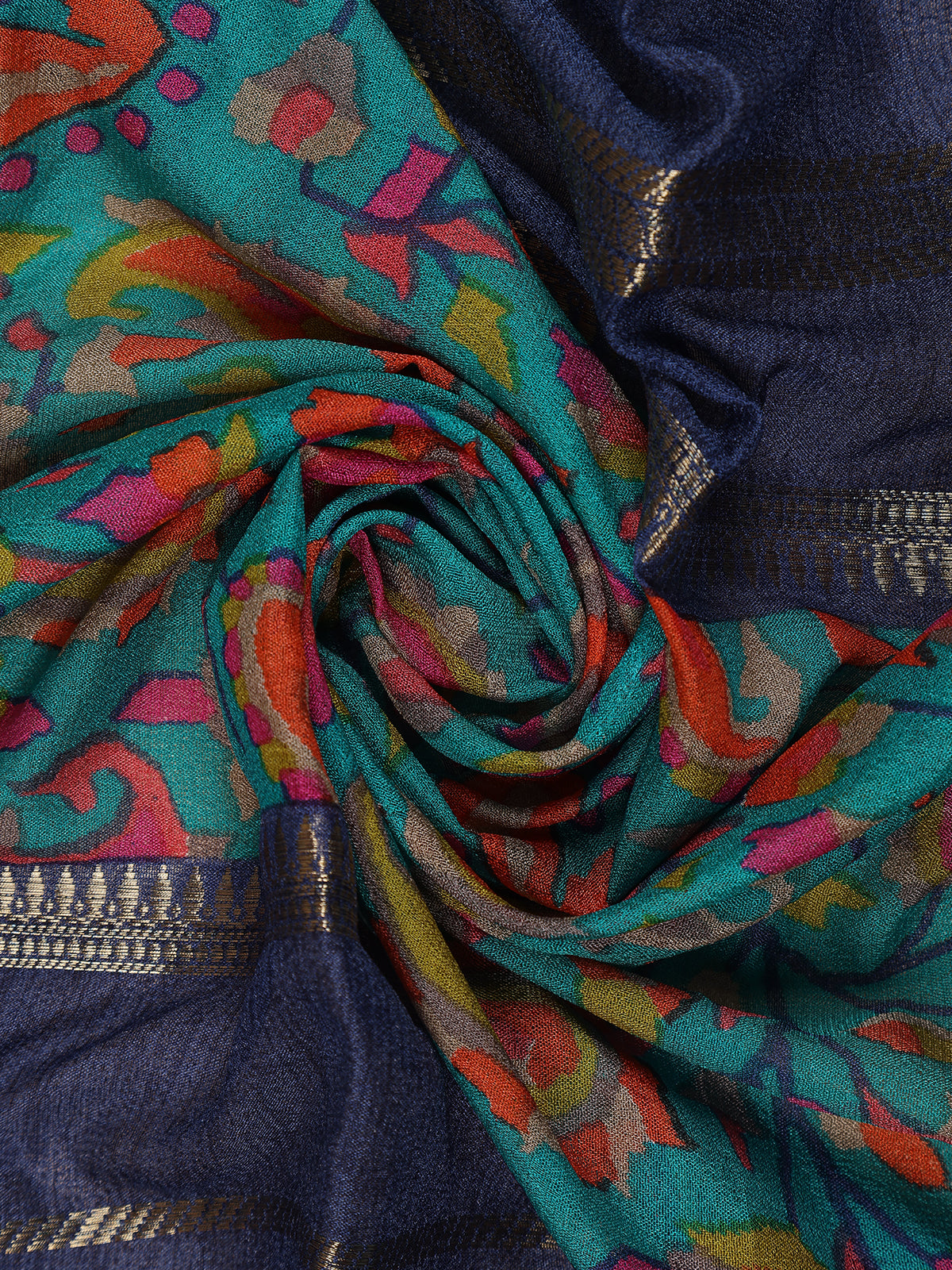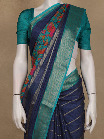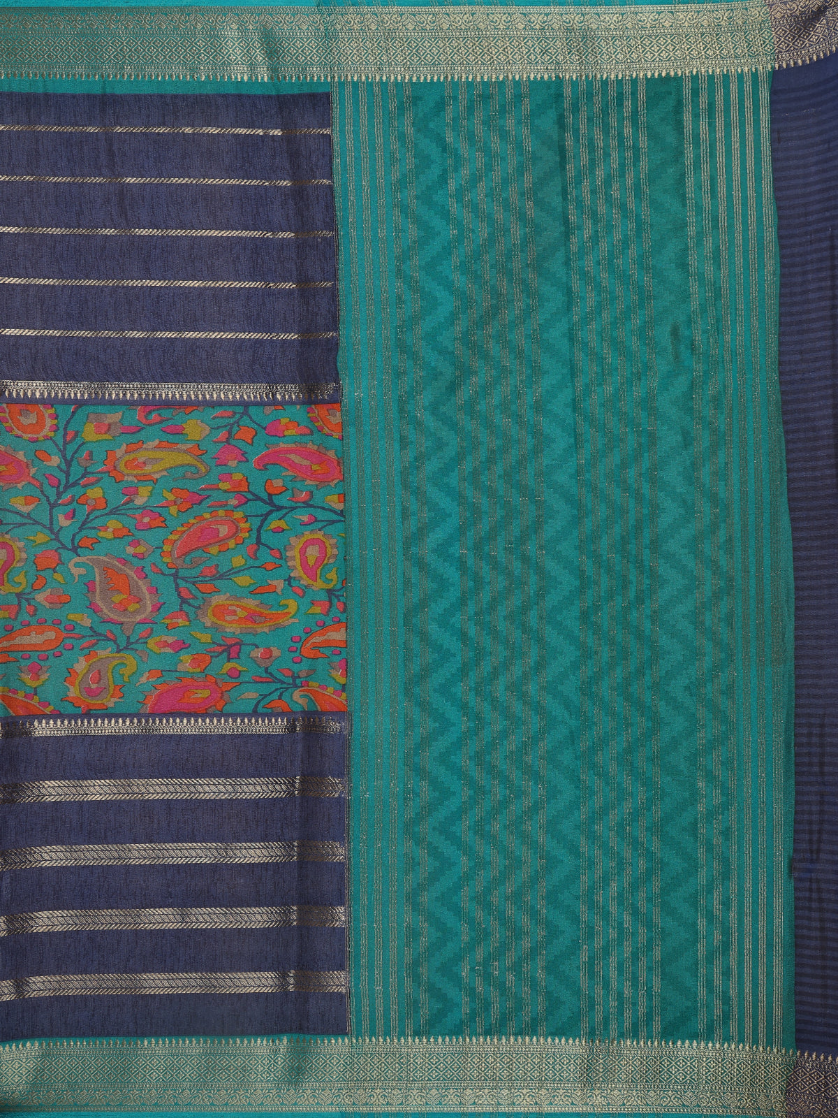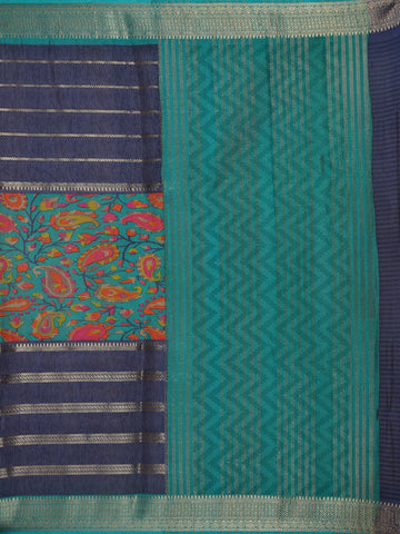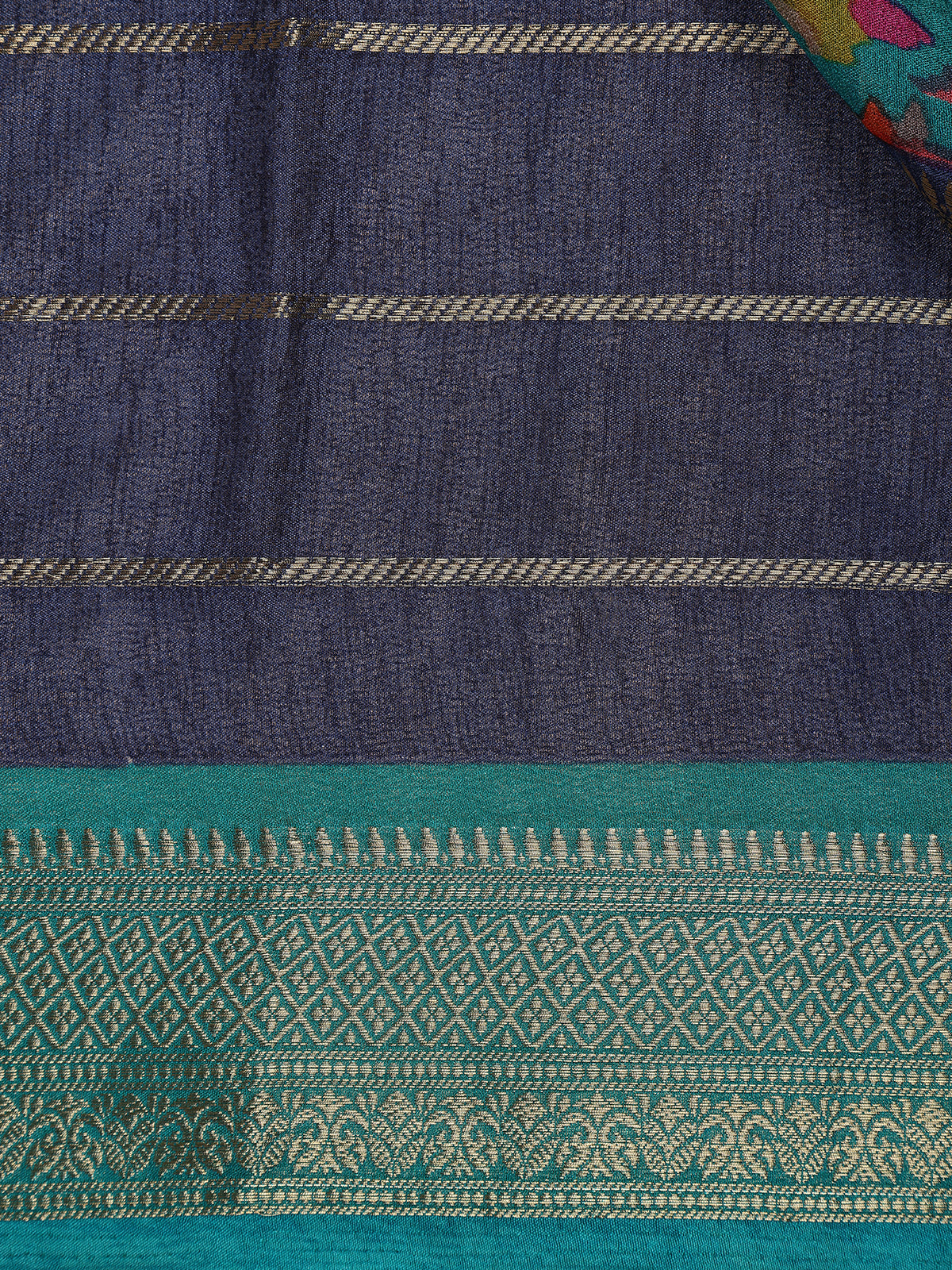 Exude effortless elegance in this Navy Blue Floral and Stripes Design Mul Mul Cotton Saree, a perfect fusion of comfort and charm. The breathable Mul Mul fabric ensures day-long ease, while the contrasting teal green pallu and blouse create a striking visual harmony. Detailed with shimmering zari stripes and a rich border, this saree makes a graceful choice for both festive and everyday traditional wear.