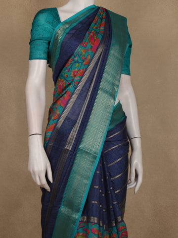 Navy Blue Floral and Stripes Design Mul Mul Cotton Saree