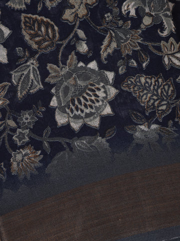 The navy blue base is beautifully adorned with subtle floral prints, lending a refined charm that’s both modern and timeless. Its designed border enhances the overall aesthetic, giving the drape a polished finish. The matching blouse piece completes the ensemble, creating a coordinated and sophisticated look.