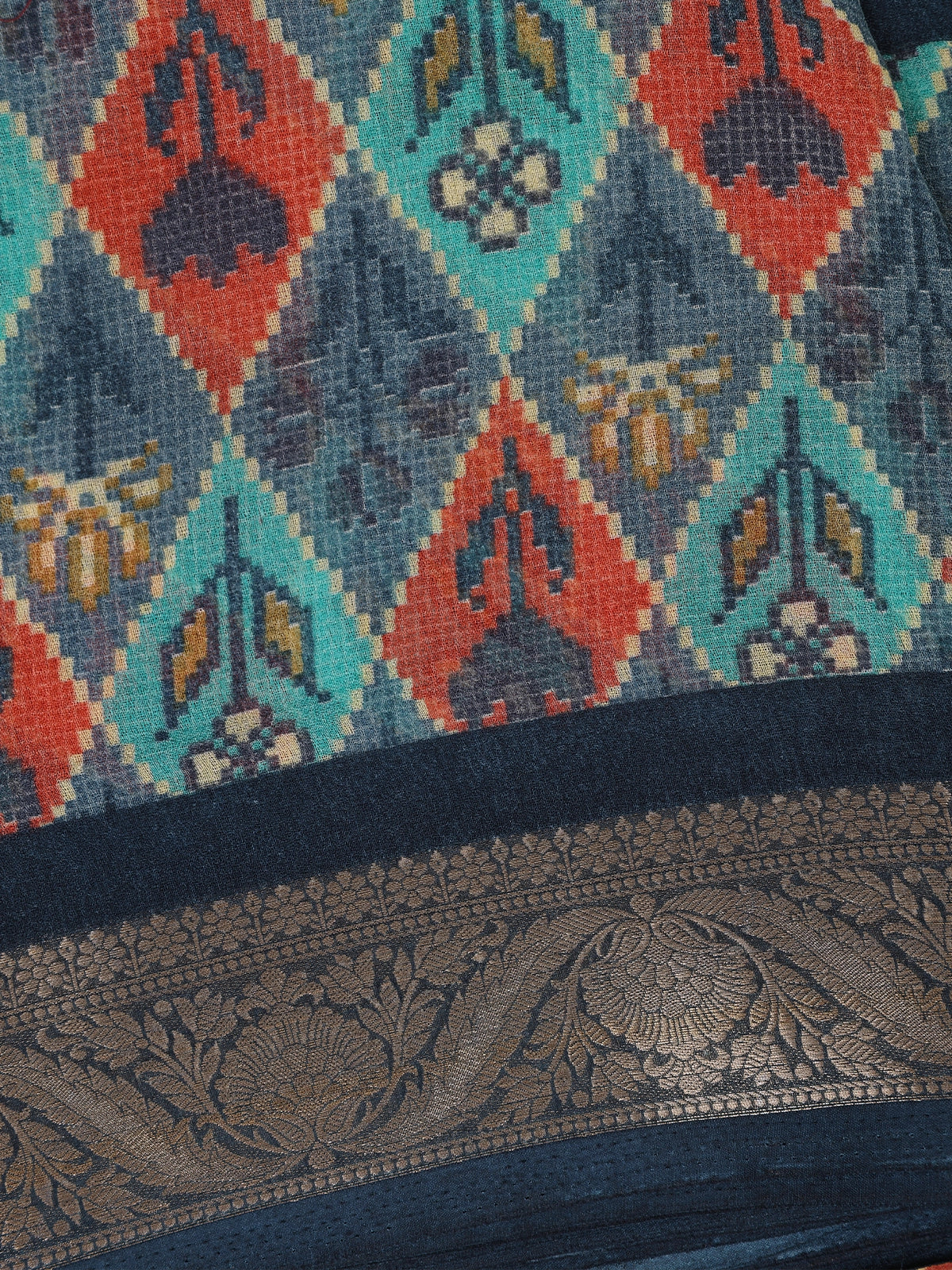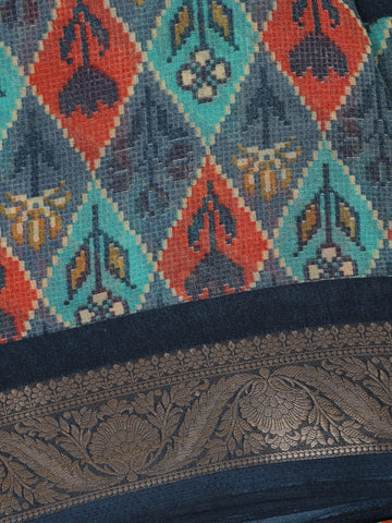 Navy Blue Multicolor Diamond Ikat Design Linen Cotton Saree