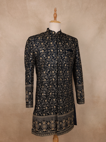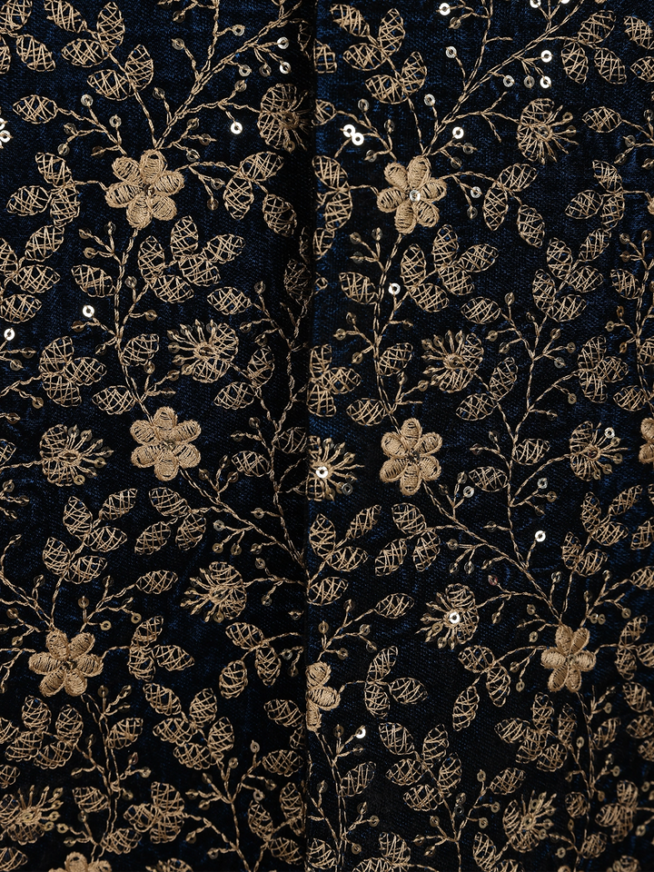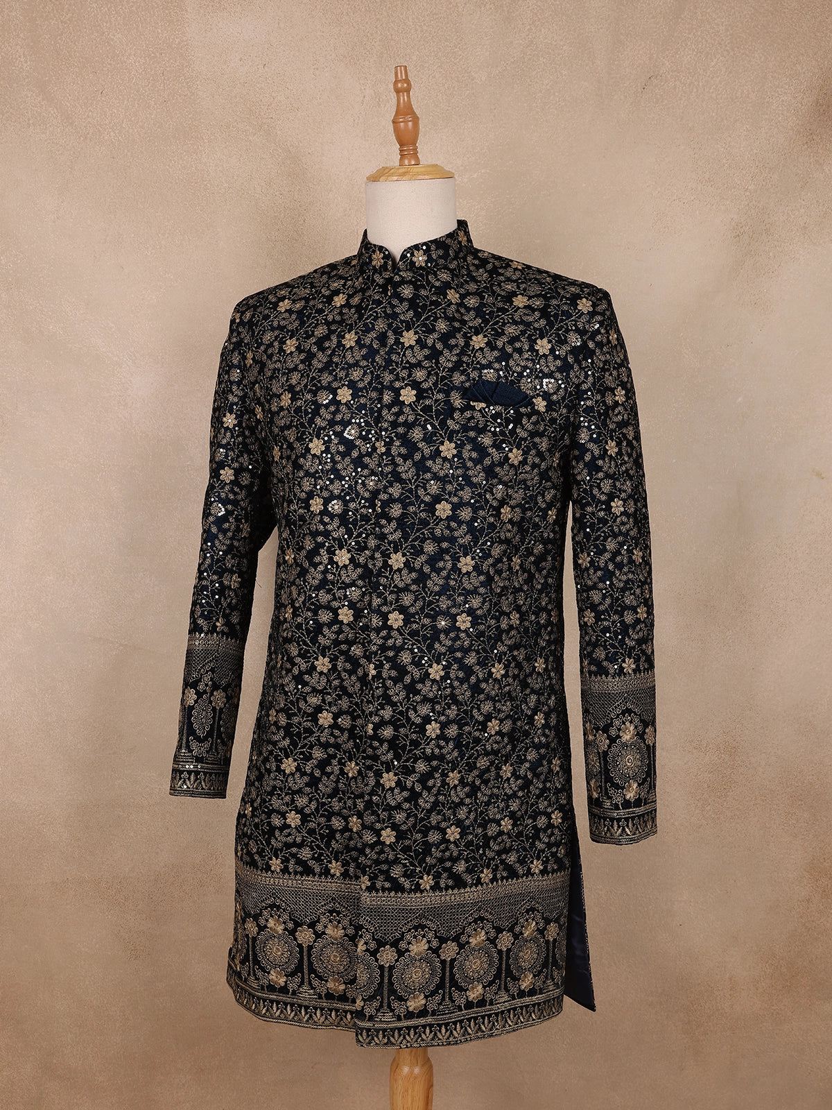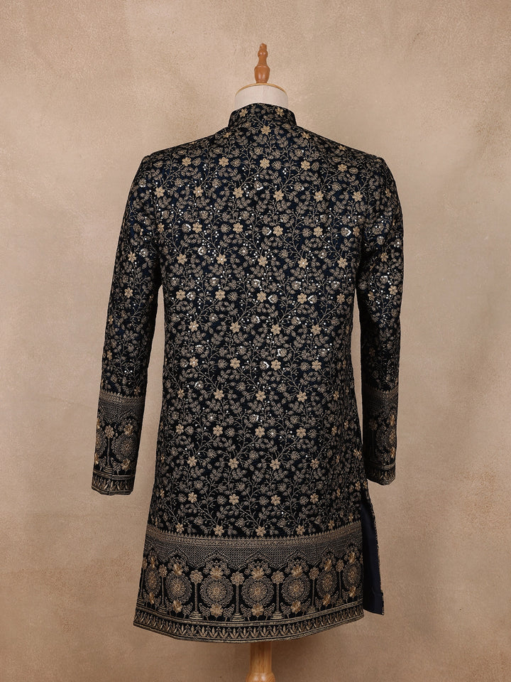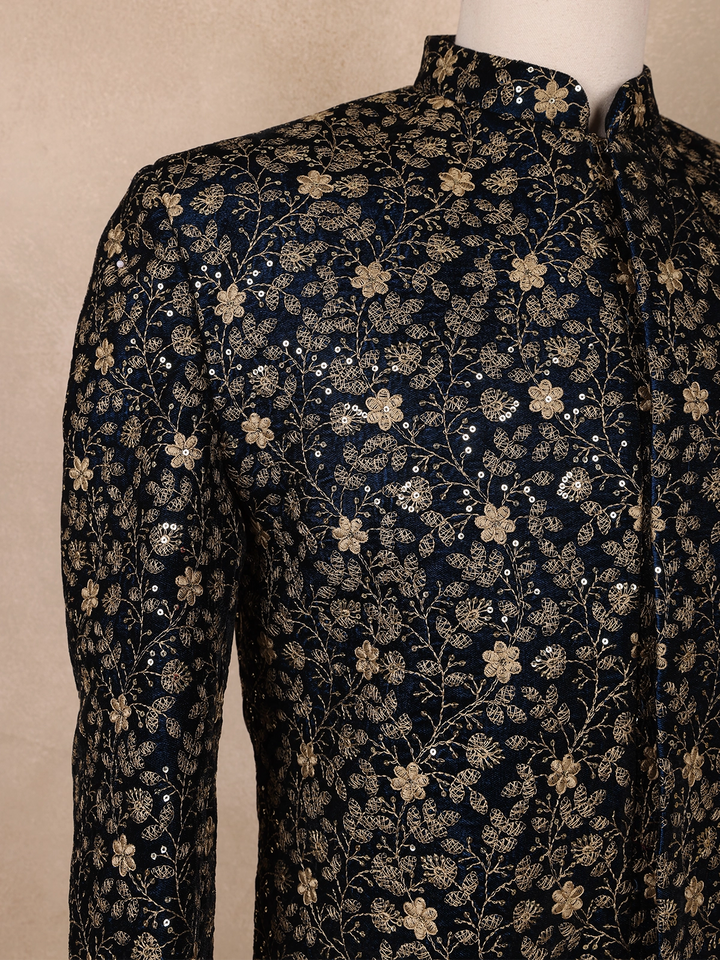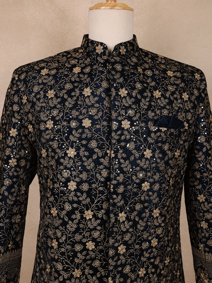 Navy Blue Floral Designed Velvet Sherwani Suit