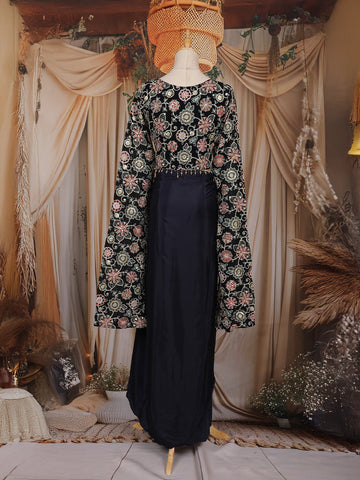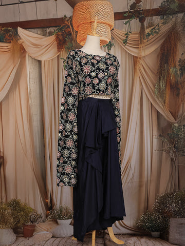 The matching navy draped skirt complements the top with its soft, fluid silhouette that adds graceful movement. The full, flared sleeves create a dramatic statement, perfect for cocktail evenings, festive celebrations, or sangeet occasions.