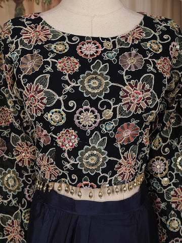 Navy Blue Floral Embroidered Georgette Crop Top with Draped Skirt