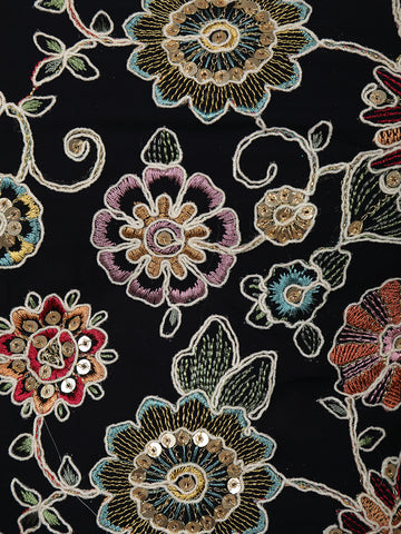 Turn heads in this exquisite navy blue embroidered crop top and draped skirt set that beautifully blends elegance with contemporary charm. The crop top features intricate multicolor floral embroidery done with fine threads and sequins on a georgette base. A delicate beaded trim along the hemline adds a festive sparkle to the look.
