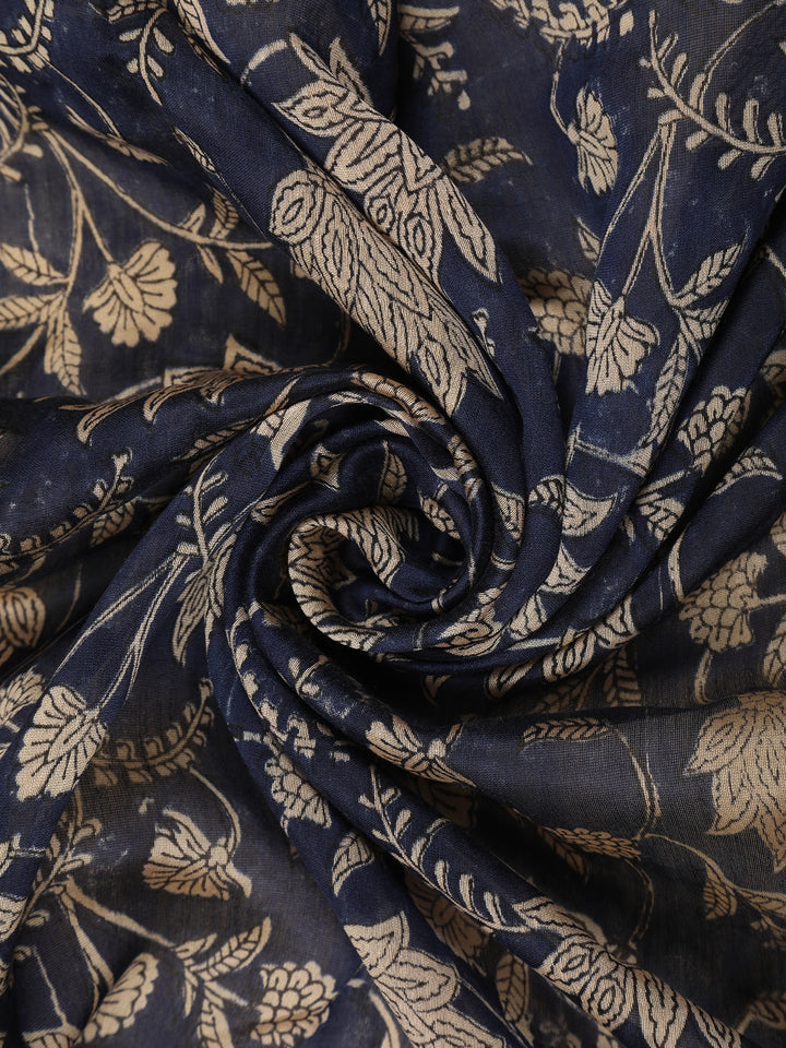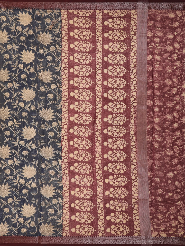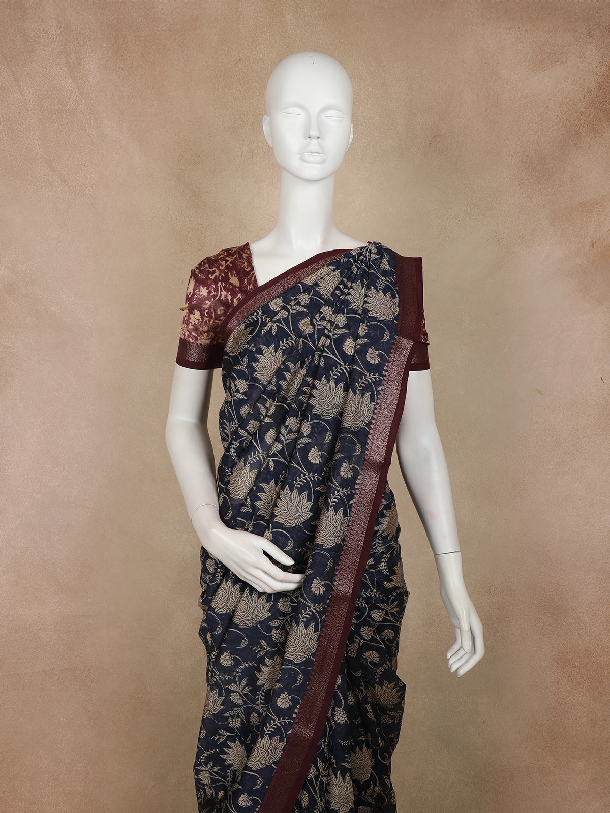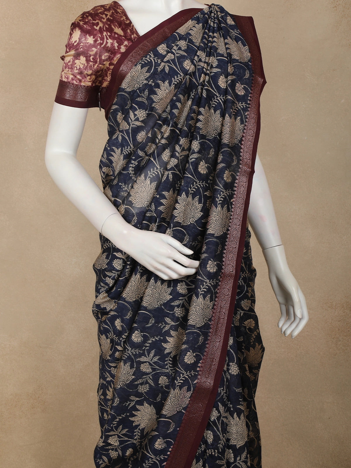 Navy Blue Floral Printed Chanderi Cotton Saree with Maroon Zari Border
