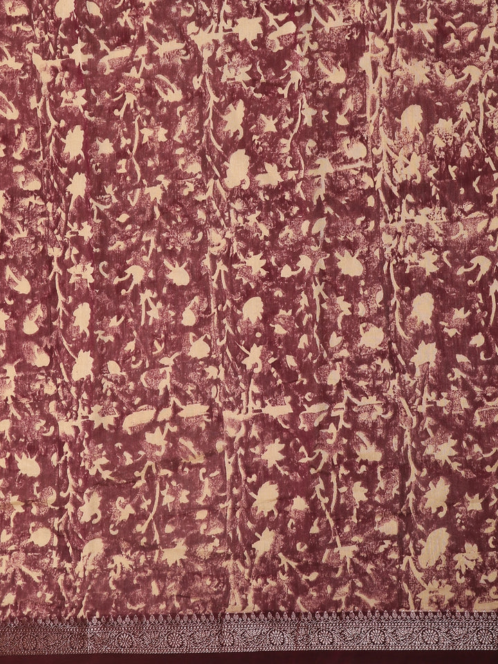The saree is accentuated with a maroon zari woven border, adding subtle richness and contrast. The maroon printed pallu enhances the look with its artistic detailing, while the contrast maroon blouse completes the ensemble with a refined finish.
