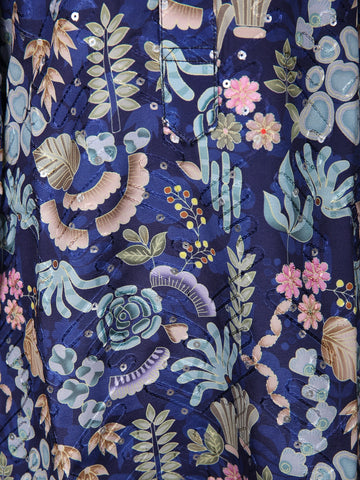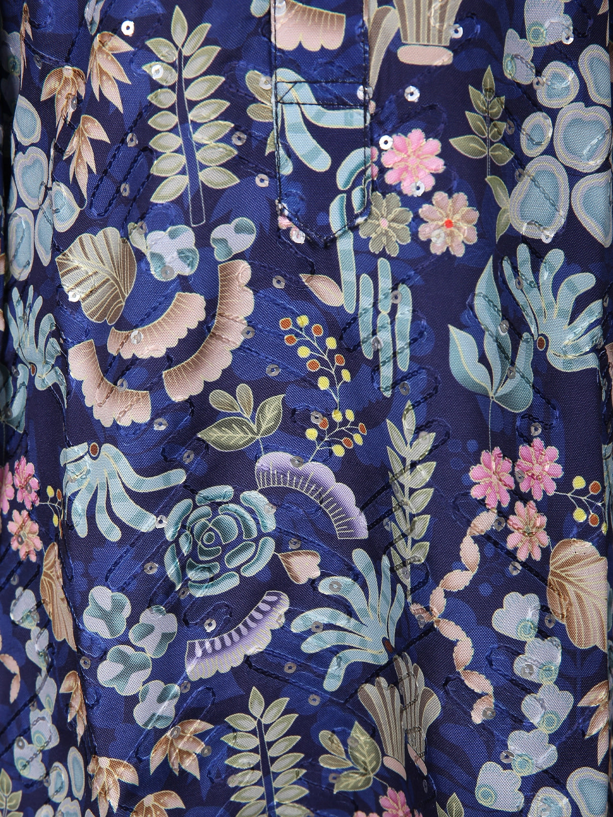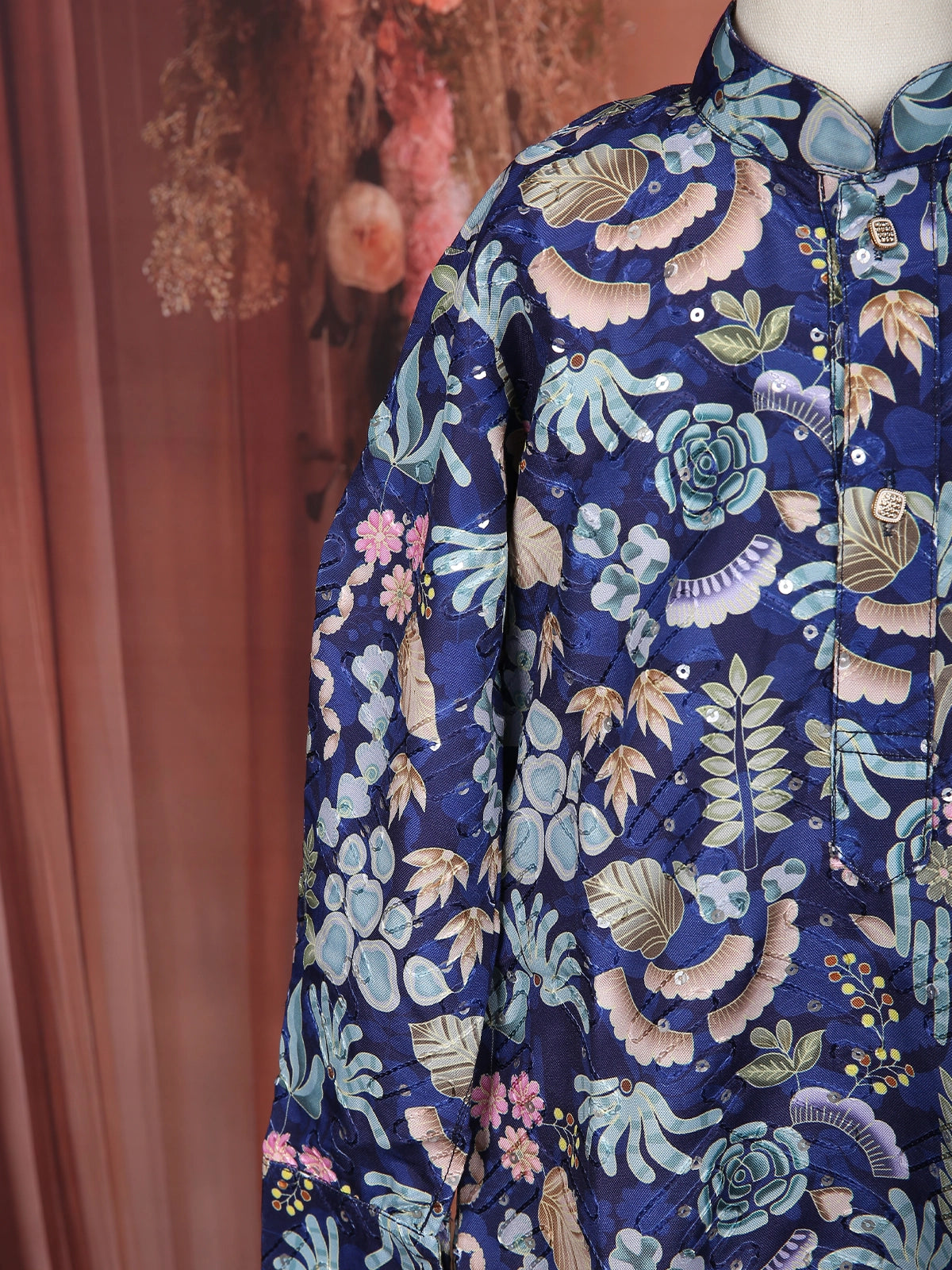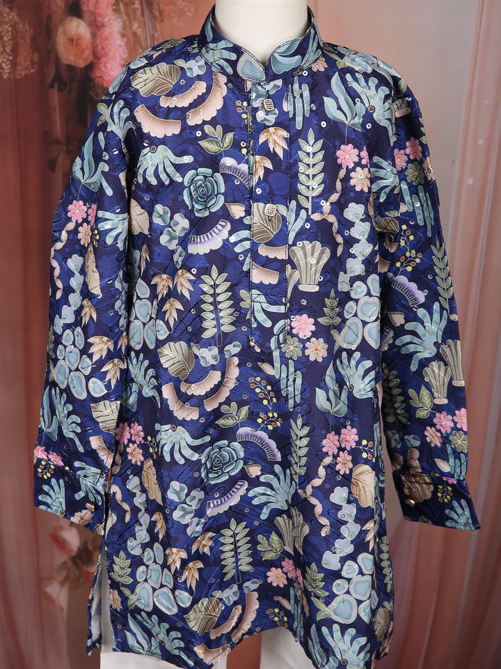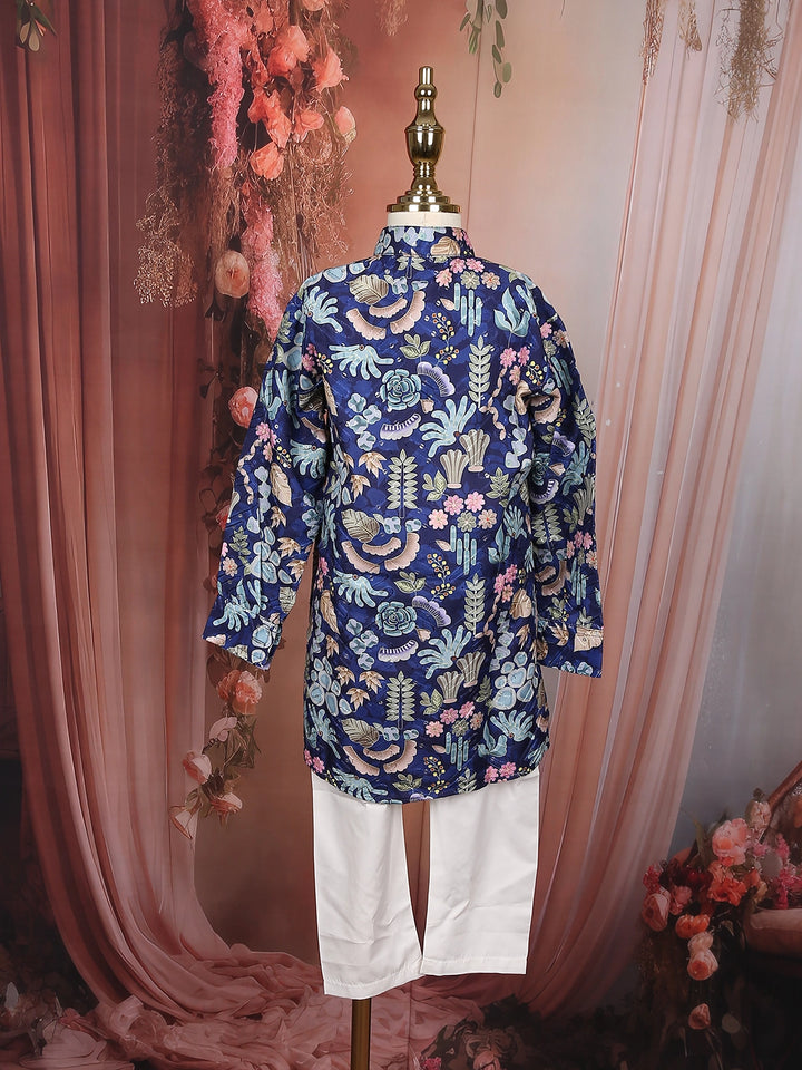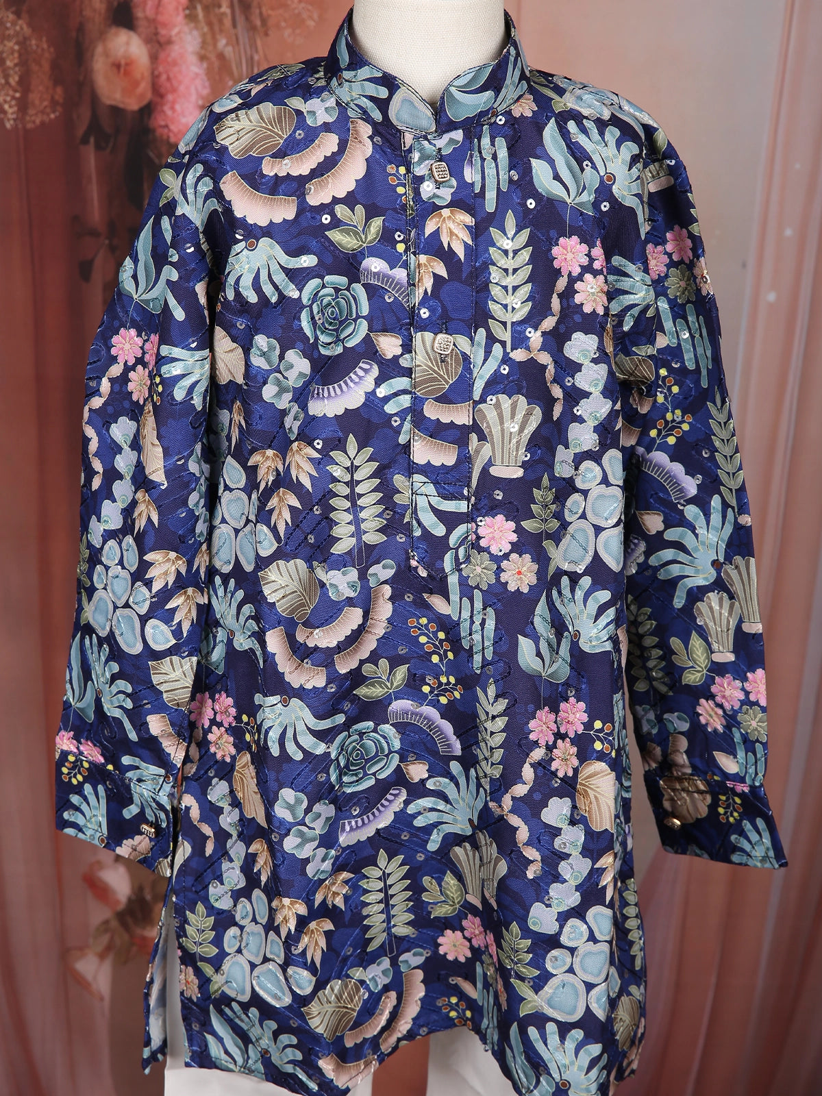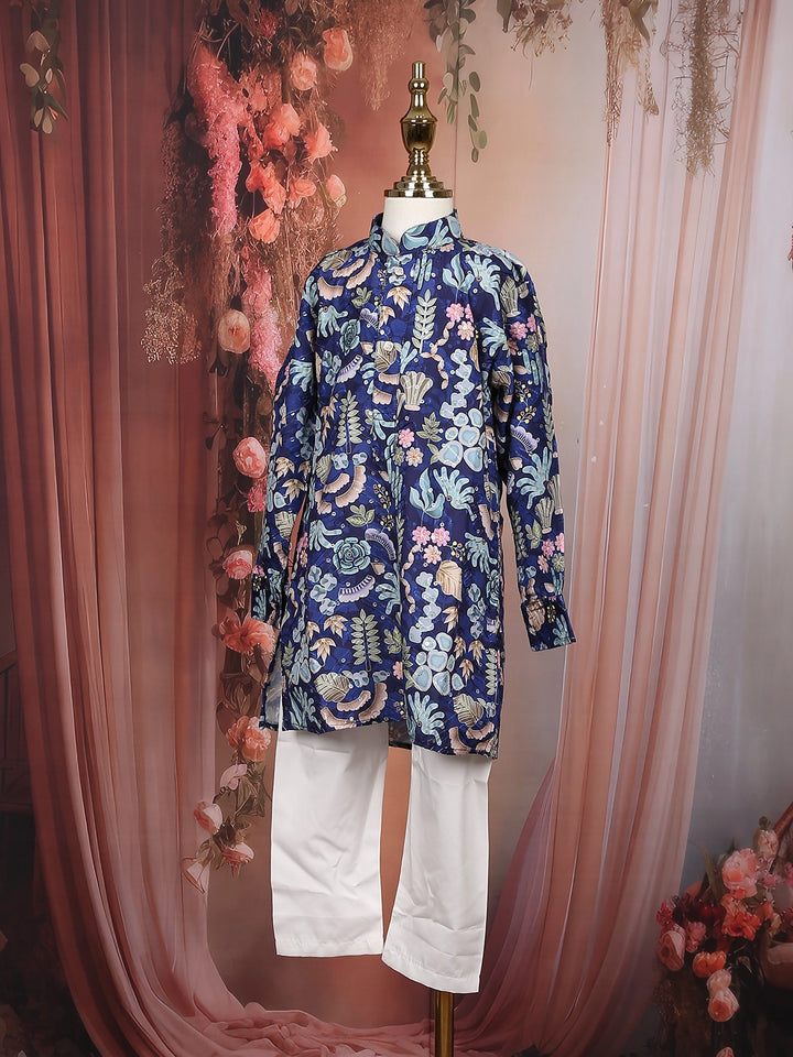 Navy Blue Floral Printed Cotton Kids Kurta Set