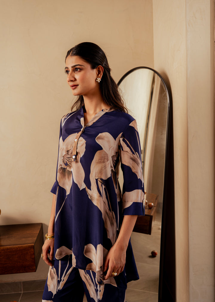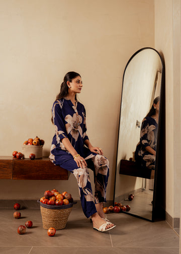 Elevate your everyday style with this Navy Blue Floral Printed Co-ord Set, crafted from soft and breathable crepe fabric that ensures all-day comfort. Designed with a relaxed silhouette, the set features a long straight-fit top adorned with oversized beige floral motifs for a chic and sophisticated appeal. The V-neckline with a button placket and 3/4th roll-up sleeves add a polished touch to the look.