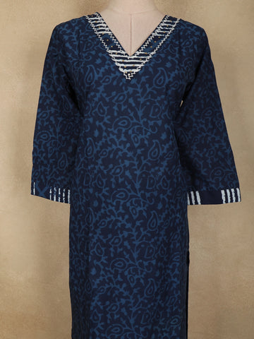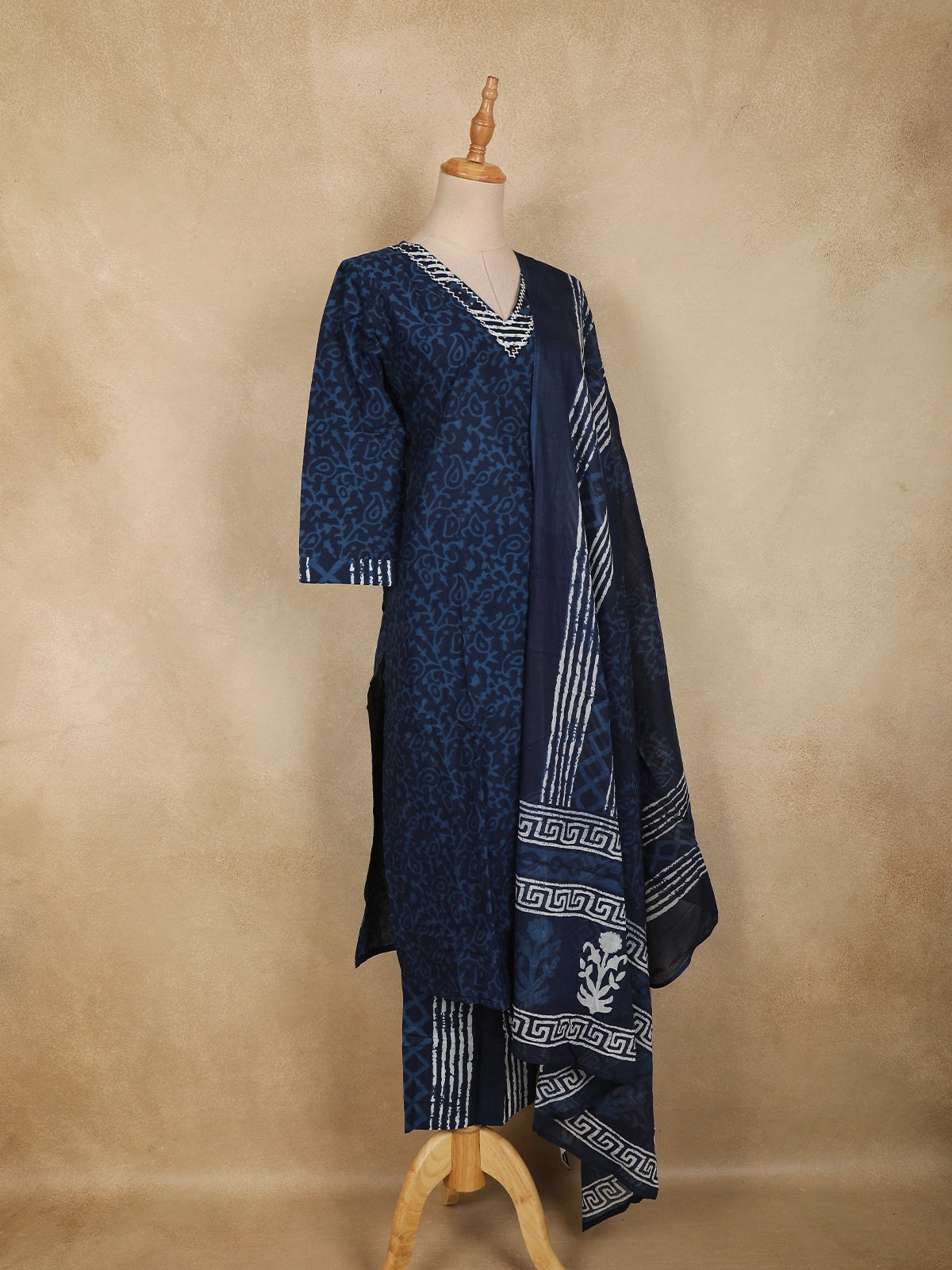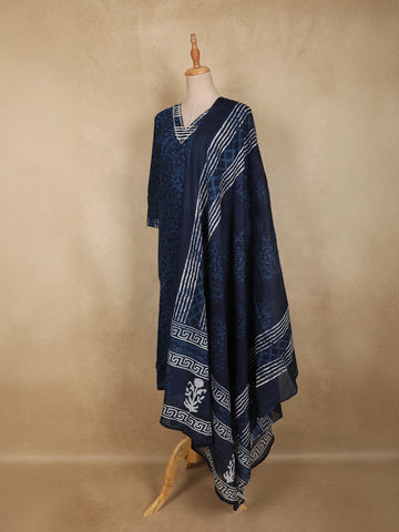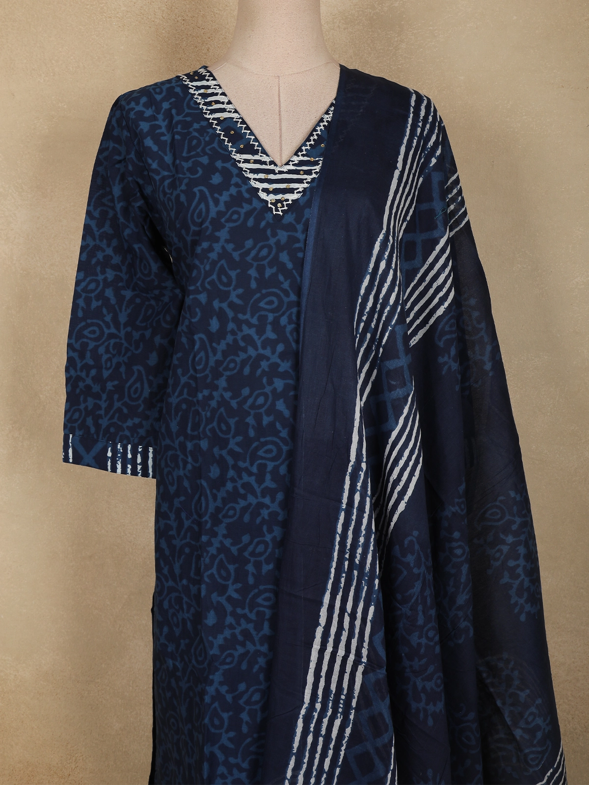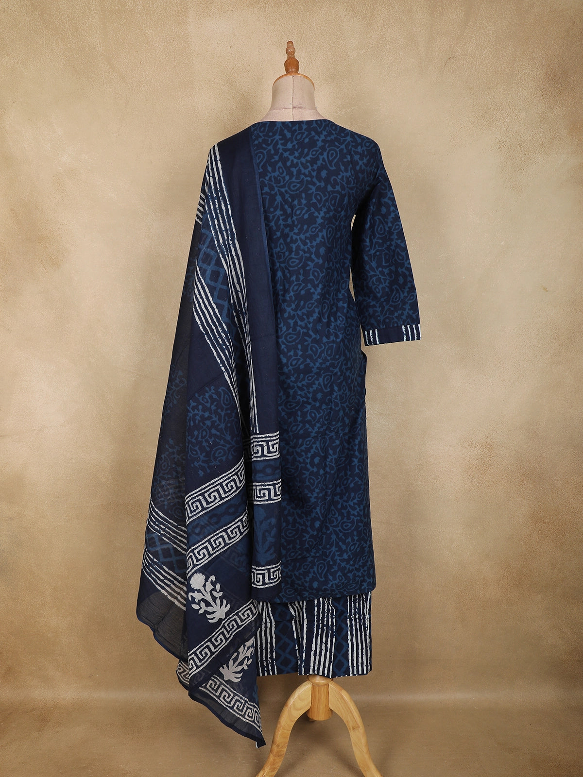 Navy Blue Floral Printed Design Cotton Straight Cut Salwar Suit with Dupatta