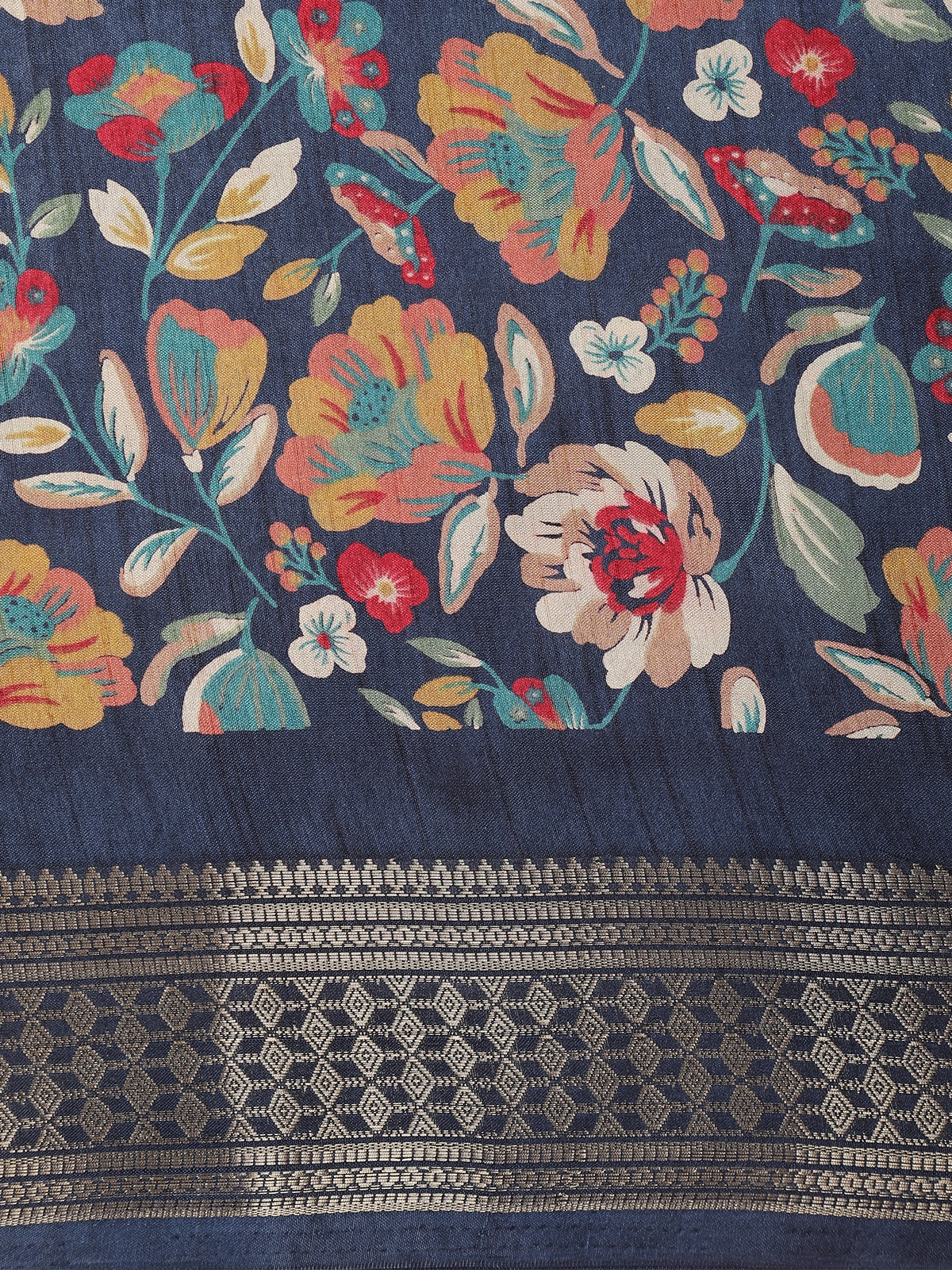 This elegant mixed silk cotton fancy saree features a graceful floral printed design that brings together timeless beauty and everyday sophistication. Set against a deep navy blue base, the saree is adorned with multicolour floral and leaf motifs in shades of teal, mustard, coral, ivory, and red, creating a vibrant yet balanced look.