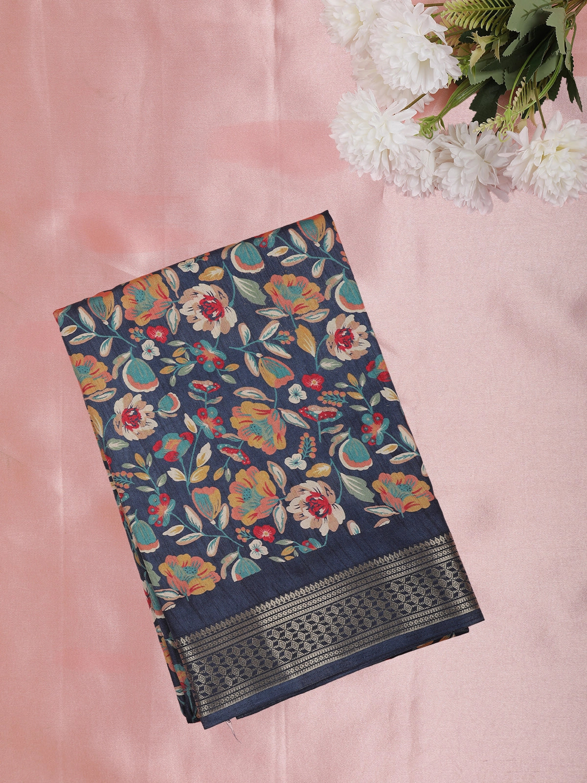 Navy Blue Floral Printed Design Mixed Silk Cotton Saree with Designer Border
