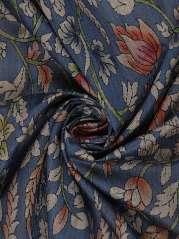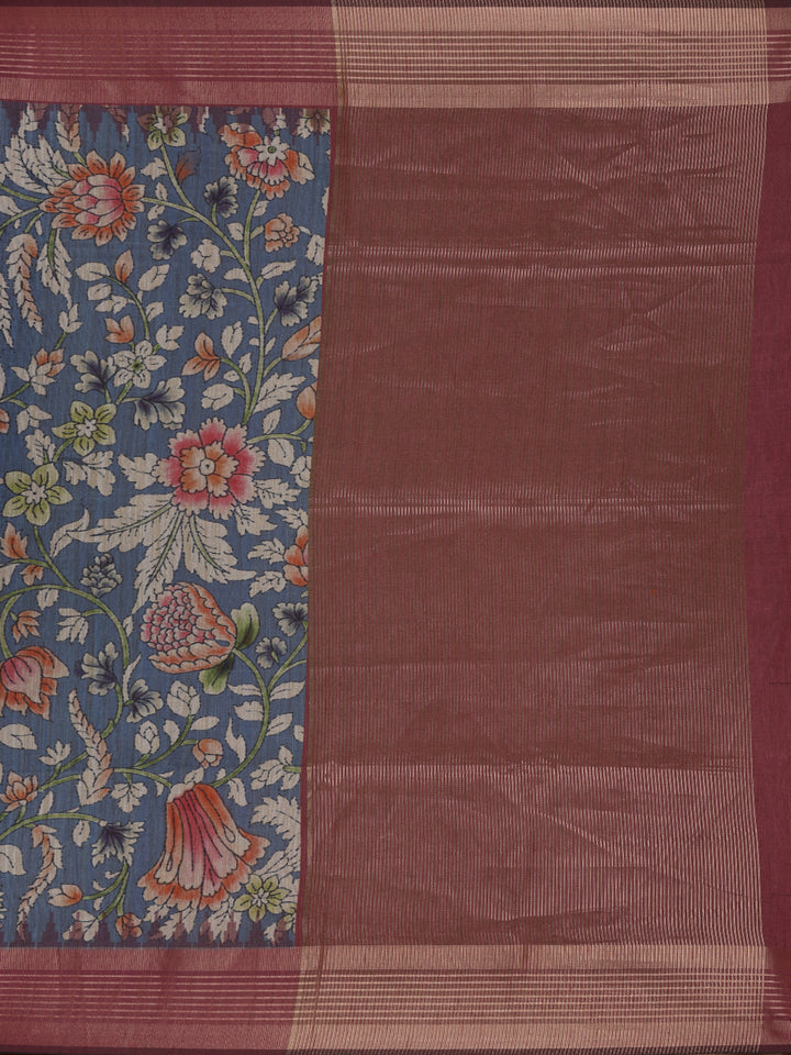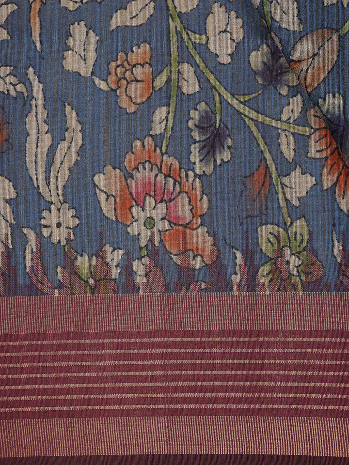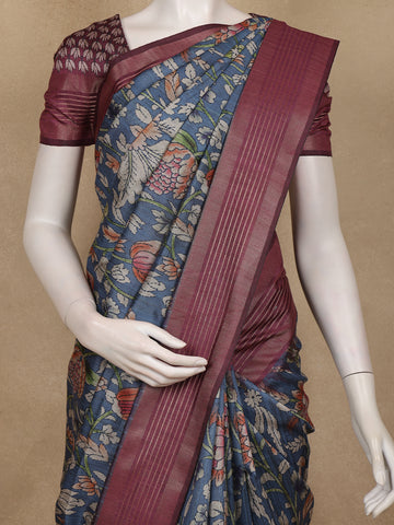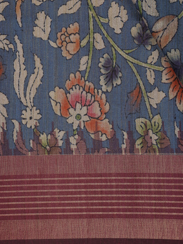 Navy Blue Floral Printed Design Semi Tussar Saree with Maroon Border