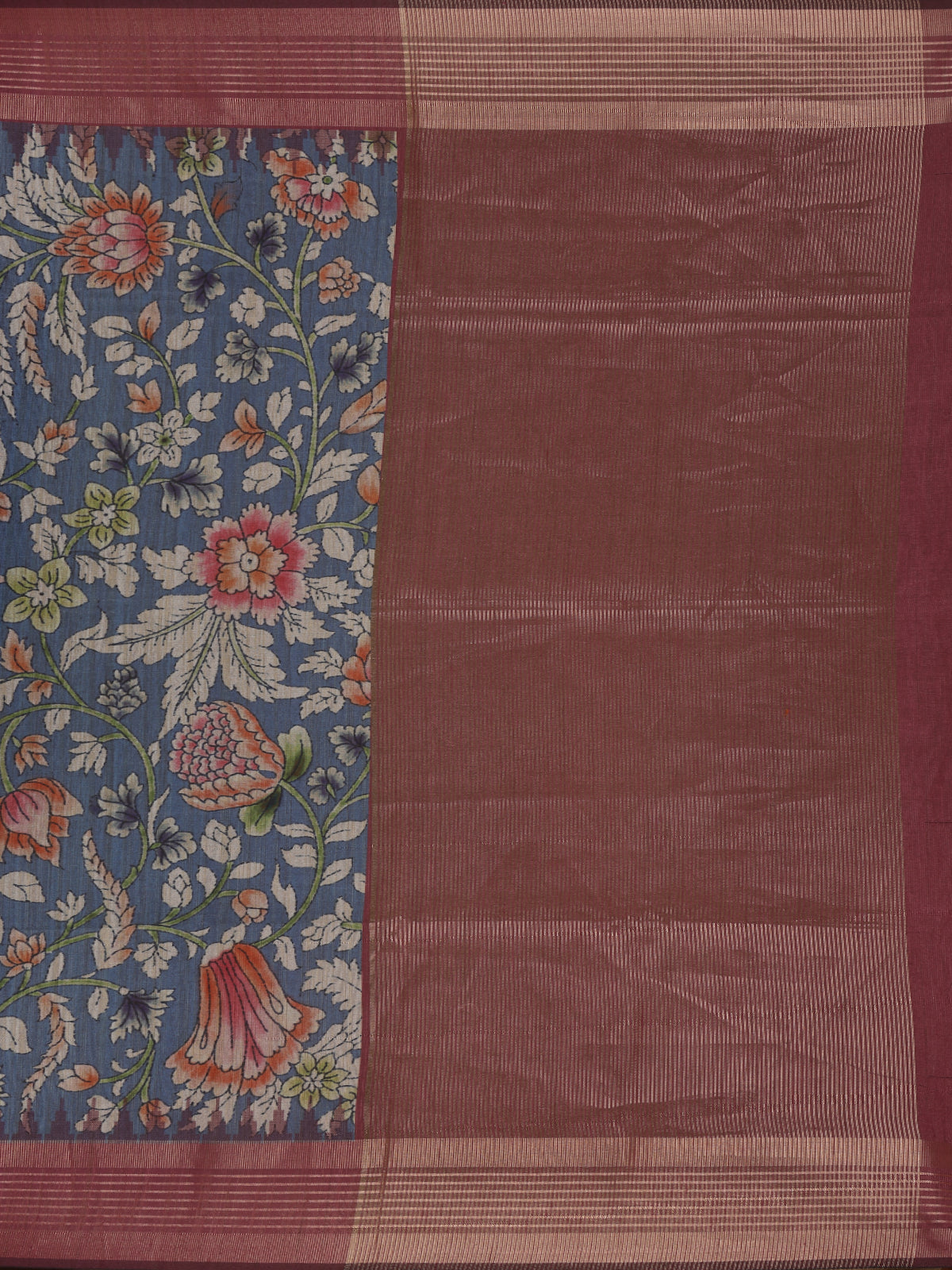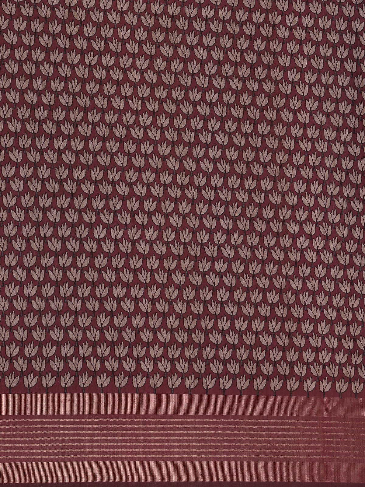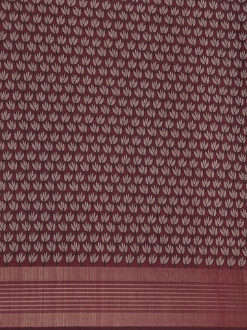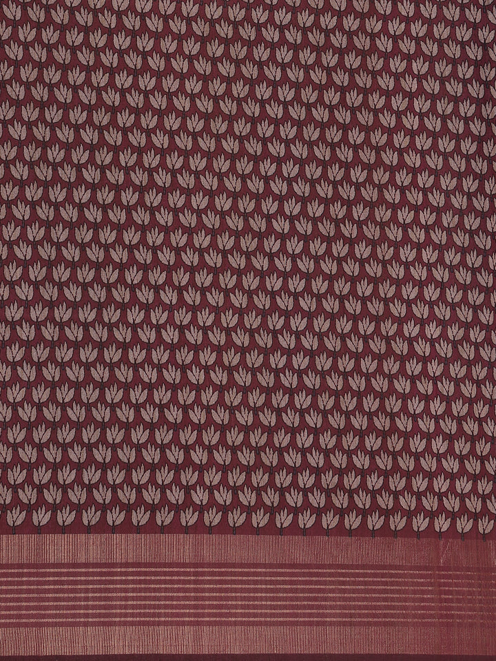A striking maroon zari border and matching pallu add a regal contrast, enhancing the saree’s luxurious appeal. Ideal for casual wear, festive gatherings, or cultural occasions, this saree brings refined beauty and comfort together effortlessly. The contrasting maroon blouse completes the look, making it a timeless addition to your ethnic wardrobe.