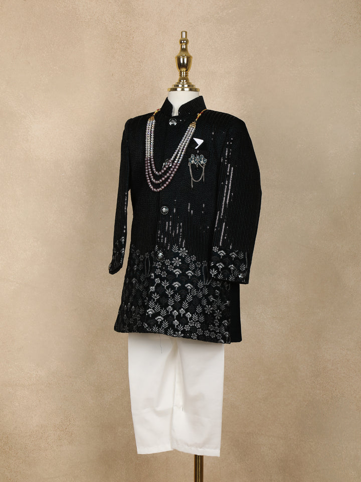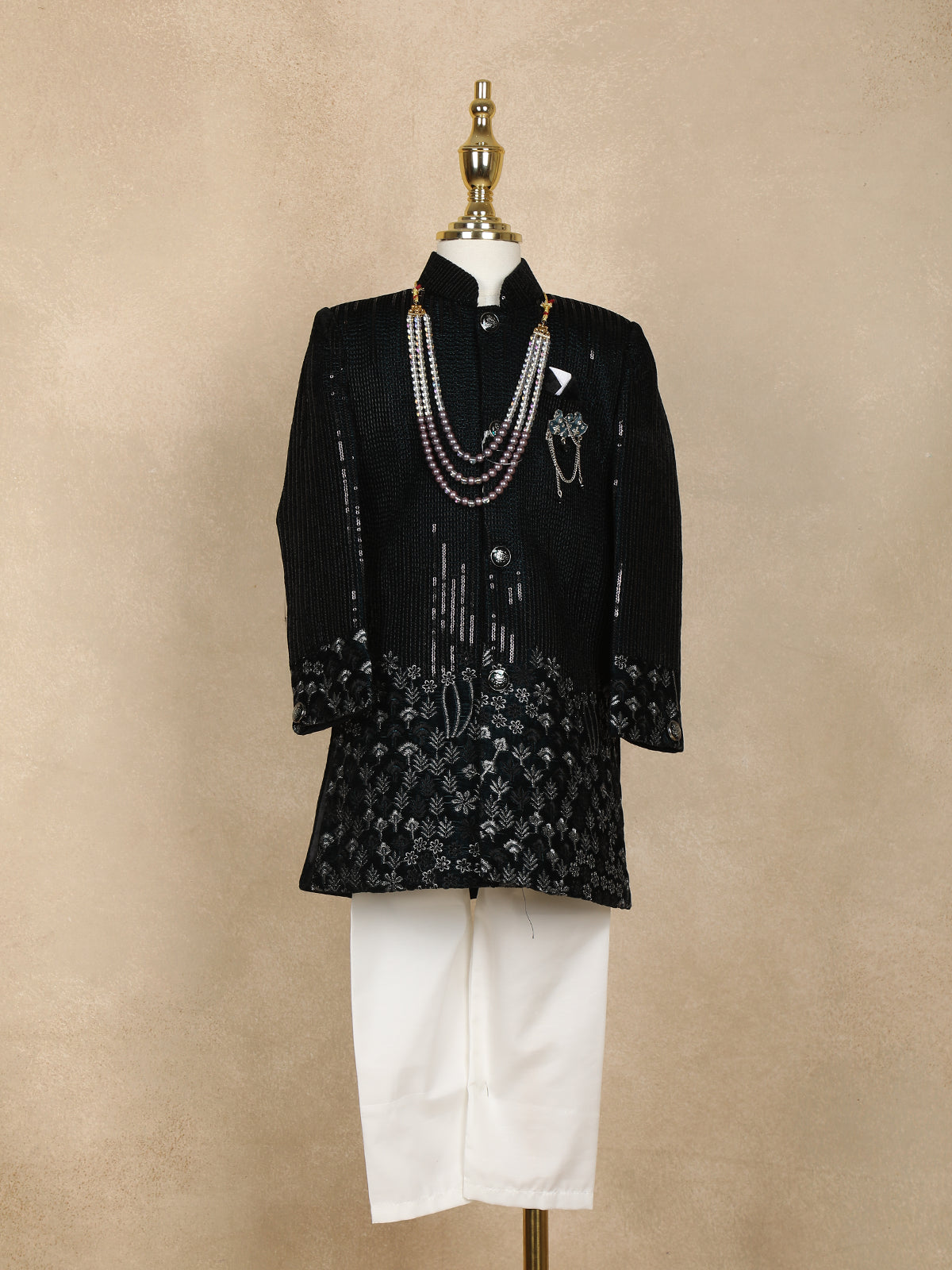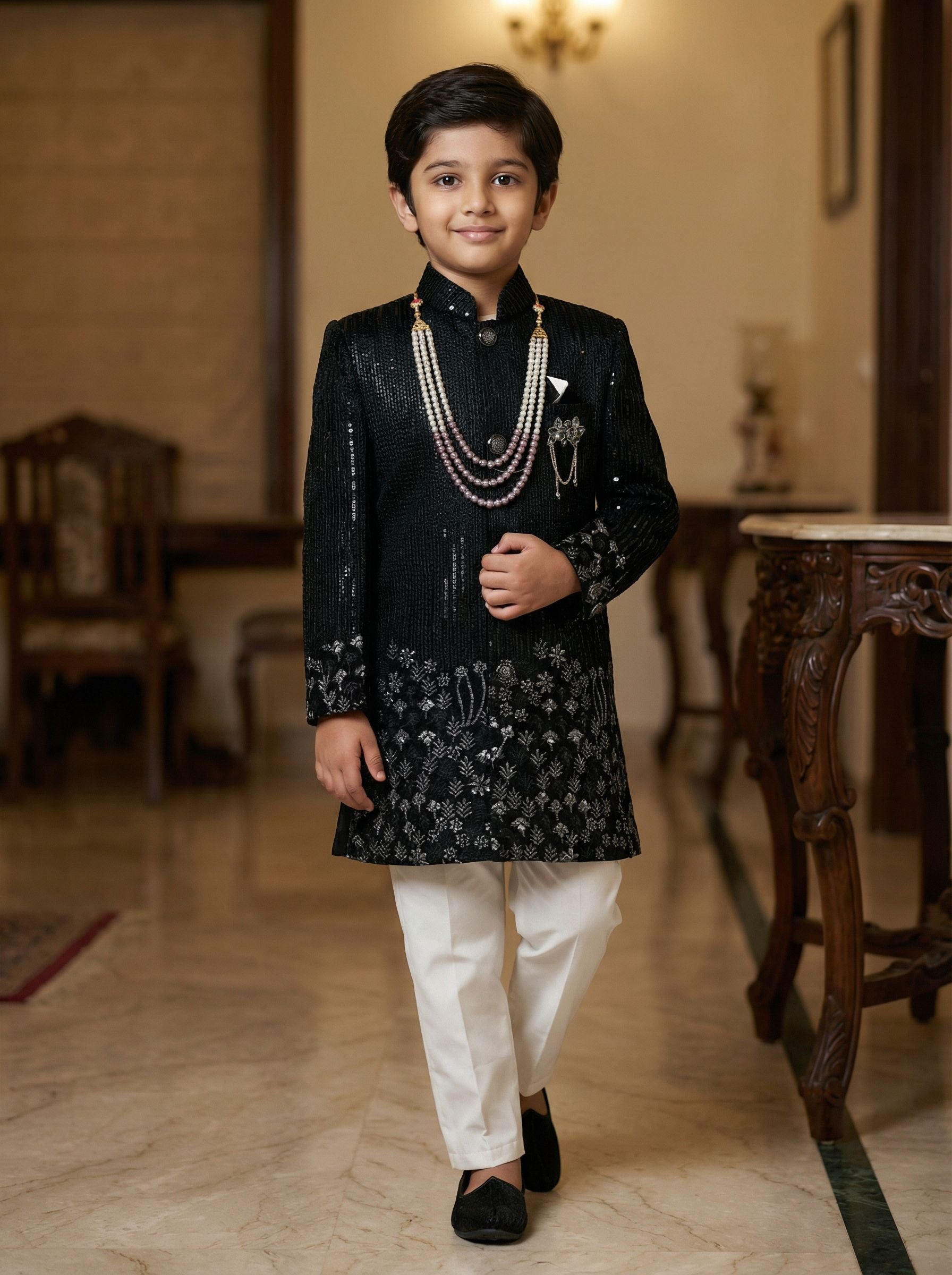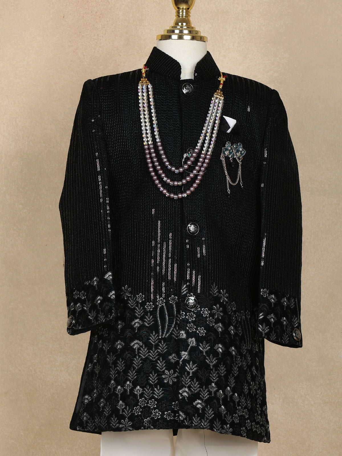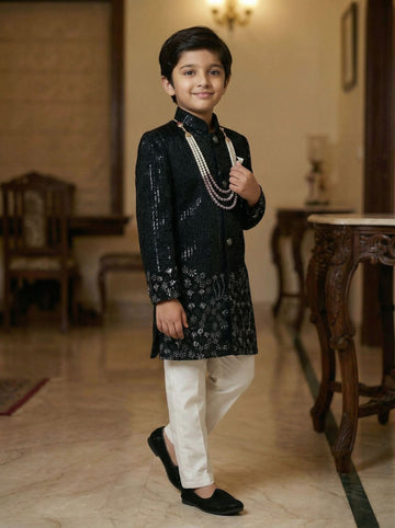 Dress your young gentleman in timeless elegance with this navy blue sequins embroidered sherwani set. Designed with a charming floral-woven pattern and subtle sequin embellishments, the outfit brings together tradition and modern sophistication. Paired with crisp white pants, this ensemble is perfect for weddings, festive functions, and royal celebrations.