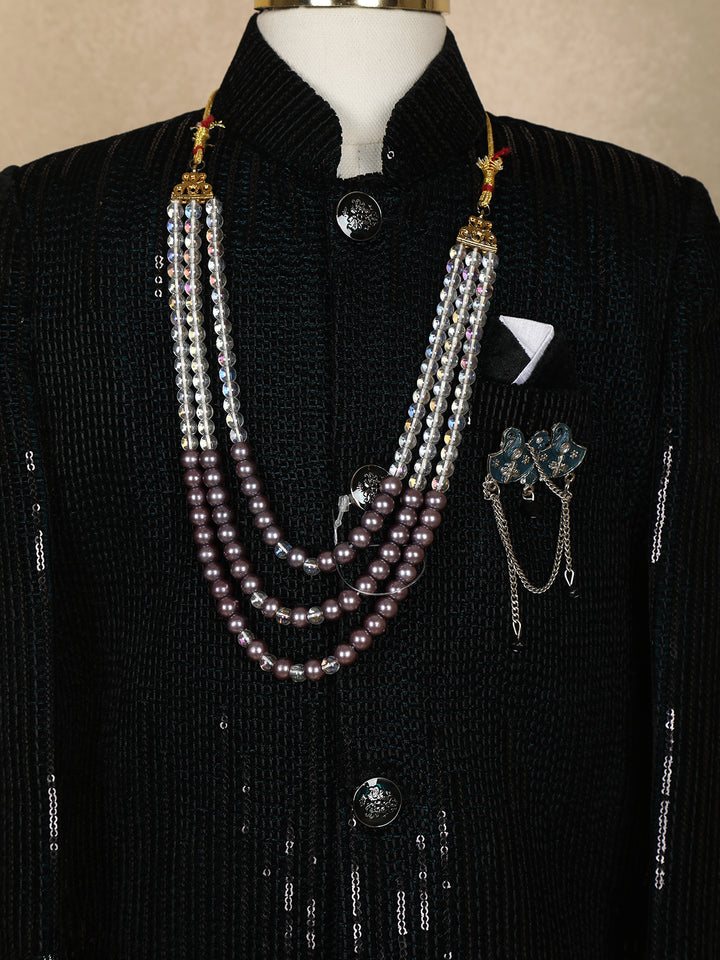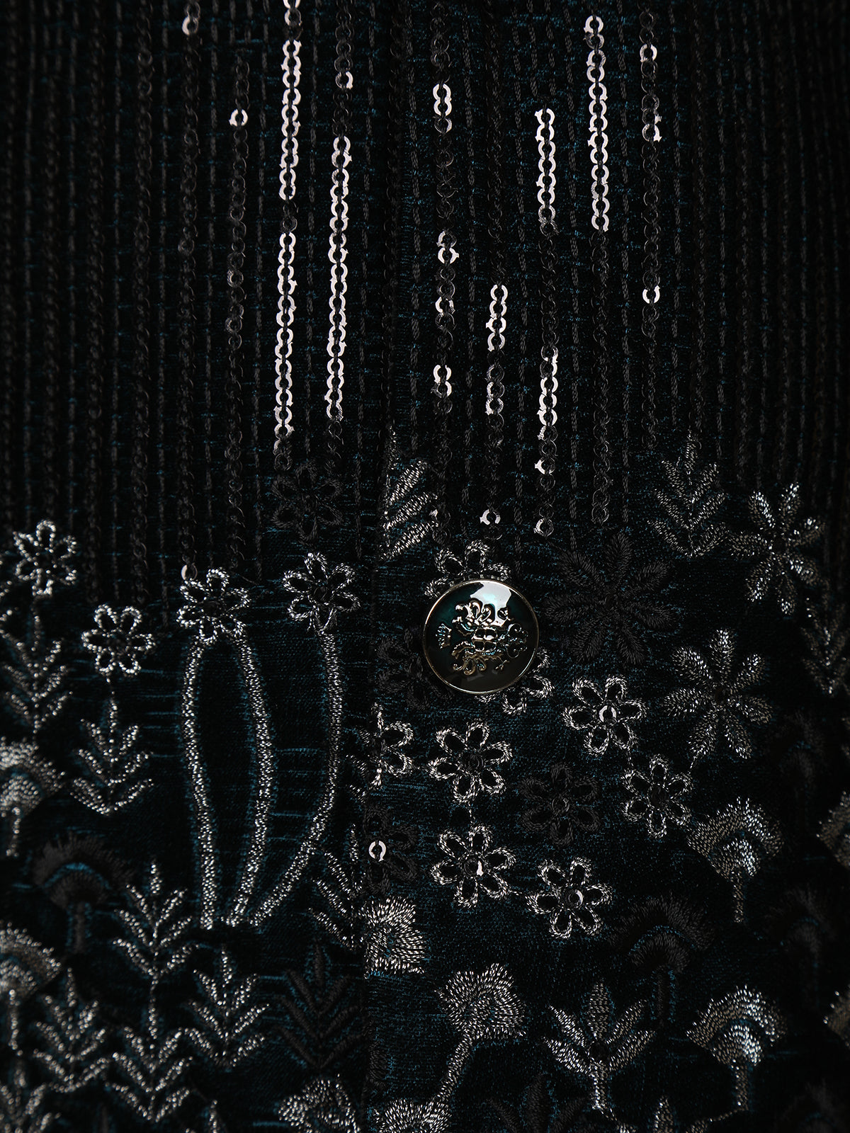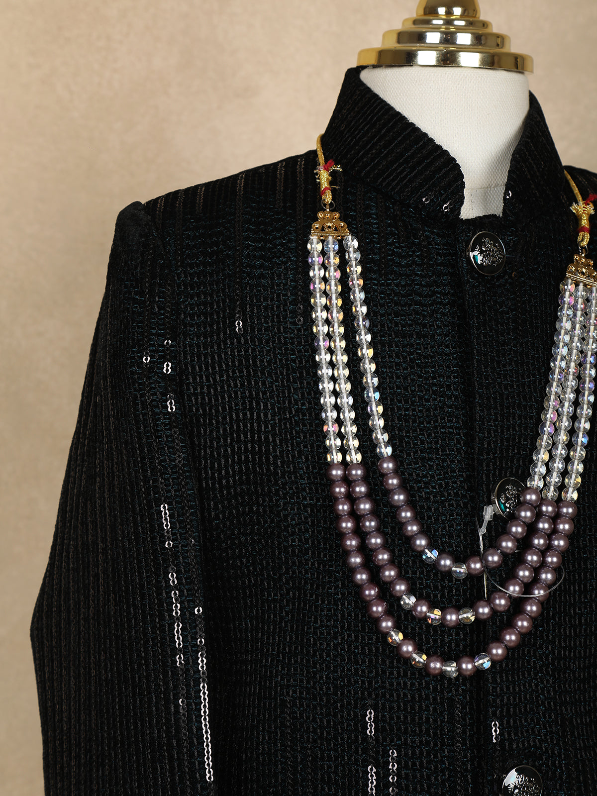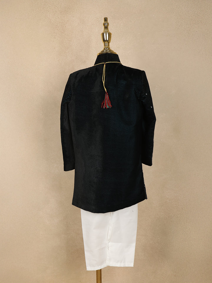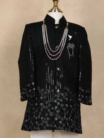 Dress your young gentleman in timeless elegance with this navy blue sequins embroidered sherwani set. Designed with a charming floral-woven pattern and subtle sequin embellishments, the outfit brings together tradition and modern sophistication. Paired with crisp white pants, this ensemble is perfect for weddings, festive functions, and royal celebrations.