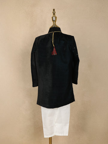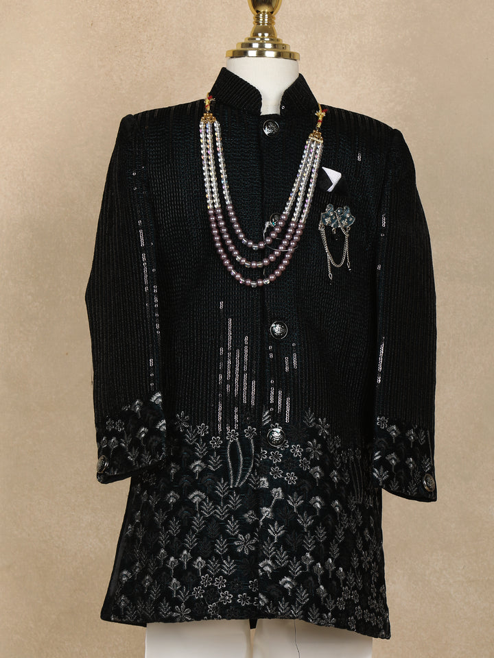 Navy Blue Floral Sequins Embroidered Velvet Kids Sherwani Set