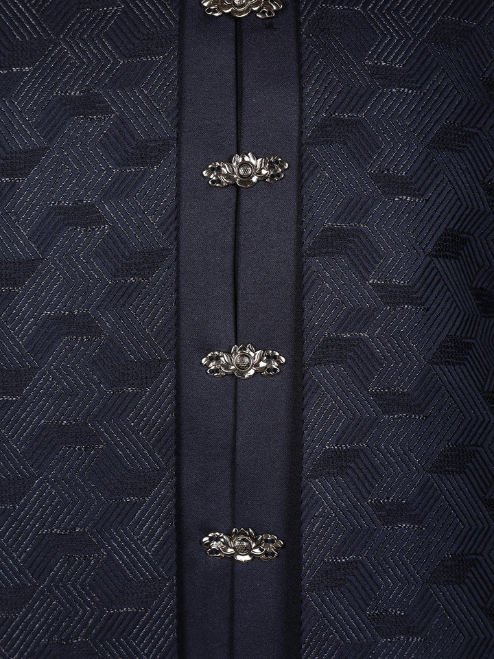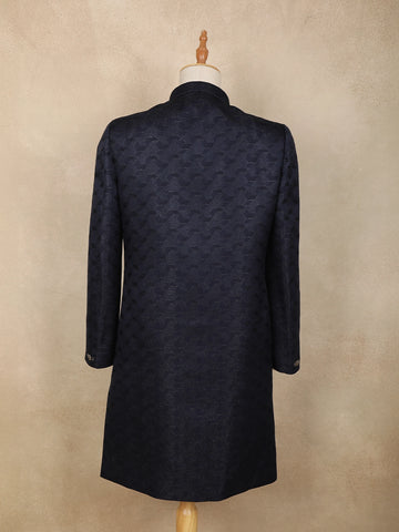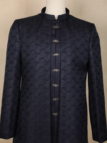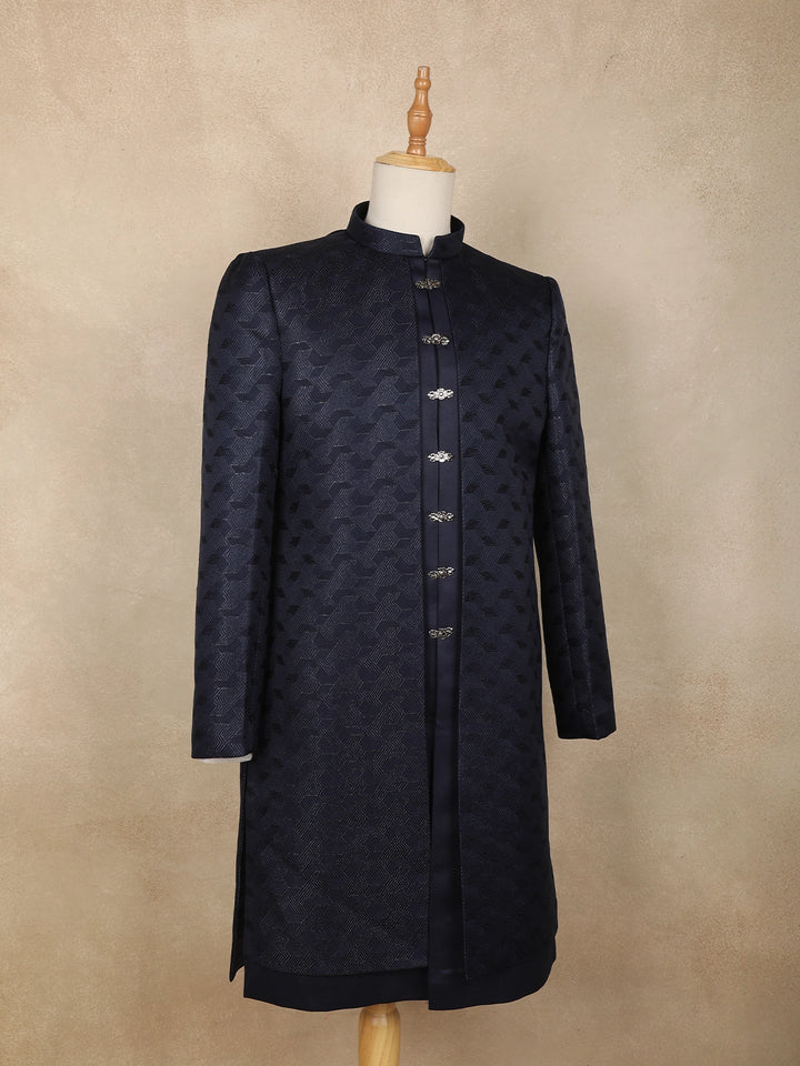 Navy Blue Geometric Design Polyester Sherwani Set