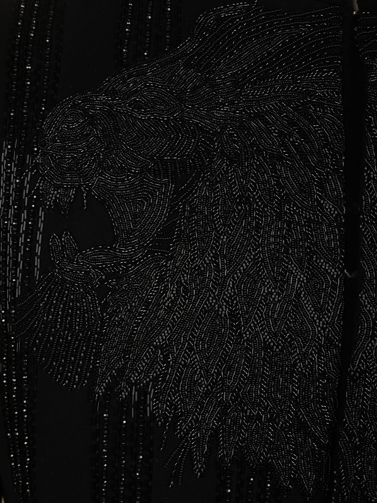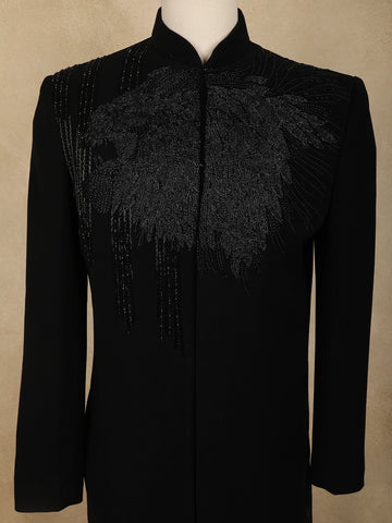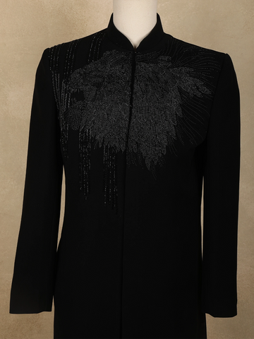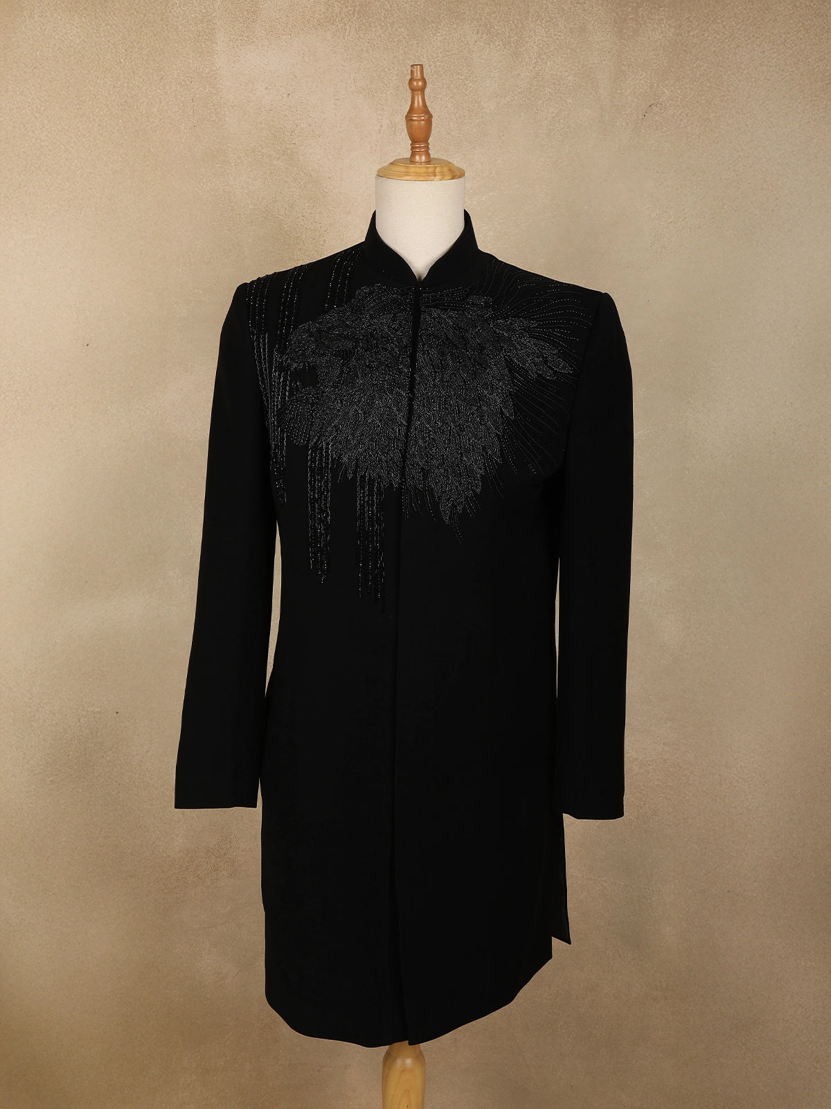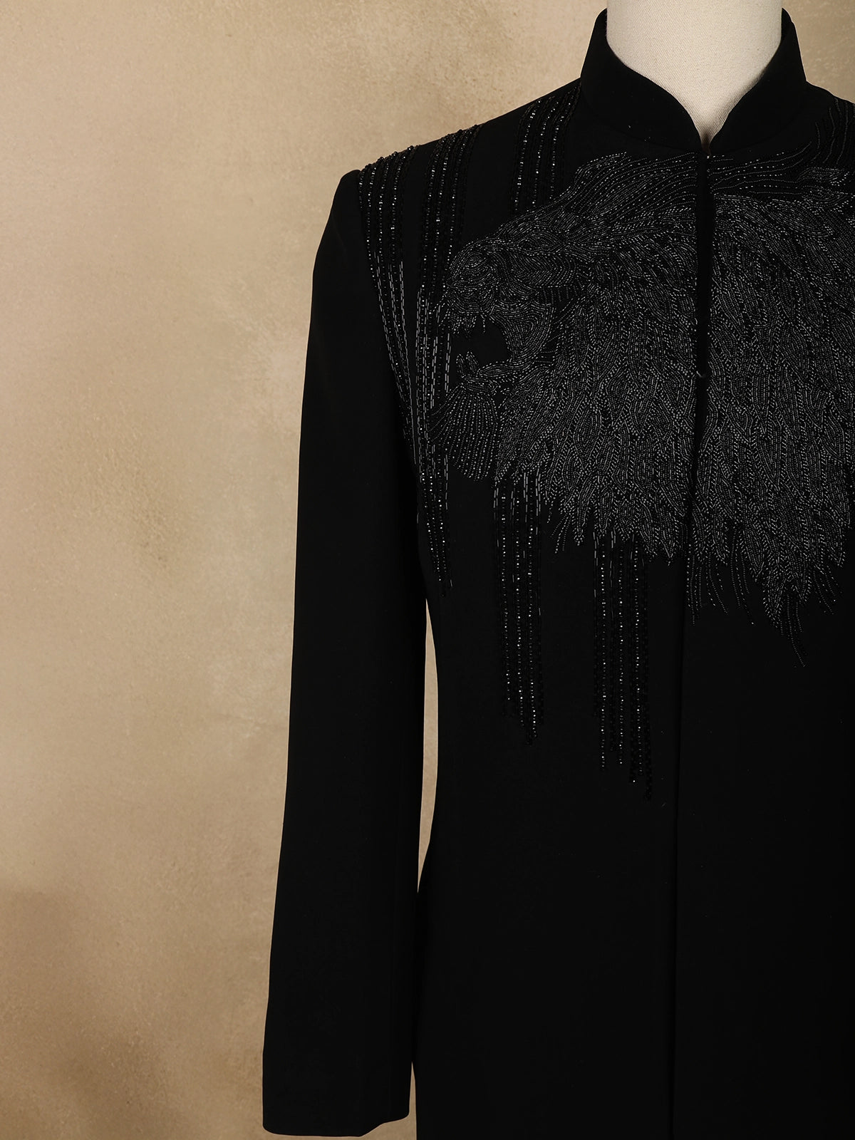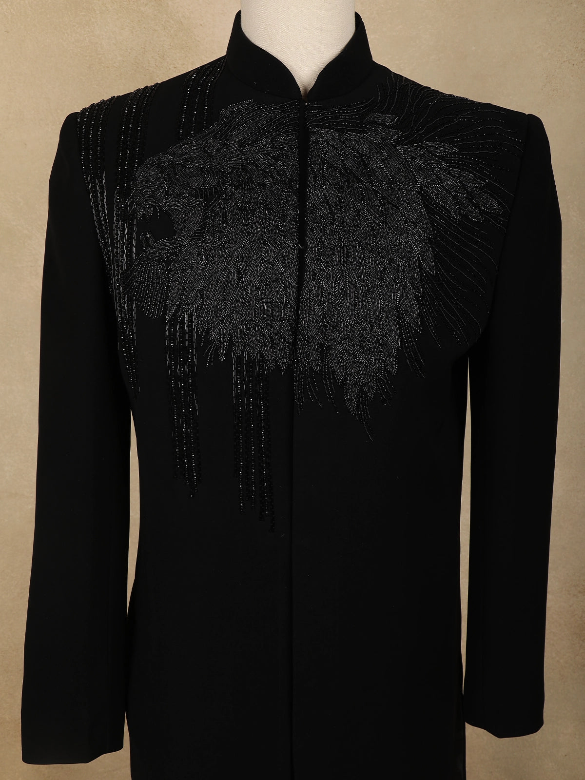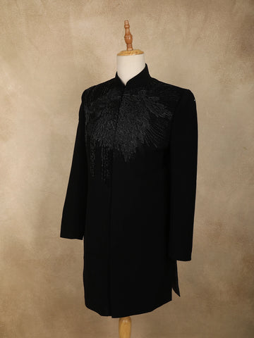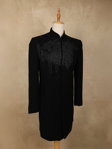 The sherwani is accentuated with silver beads embroidery arranged in an intricate, abstract branch-inspired pattern across the front, sleeves, and shoulders—creating a dynamic play of shimmer against the deep black base. The mandarin collar and sleek concealed placket lend a contemporary edge, while matching buttons add to its regal charm.