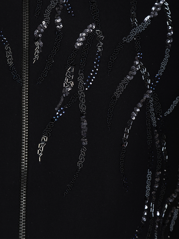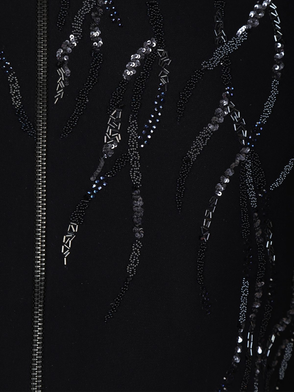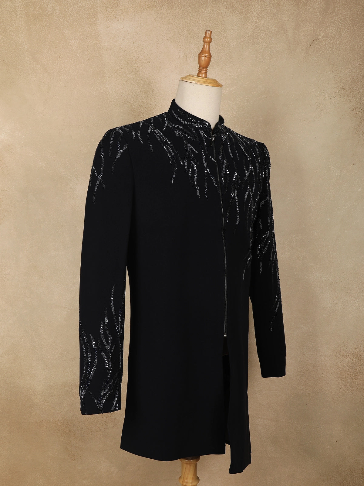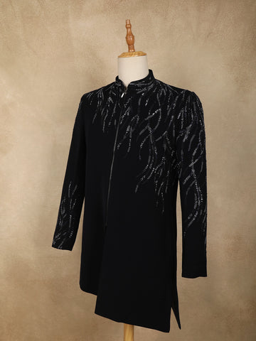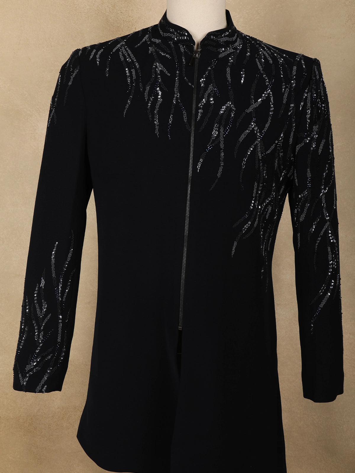 The sherwani is accentuated with silver sequin embroidery arranged in an intricate, abstract branch-inspired pattern across the front, sleeves, and shoulders—creating a dynamic play of shimmer against the deep black base. The mandarin collar and sleek concealed placket lend a contemporary edge, while matching buttons add to its regal charm.