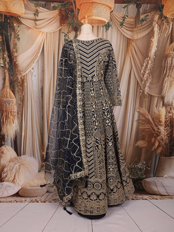The matching net dupatta with its embroidered border completes the ensemble with graceful finesse, offering the perfect balance of glamour and poise.