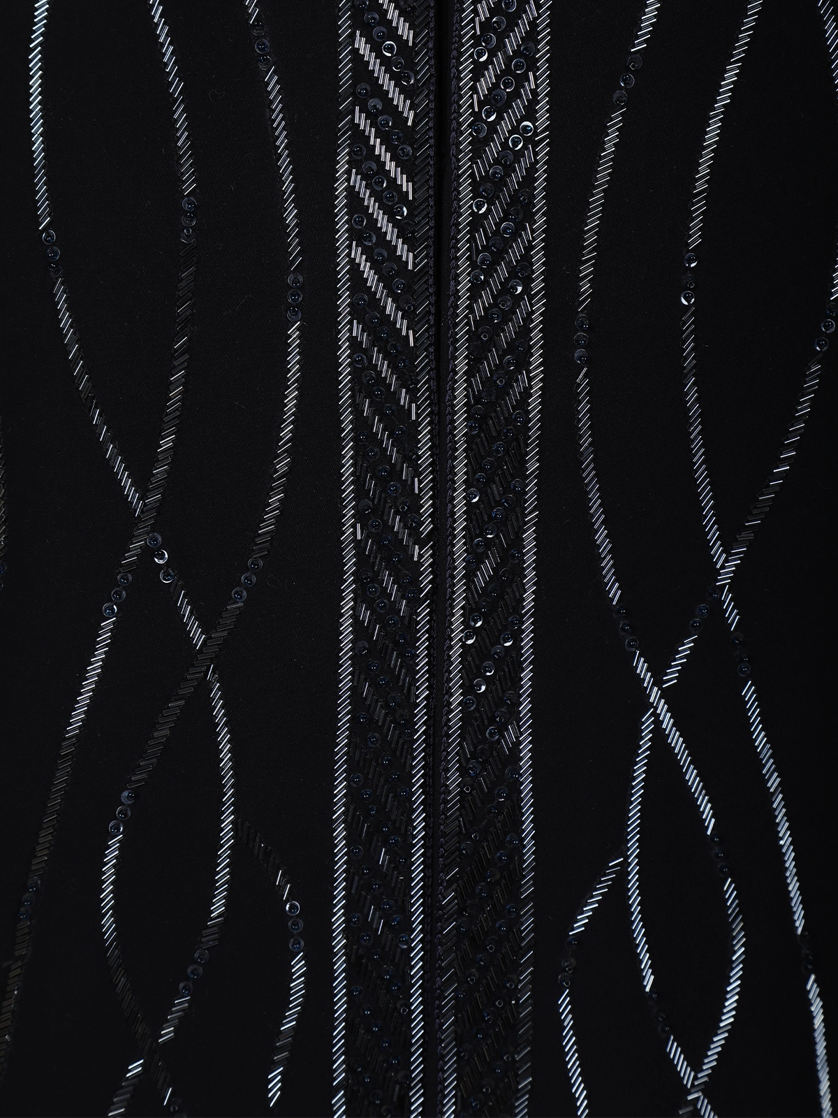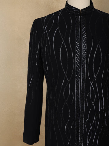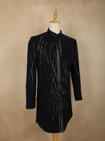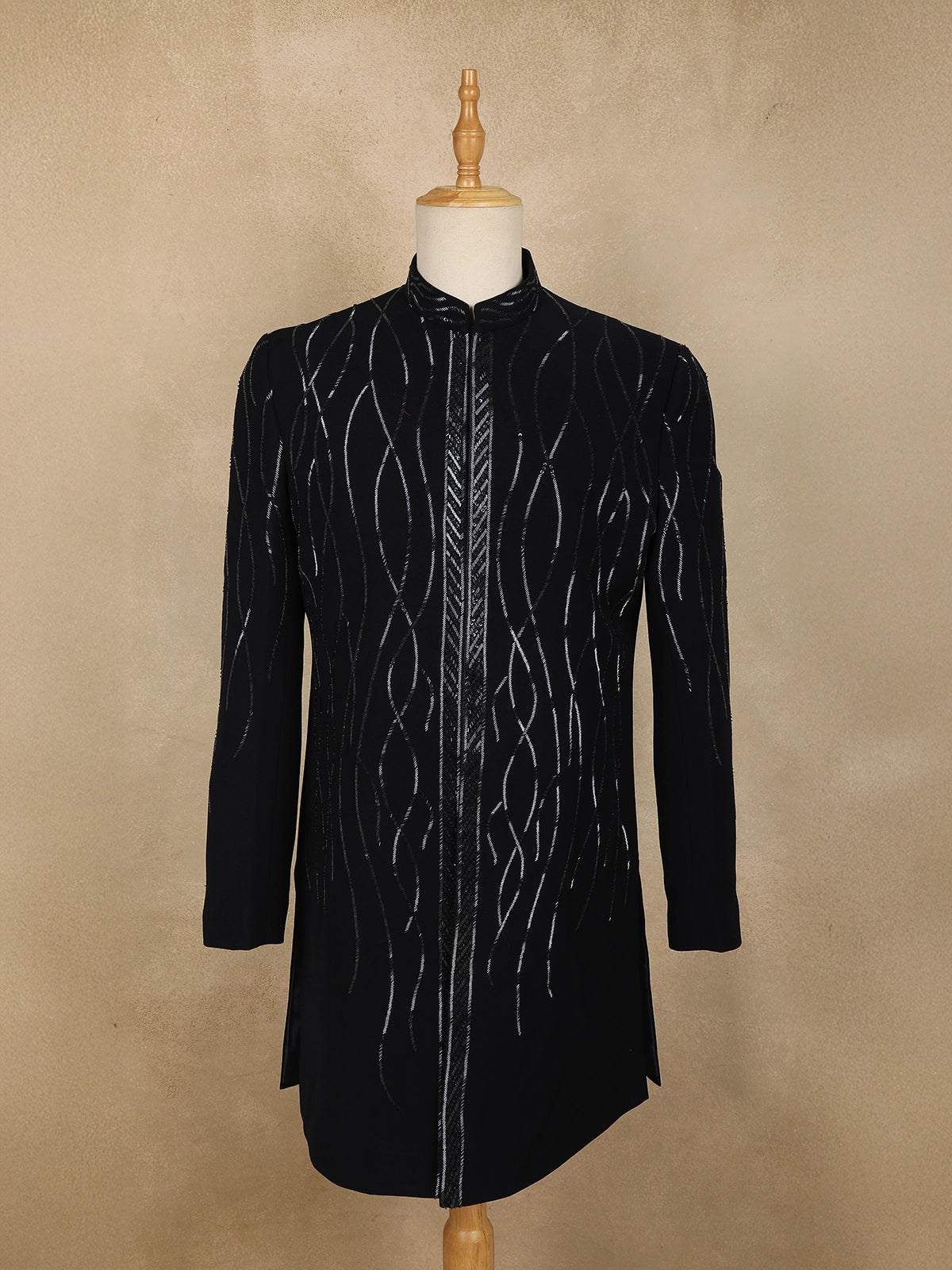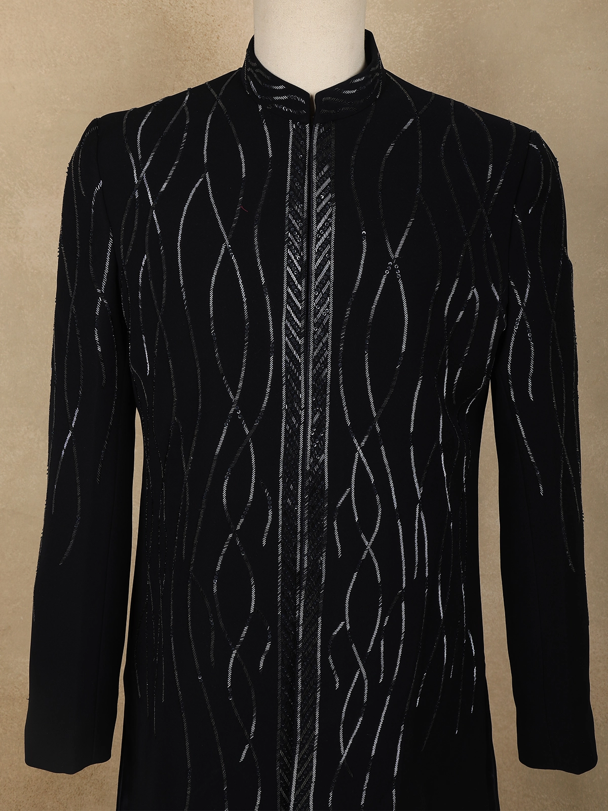 The sherwani is accentuated with silver sequin embroidery arranged in an intricate, abstract branch-inspired pattern across the front, sleeves, and shoulders—creating a dynamic play of shimmer against the deep black base. The mandarin collar and sleek concealed placket lend a contemporary edge, while matching buttons add to its regal charm.