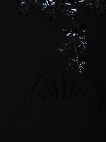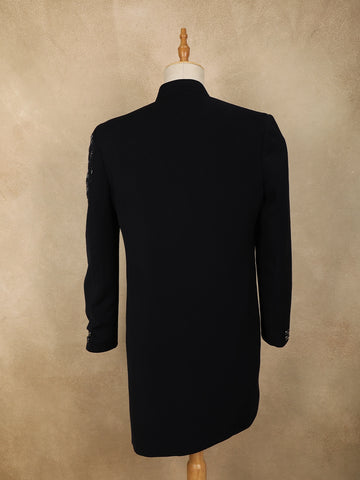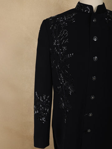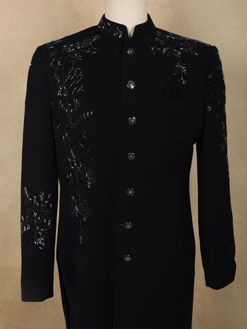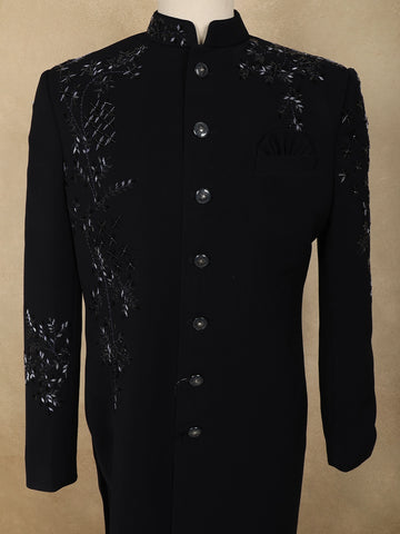 The sherwani is accentuated with silver beads embroidery arranged in an intricate, abstract branch-inspired pattern across the front, sleeves, and shoulders—creating a dynamic play of shimmer against the deep black base. The mandarin collar and sleek concealed placket lend a contemporary edge, while matching buttons add to its regal charm.