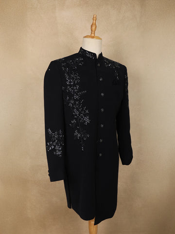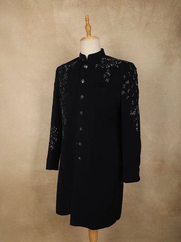 Navy Blue Heavy Beads Embroidered Design Polynosic Indo Western Men's Sherwani Suit with Unstitched Pant