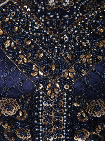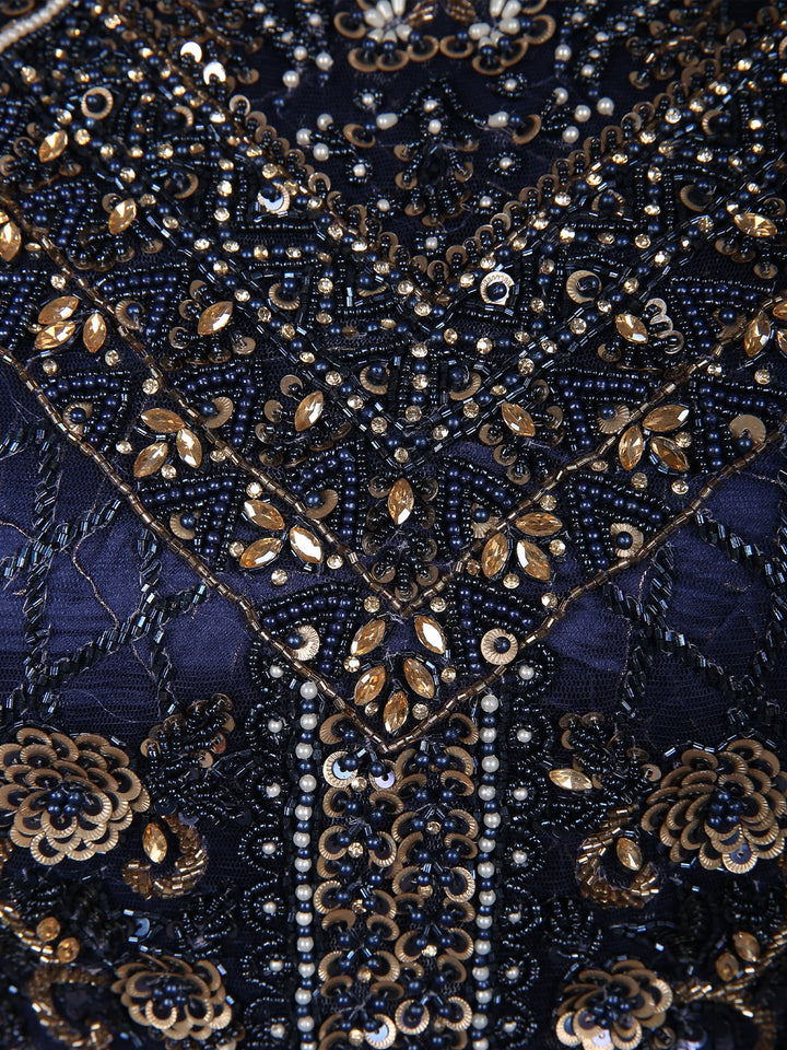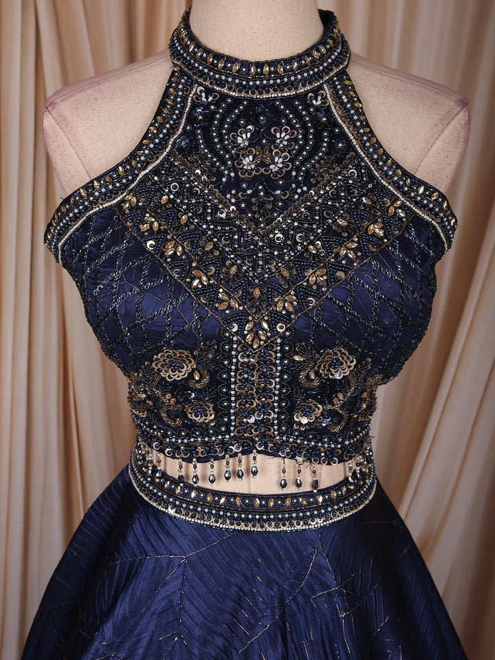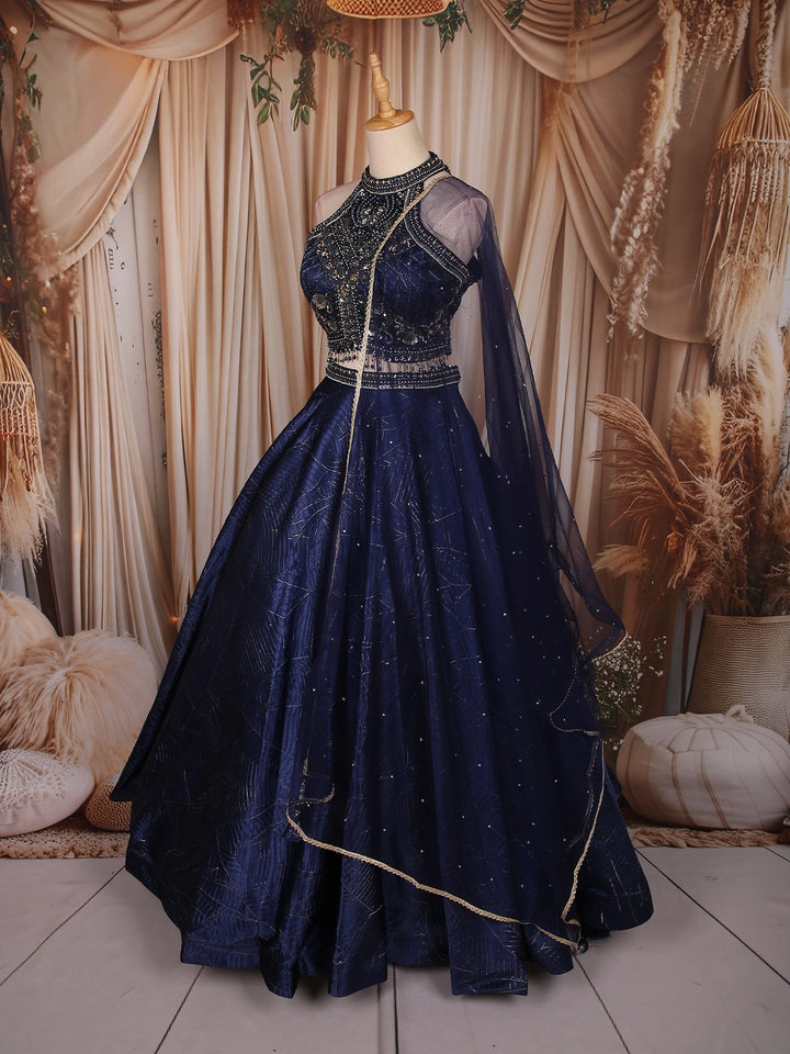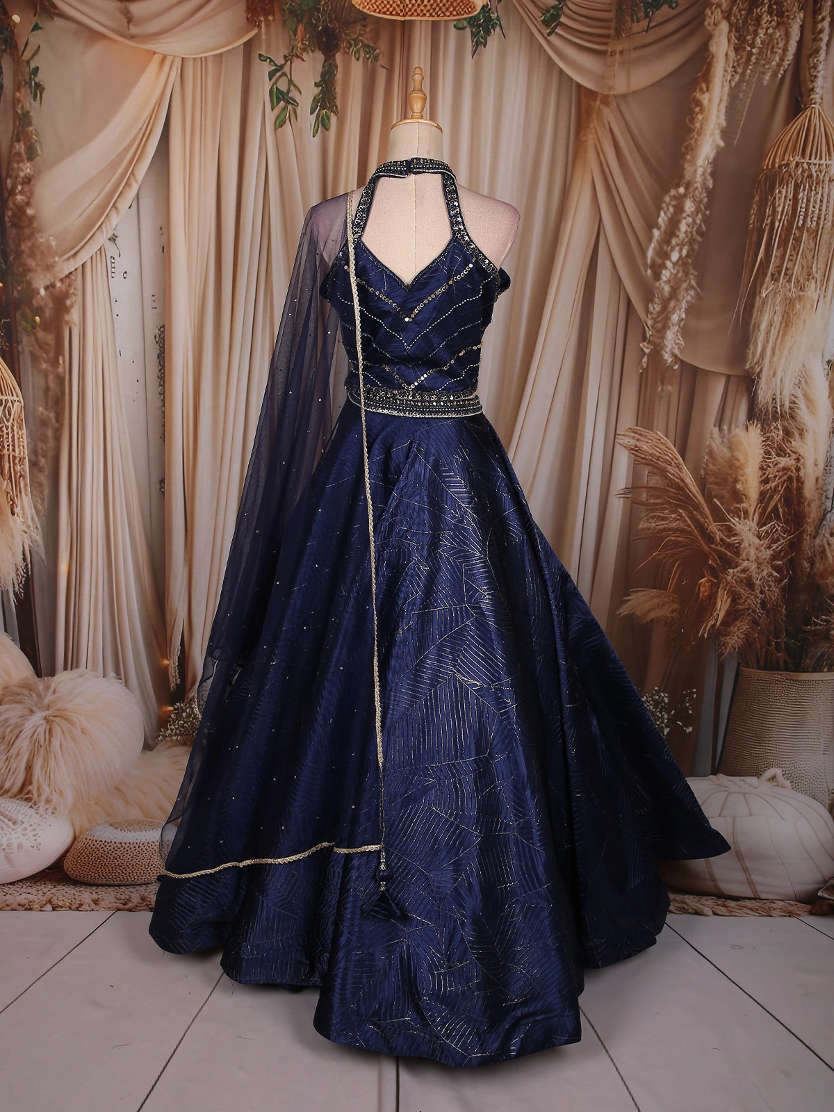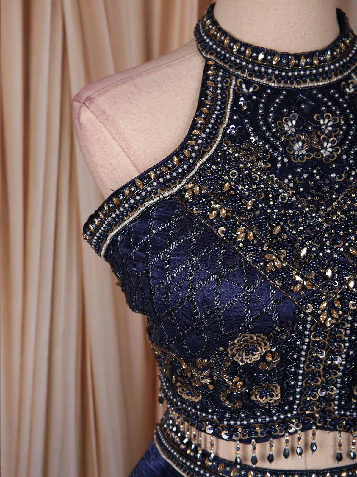 Steal the spotlight with this Navy Blue Silk Lehenga Set, a stunning fusion of traditional grandeur and modern elegance. The ensemble features a heavily sequins and bead embroidered halter-neck blouse, beautifully adorned with intricate detailing and shimmering embellishments that exude luxury and sophistication.