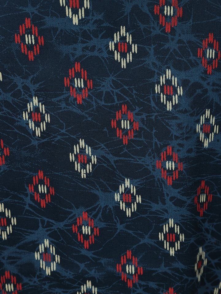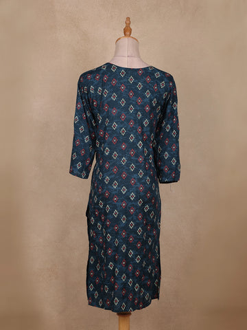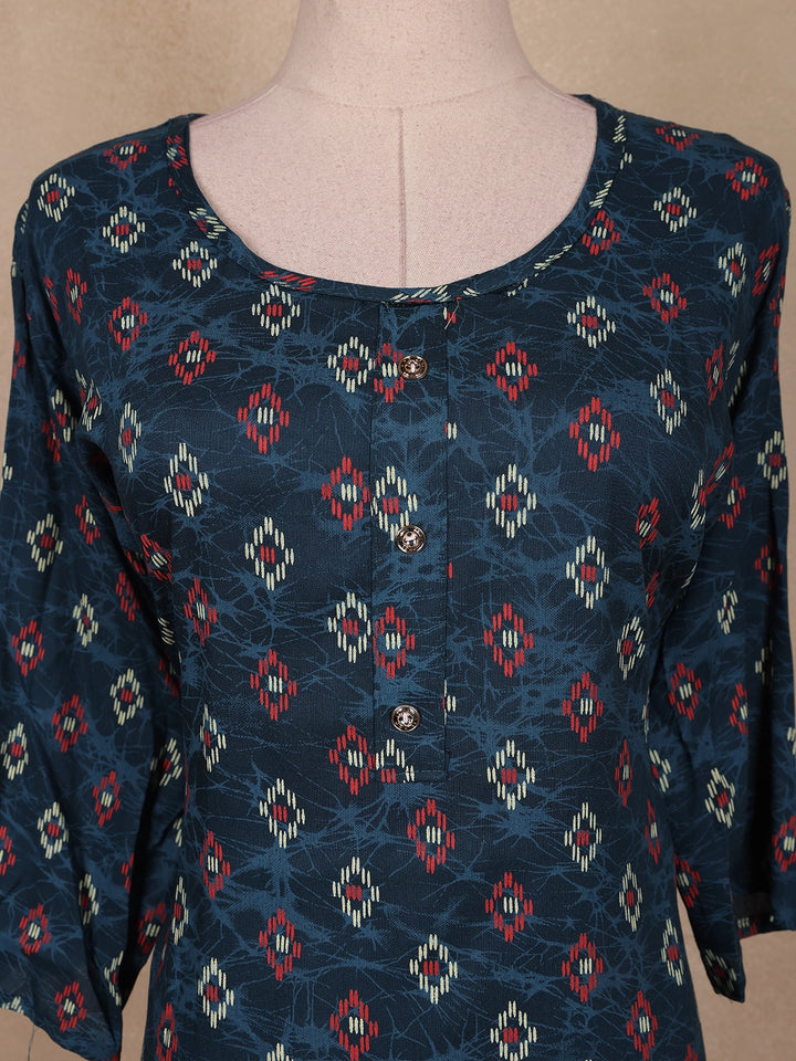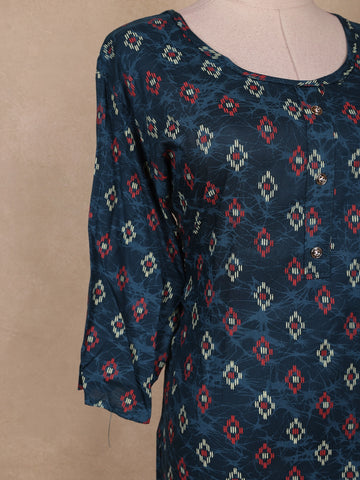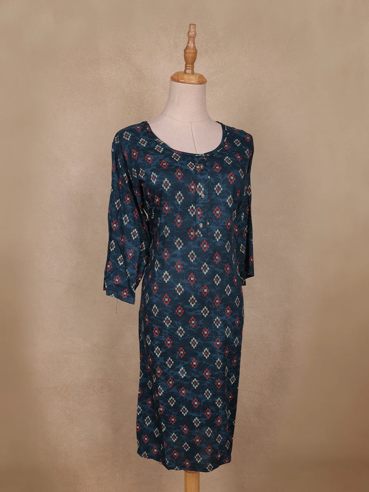 Elevate your everyday look with this Navy Blue Ikat Printed Cotton Kurti, designed in a straight-cut silhouette for effortless style and comfort. The kurti features traditional Ikat motifs in red and beige hues on a deep navy base, giving it a refined ethnic appeal. Crafted from breathable cotton, it ensures ease of wear throughout the day. The round neckline with button detailing and 3/4 sleeves add a touch of simplicity and grace, making it perfect for casual outings, office wear, or relaxed festive gatherings.