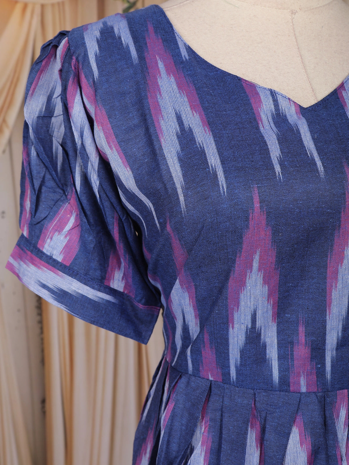 The design features a fit-and-flare silhouette with a gathered waistline that adds gentle volume and flow. The all-over Ikat weave pattern in soft blue and ivory tones brings a serene and refreshing vibe. The round neckline paired with puffed half sleeves and turned-up cuffs lends a youthful, contemporary edge. A subtle tiered detailing near the hemline adds texture and movement, making this kurti an ideal choice for casual days, work wear, or relaxed weekend outings.