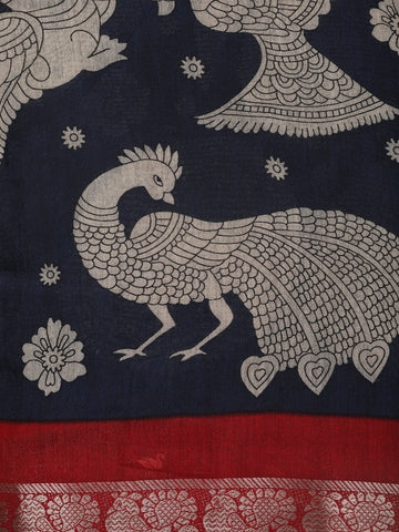 Navy Blue Kalamkari Peacock Printed Chanderi Cotton Saree with Maroon Zari Border