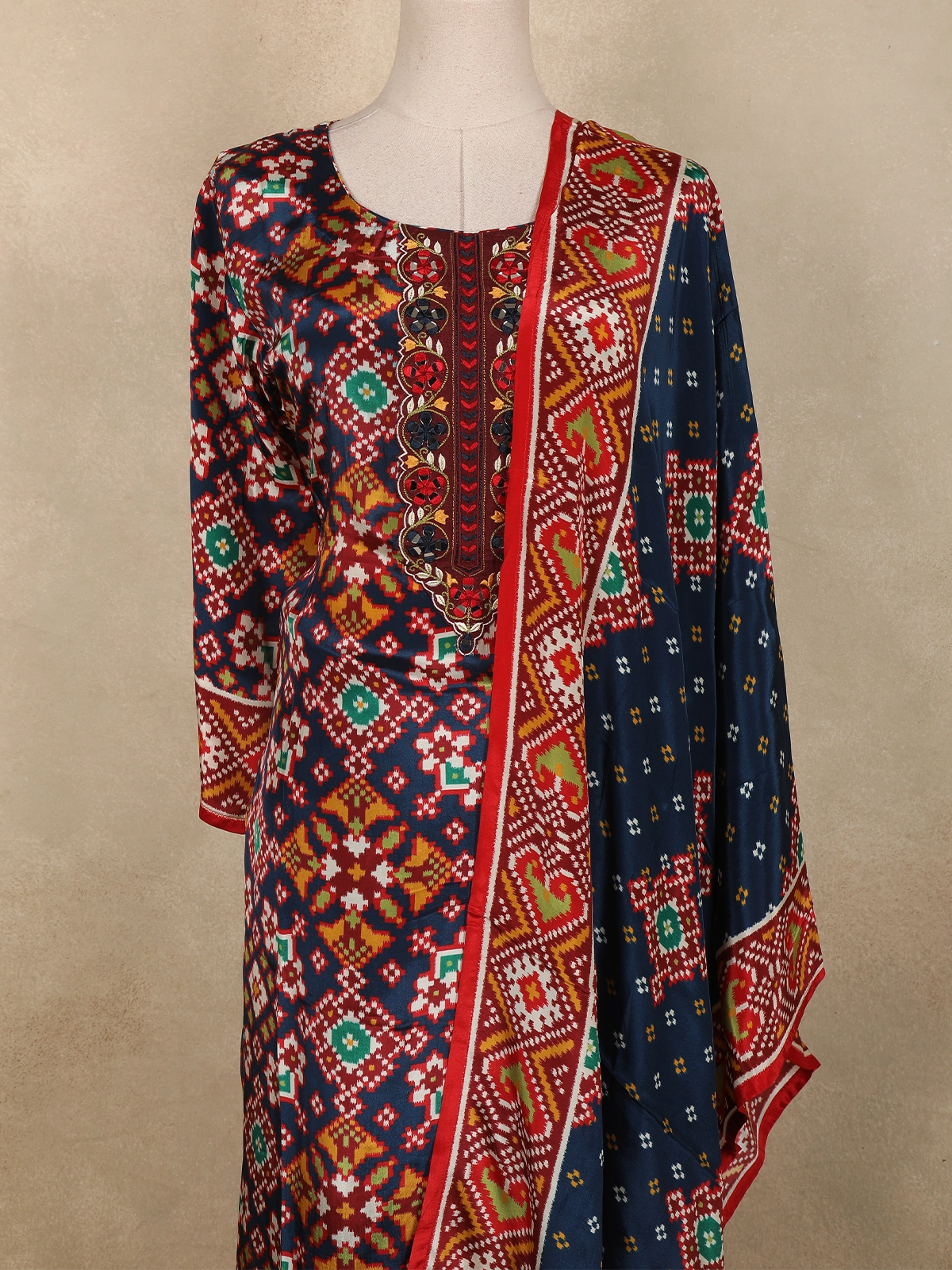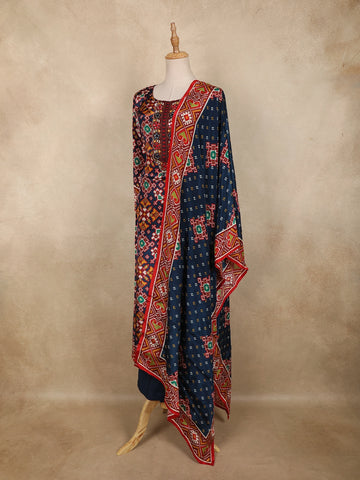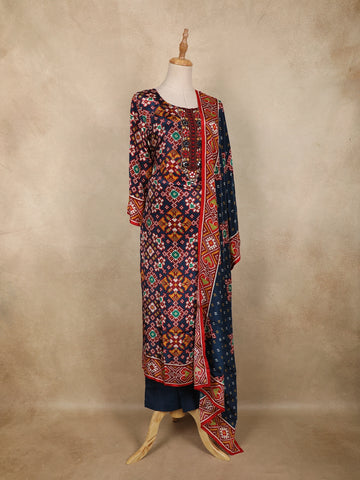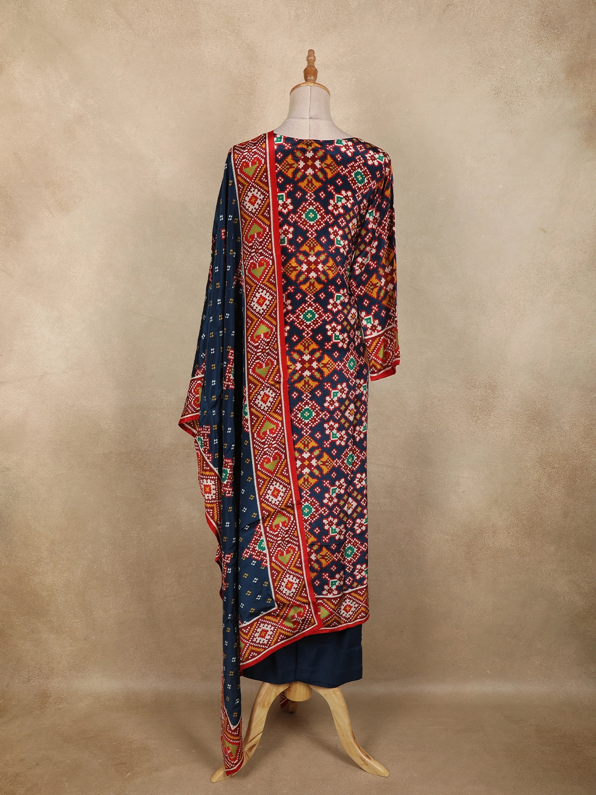 Navy Blue Multicolor Ikat Printed Crepe Salwar Suit with Dupatta