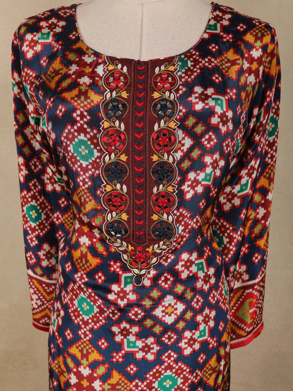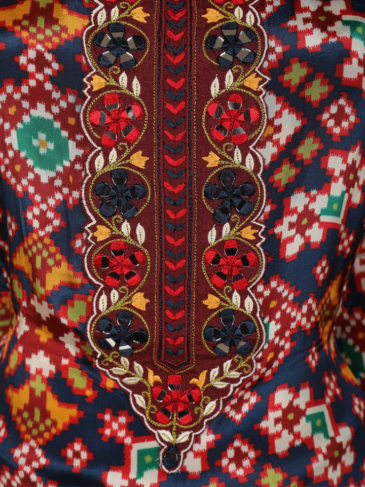 Make a bold statement with this vibrant navy blue crepe salwar suit featuring a traditional Ikat-inspired multicolor print. The kurta is detailed with intricate thread and mirror work motifs along the neckline, adding a festive charm to the outfit. Paired with solid matching bottoms and a printed dupatta with striking geometric borders, this suit offers a perfect blend of culture and elegance. Ideal for festive celebrations, family gatherings, and casual ethnic styling