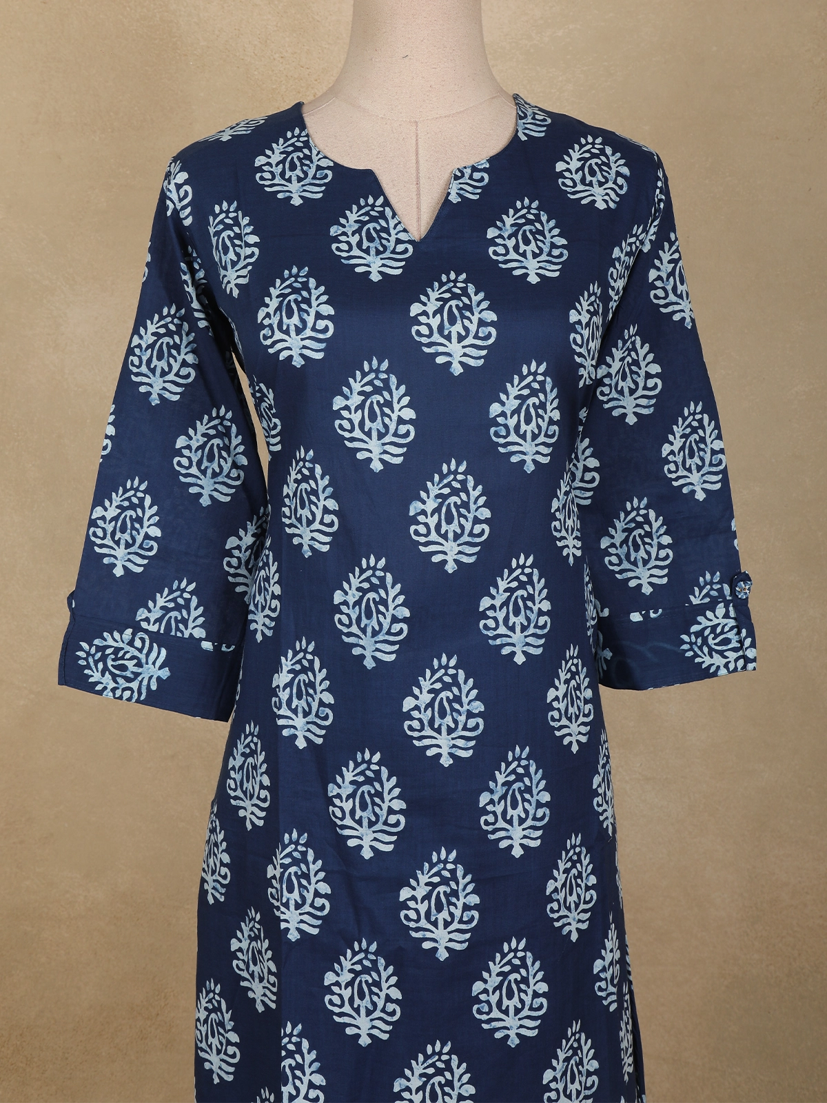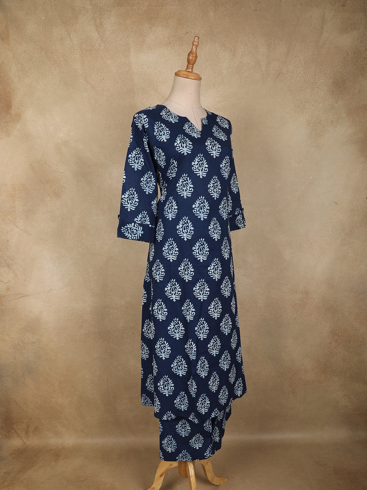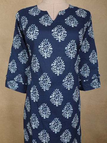 The kurta features a deep navy blue base adorned with classic white paisley butta prints, lending a timeless and sophisticated appeal. Designed in a straight silhouette with a clean notch neckline and three-quarter sleeves, it offers a flattering fit suitable for daily wear. The matching bottom complements the kurta with the same paisley motif, creating a coordinated and seamless ethnic ensemble.