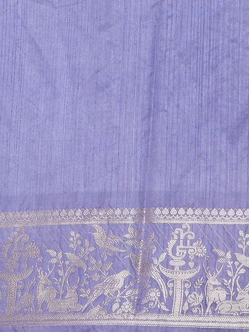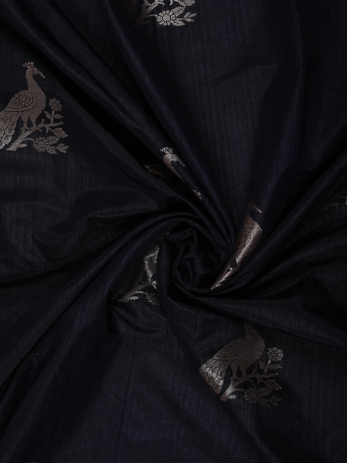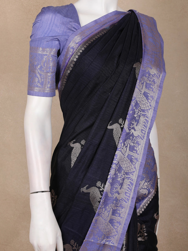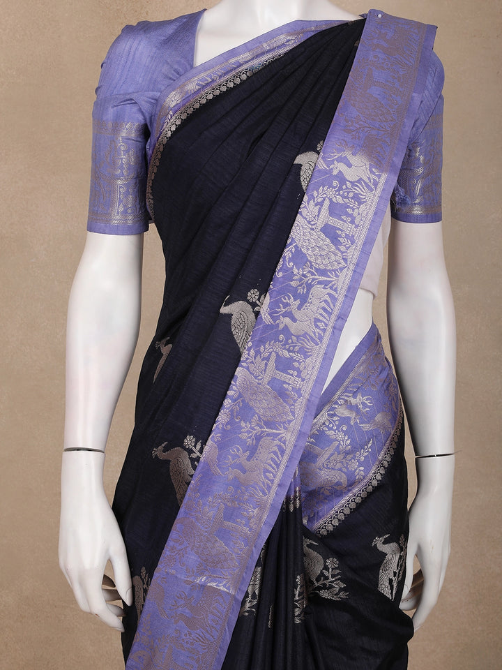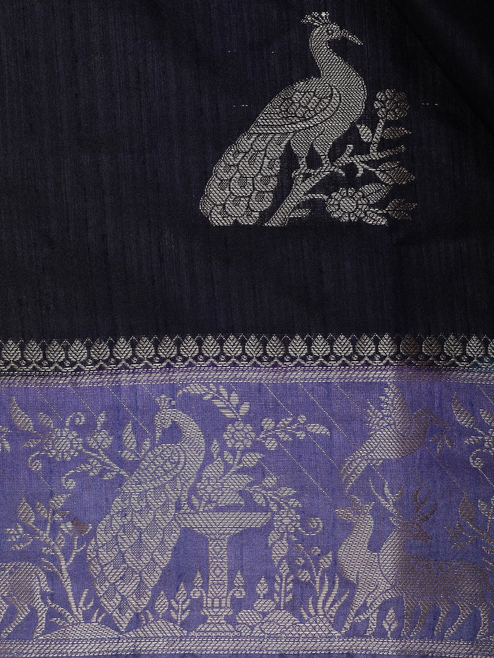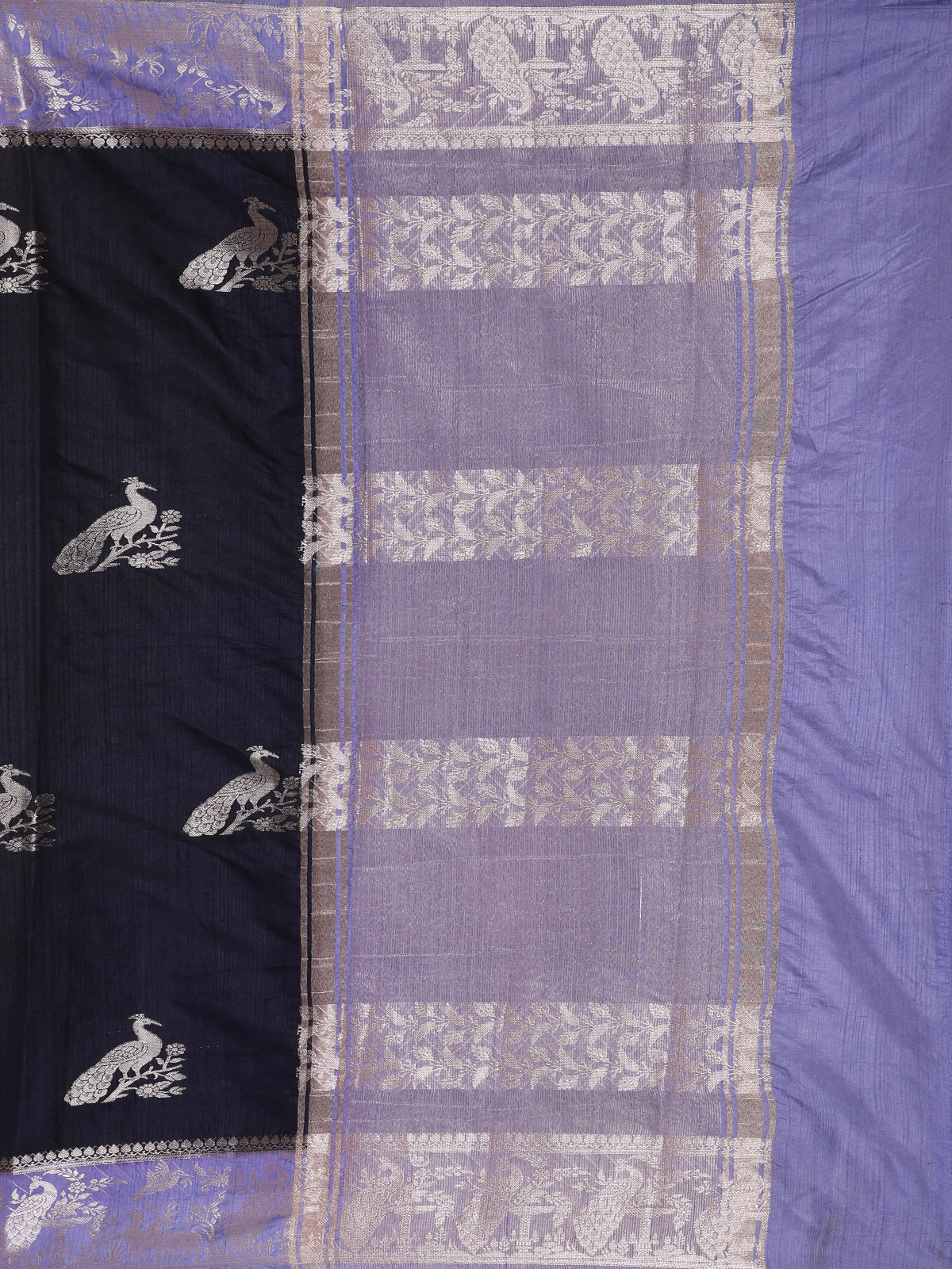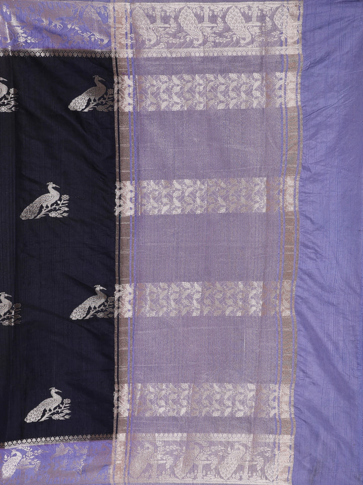 Navy Blue Peacock Woven Raw Silk Saree with Contrast Lavender Zari Border